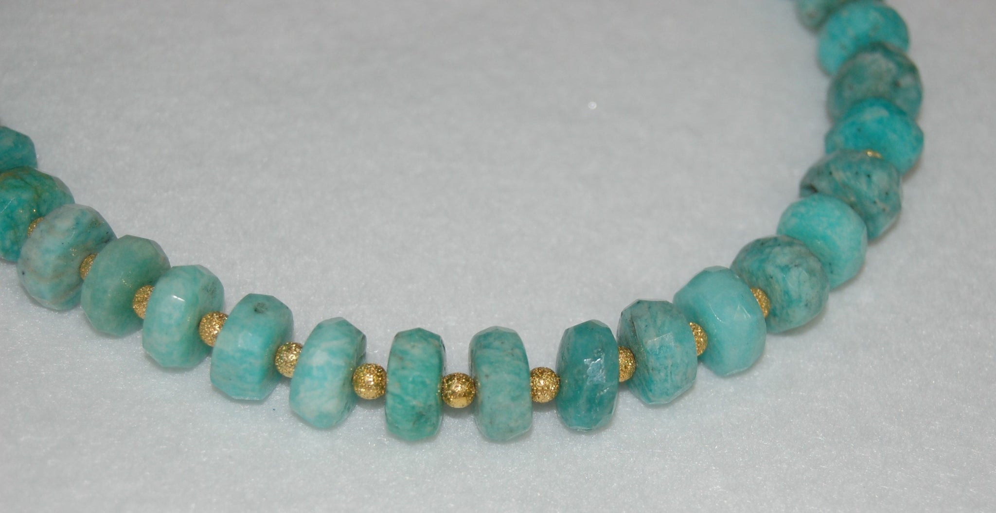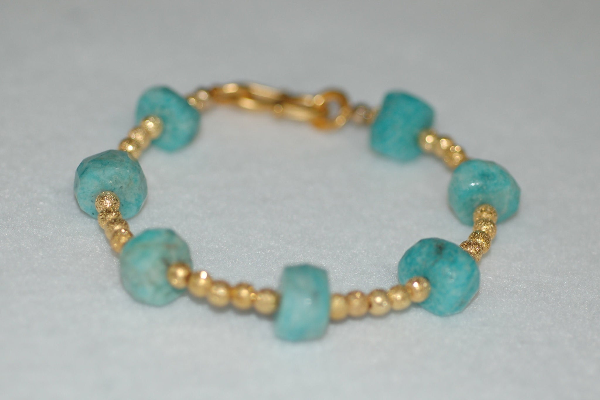 Rough faceted amazonite rondels are set apart by gold plated stardust beads to create a classic silhouette for your neck and wrist. These two pieces will remind you of treasures from antiquity and will make you stand out from the crowd. Gold plated hardware. Necklace approx 17” long, Bracelet approx 8” long