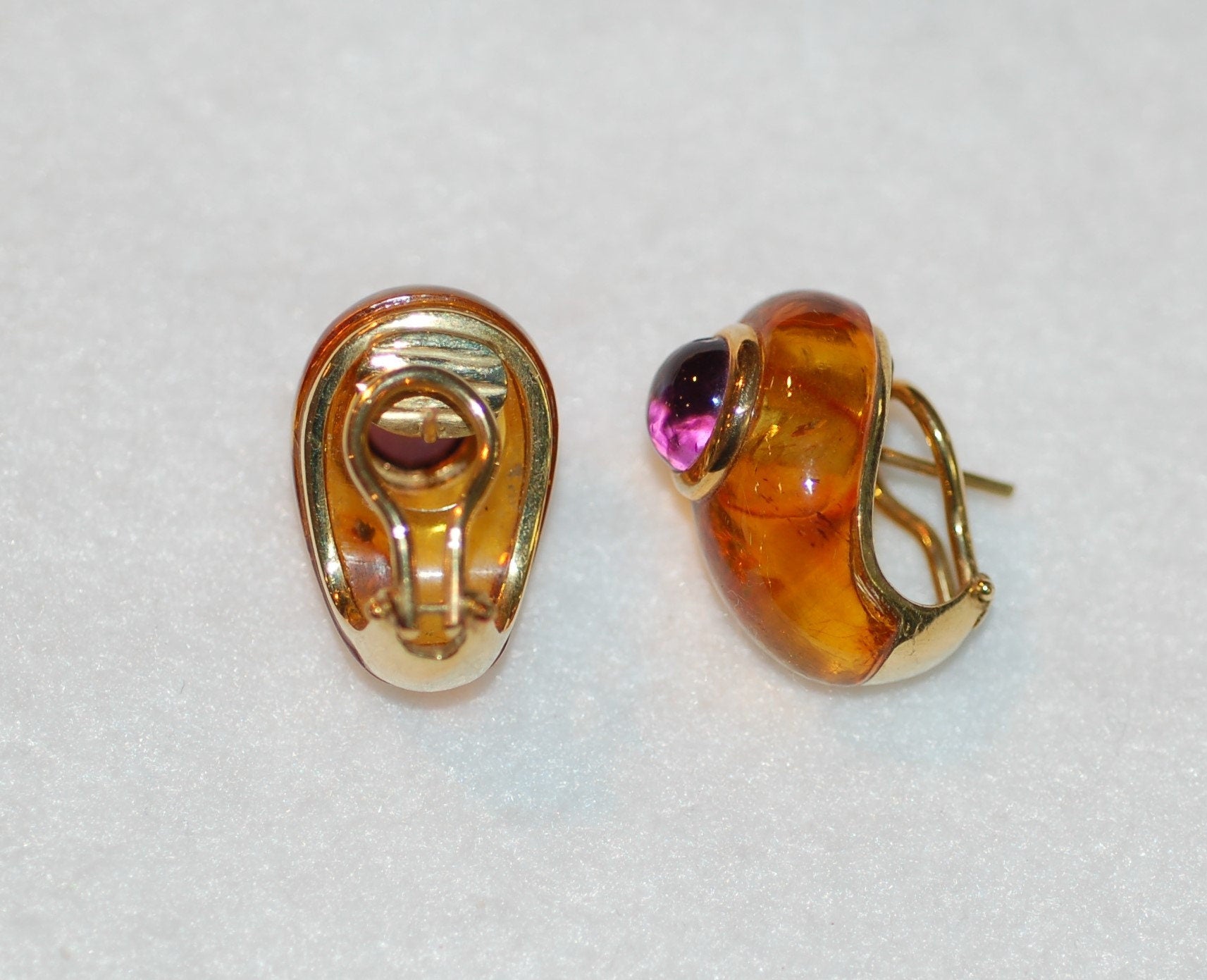 Beautifully carved large natural amber piece is set with an amethyst cabochon in the center. The heavy omega clip back give the earrings stability when wearing. A very unique and one of a kind look! 18k yellow gold, amber, amethyst. handmade in Italy