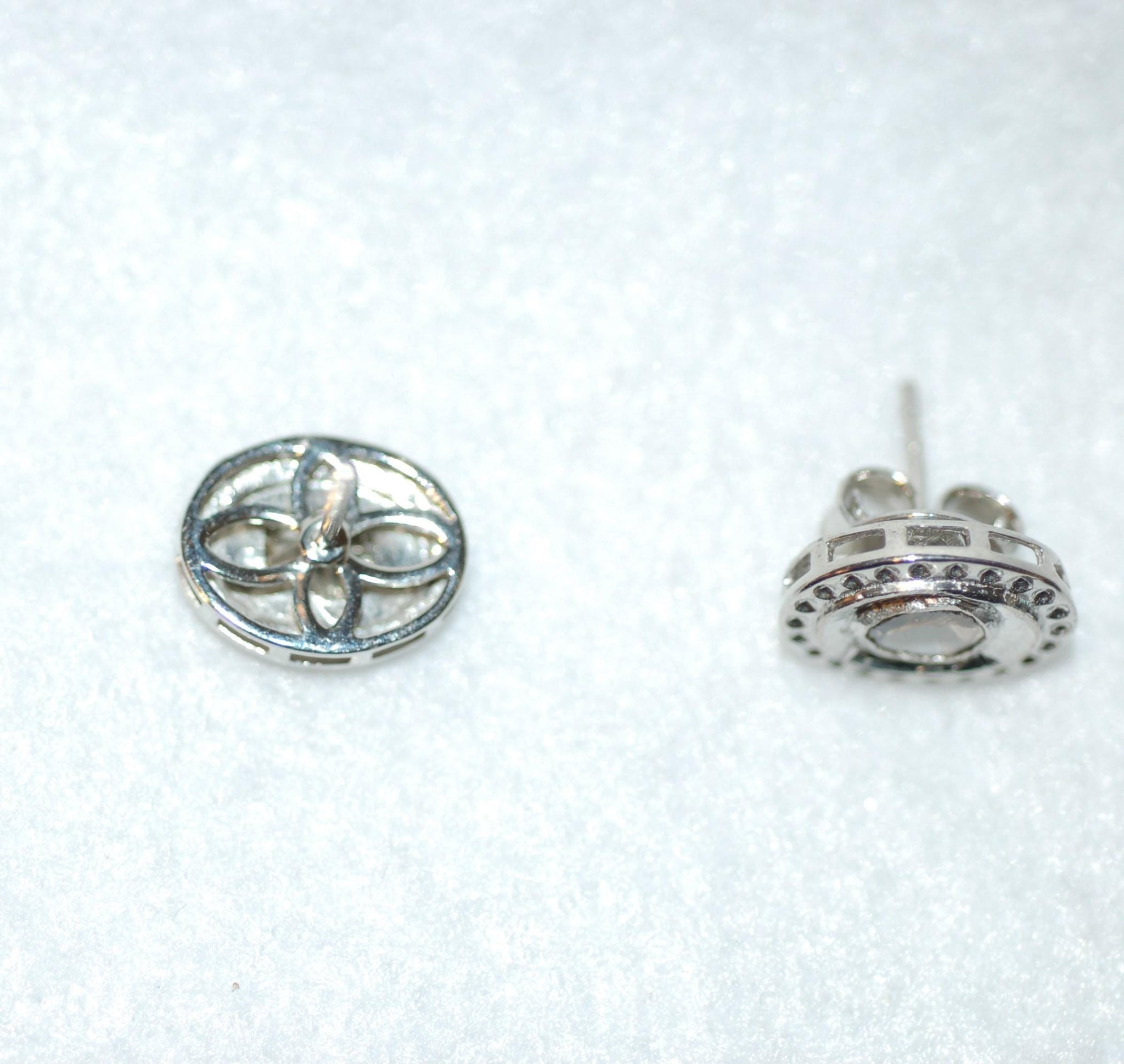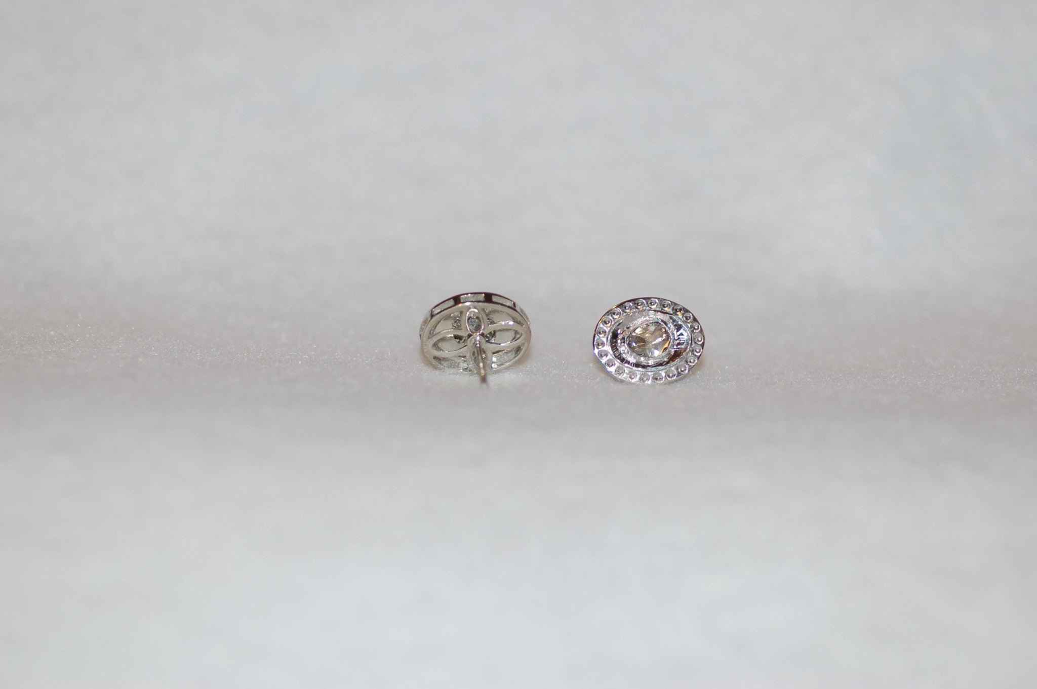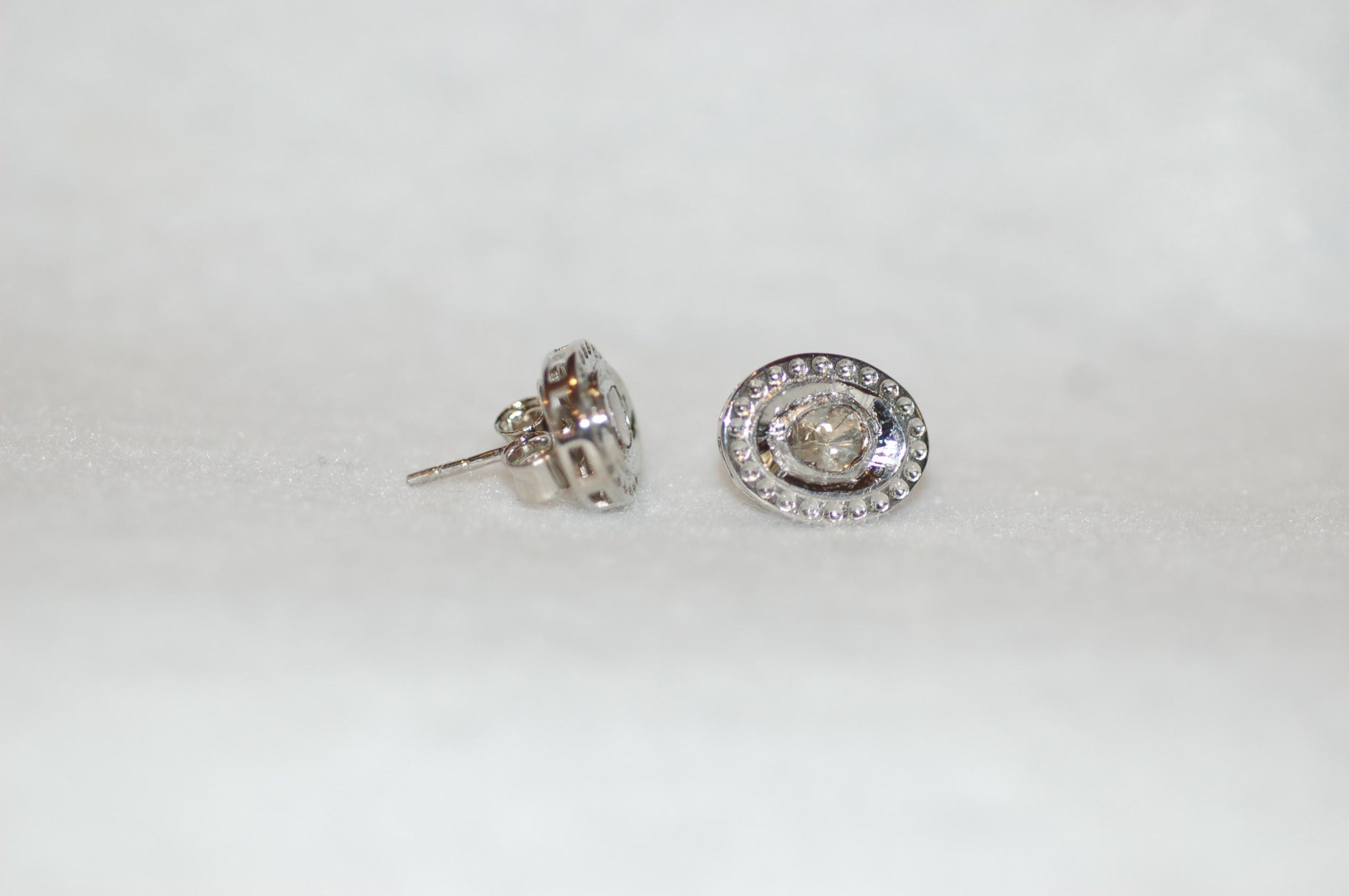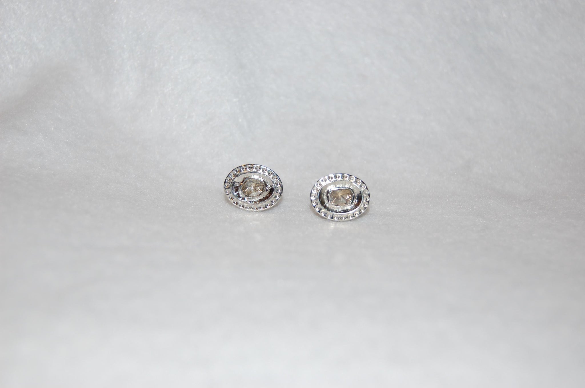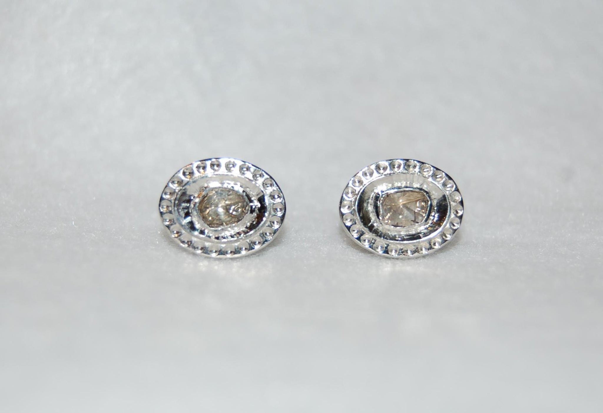 Elegant and gorgeous antique style diamond stud earrings are a must have! Rose cut oval diamonds are set in high polish sterling silver. The polki style is very wearable to unique. This will be your go to earrings! 60cttw diamonds, sterling silver. Due to the type of diamonds, please note that they will have varying degrees of inclusions, other imperfections and color variations which make them of a kind.