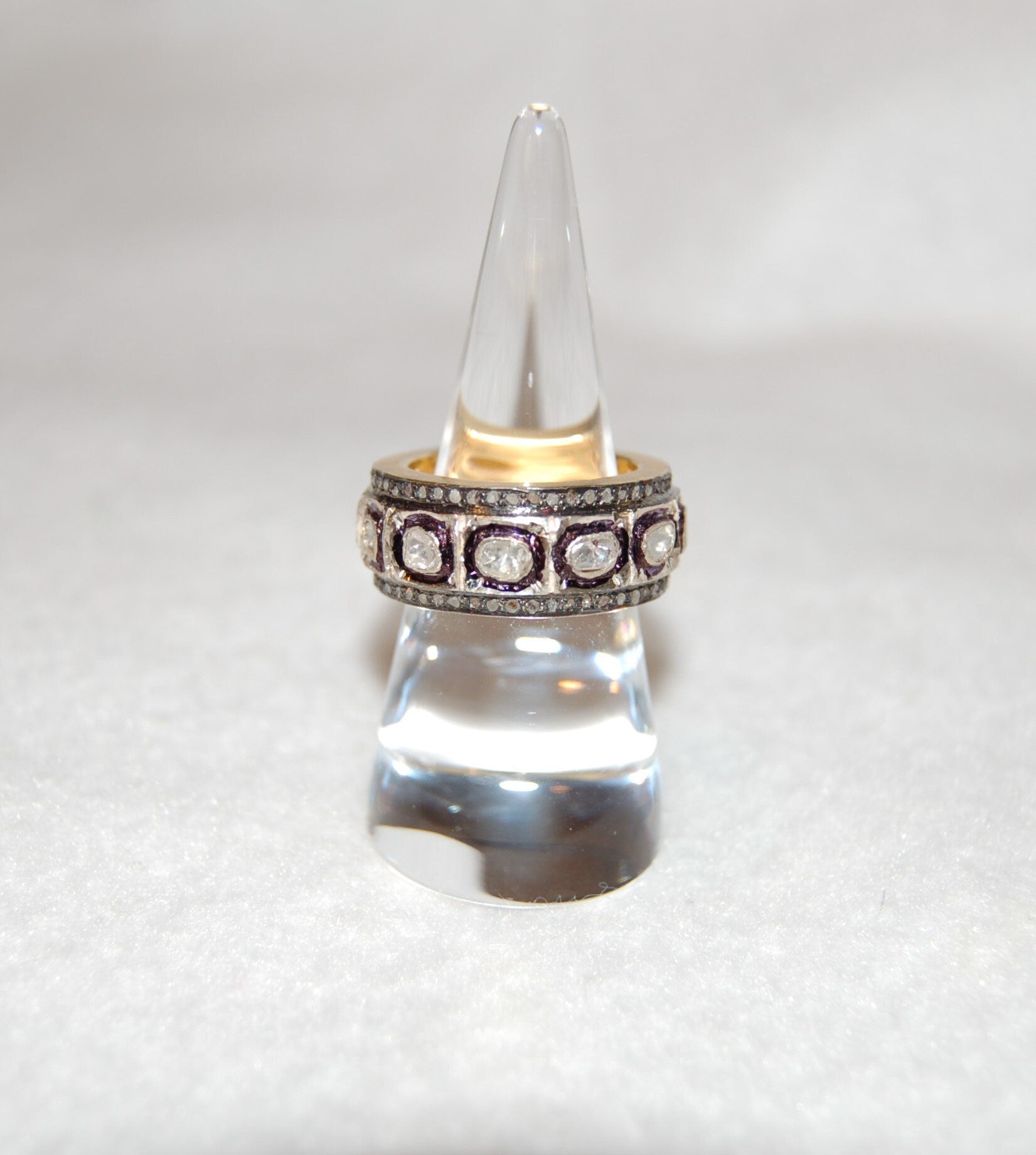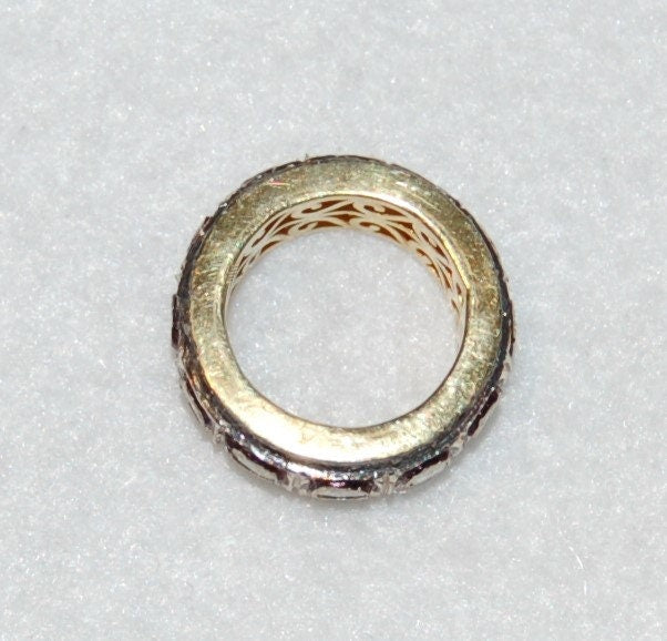 If you're looking for a unique wedding band then this ring is for you! Rose cut diamonds are set in a heavy silver antique style eternity band with gold plating on the inside. The inside of the band has scroll work that gives the ring old world feel. This ring is suitable for men and women. 2.35ct diam, sterling silver and gold plating, size 7.5. this ring is not sizable. Due to the type of diamonds, please note that they will have varying degrees of inclusions, other imperfections and color variations which make them of a kind.