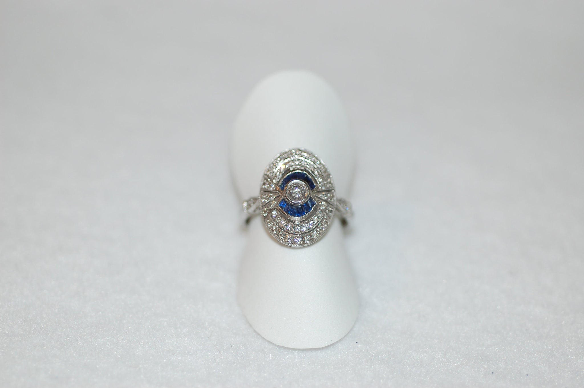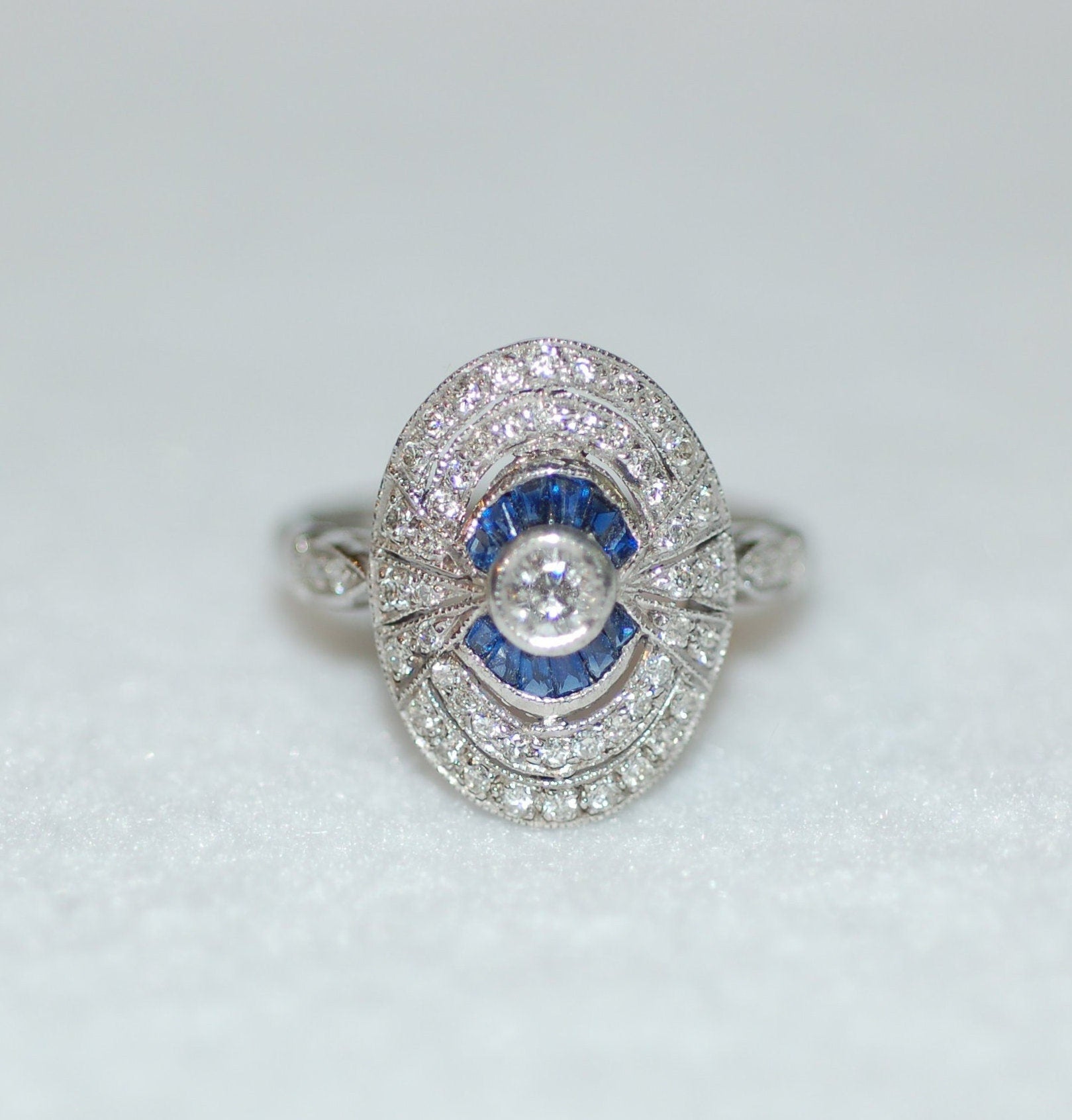 Beautiful antique inspired art deco diamond and sapphire ring! A special piece that will become a heirloom. Diamonds .90ct, sapphires .20ct, 14K white gold, size 6.5, can be sized. please allow extra week for delivery.