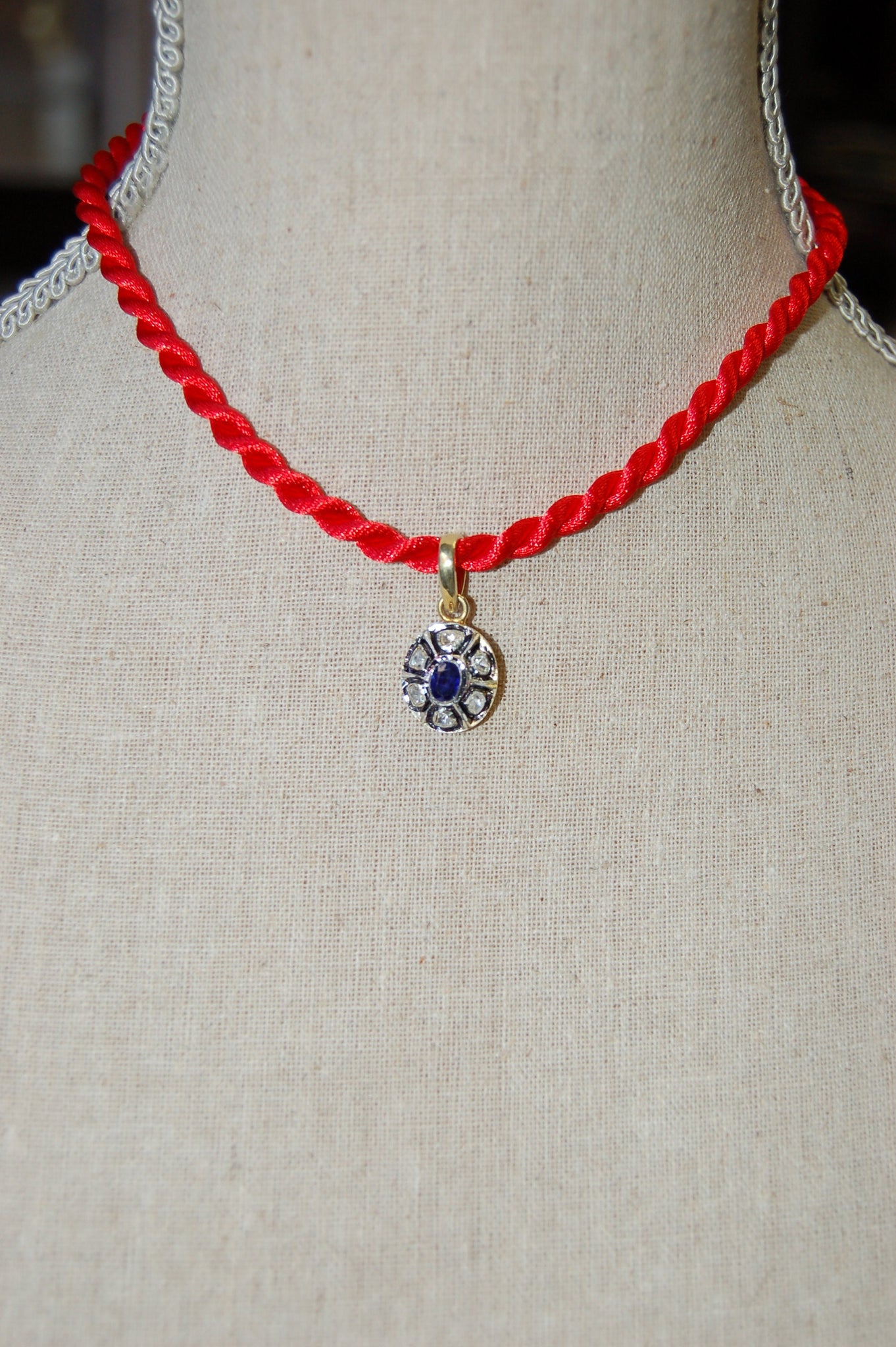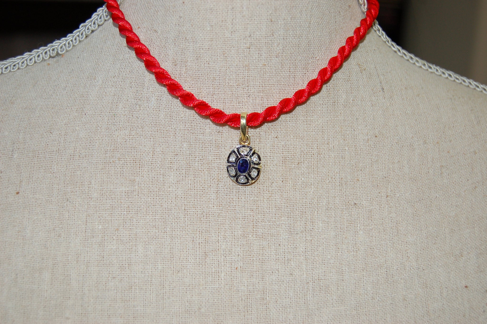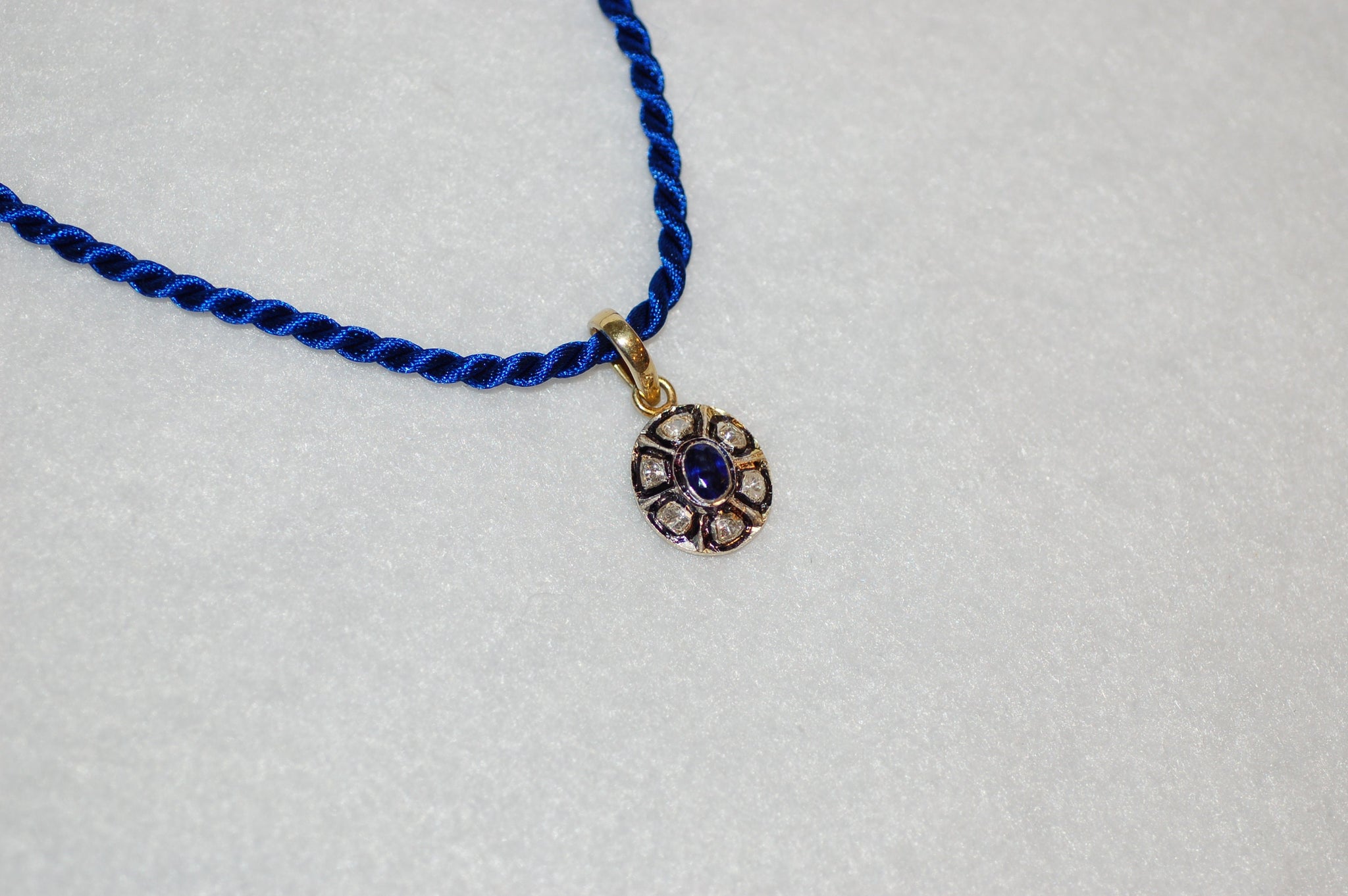 If you're looking for something regal look no further than our sapphire and diamond pendant! This pendant gives off antique vibes galore. A beautiful, faceted sapphire is surrounded by rough cut diamonds that are set in blackened and gold-plated silver. This piece is a heirloom in waiting. sapphire, diamonds, silver. comes with a satin cord in red or blue
