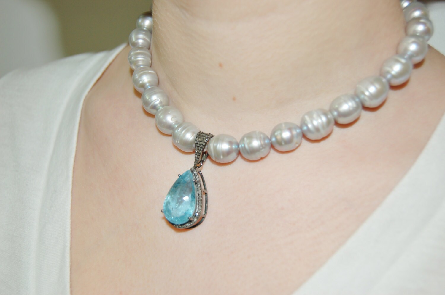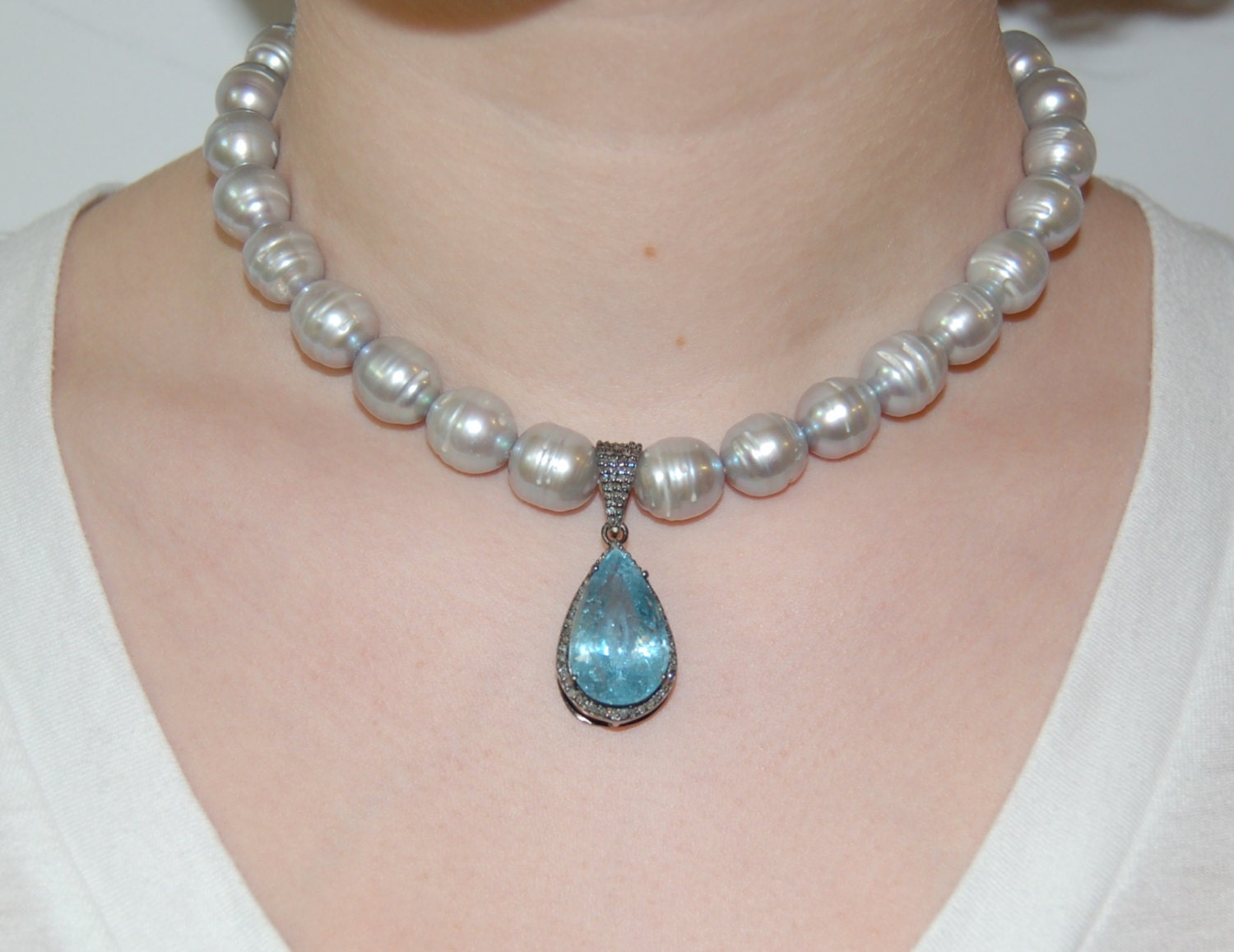 A beautiful Aquamarine tear drop encased in diamonds is suspended on gray baroque pearls to create a decadent necklace. Perfect for a special wedding or that Hollywood party! This is a special piece for that special woman. Cultured pearls and silver S lock.