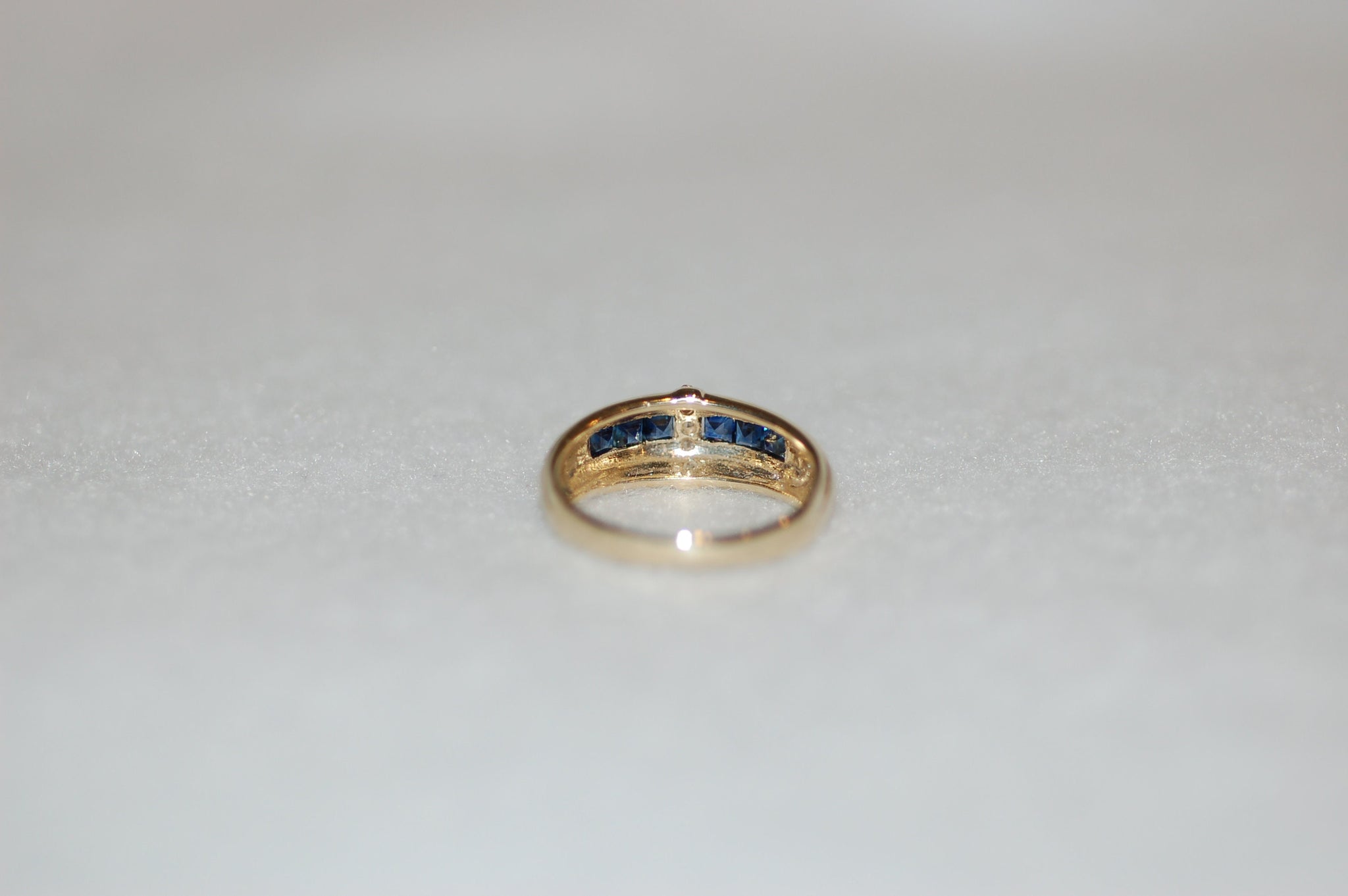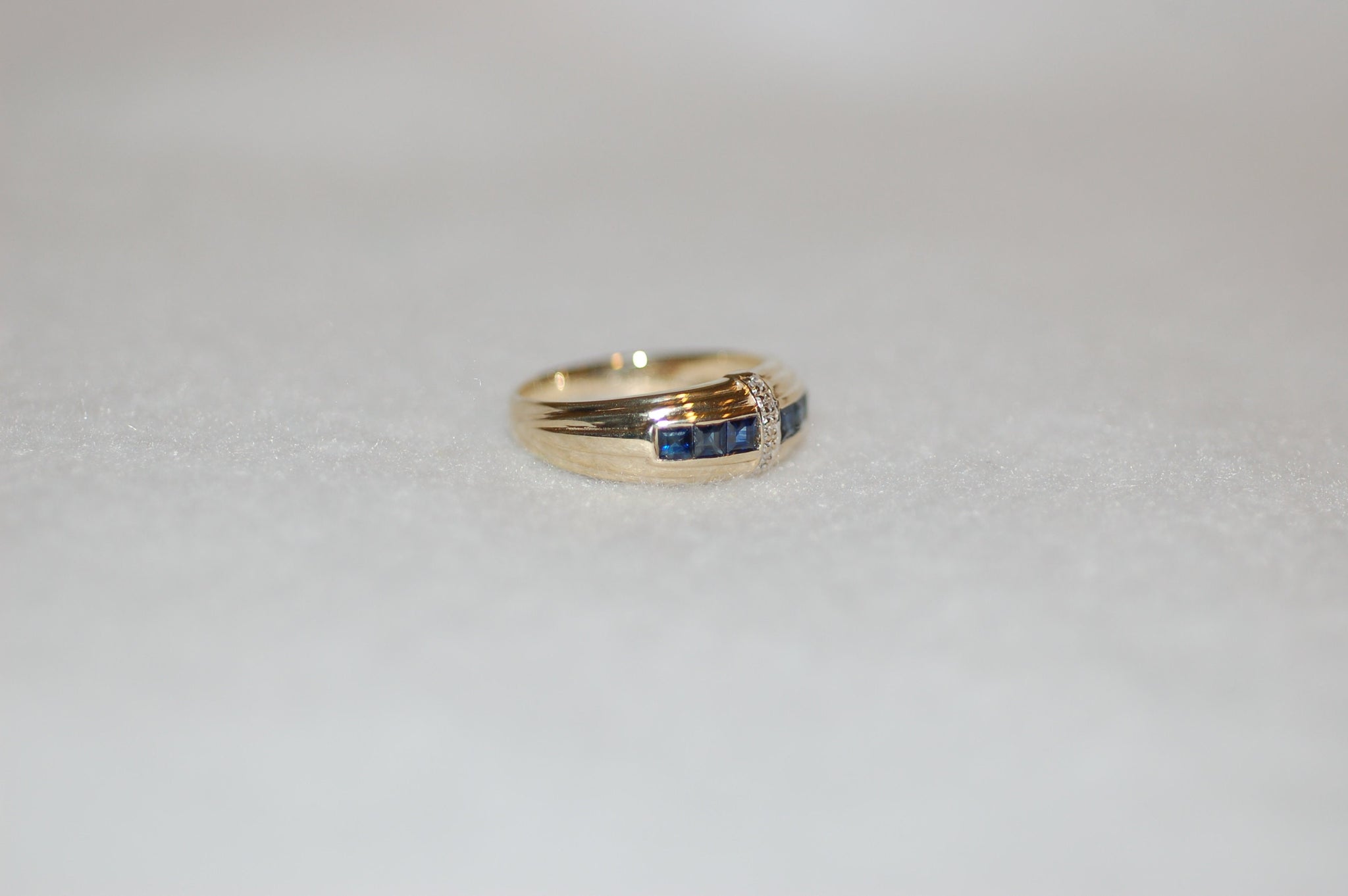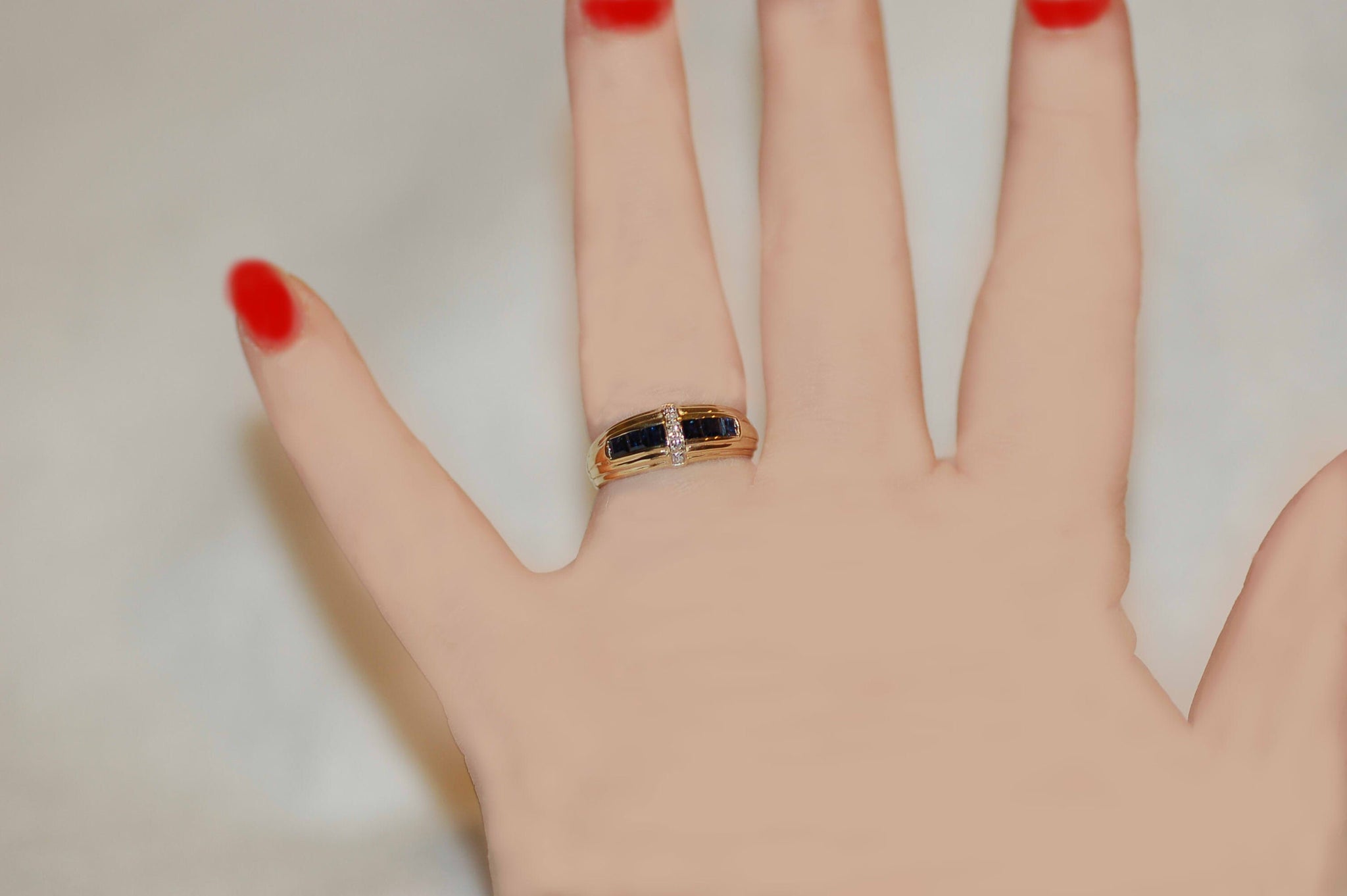 Very pretty art deco style sapphire and diamond band. Princess cut sapphires are invisibly set in 14K yellow gold with diamond accents. This beautiful ring can be worn by both women and men. Would also make a great alternative to traditional wedding rings. .60ct tw sapphires, .06ct tw diam, 14K yellow gold, please inquire for sizing