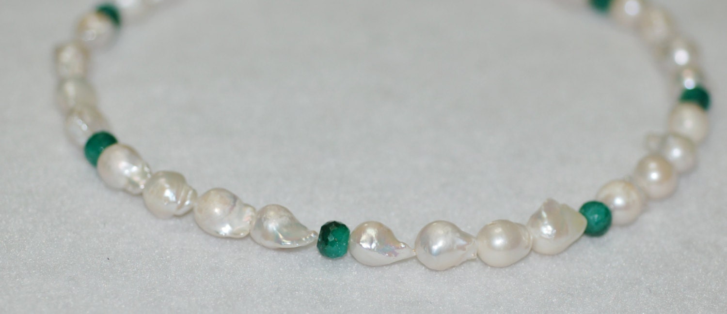 Natural white baroque fresh water pearls are paired with beautiful faceted emerald beads to create an elegant necklace that works through out the day. The pearls and emeralds are unique and no two are the same. Just as the wearer. A gold plated S clasp completes the look. Approx 16"