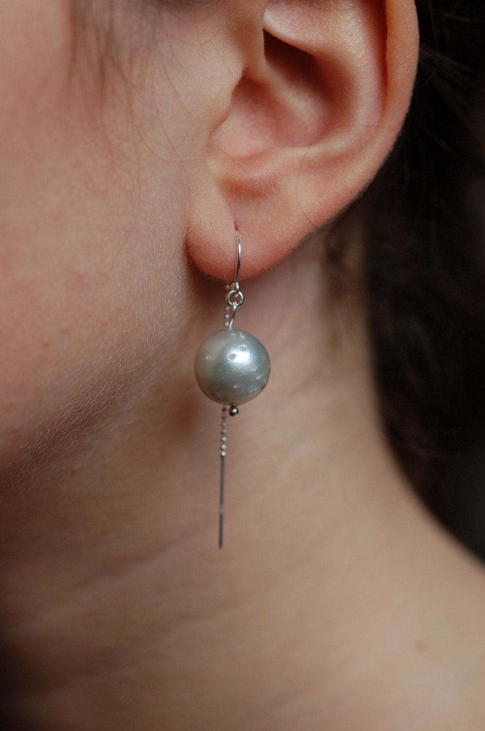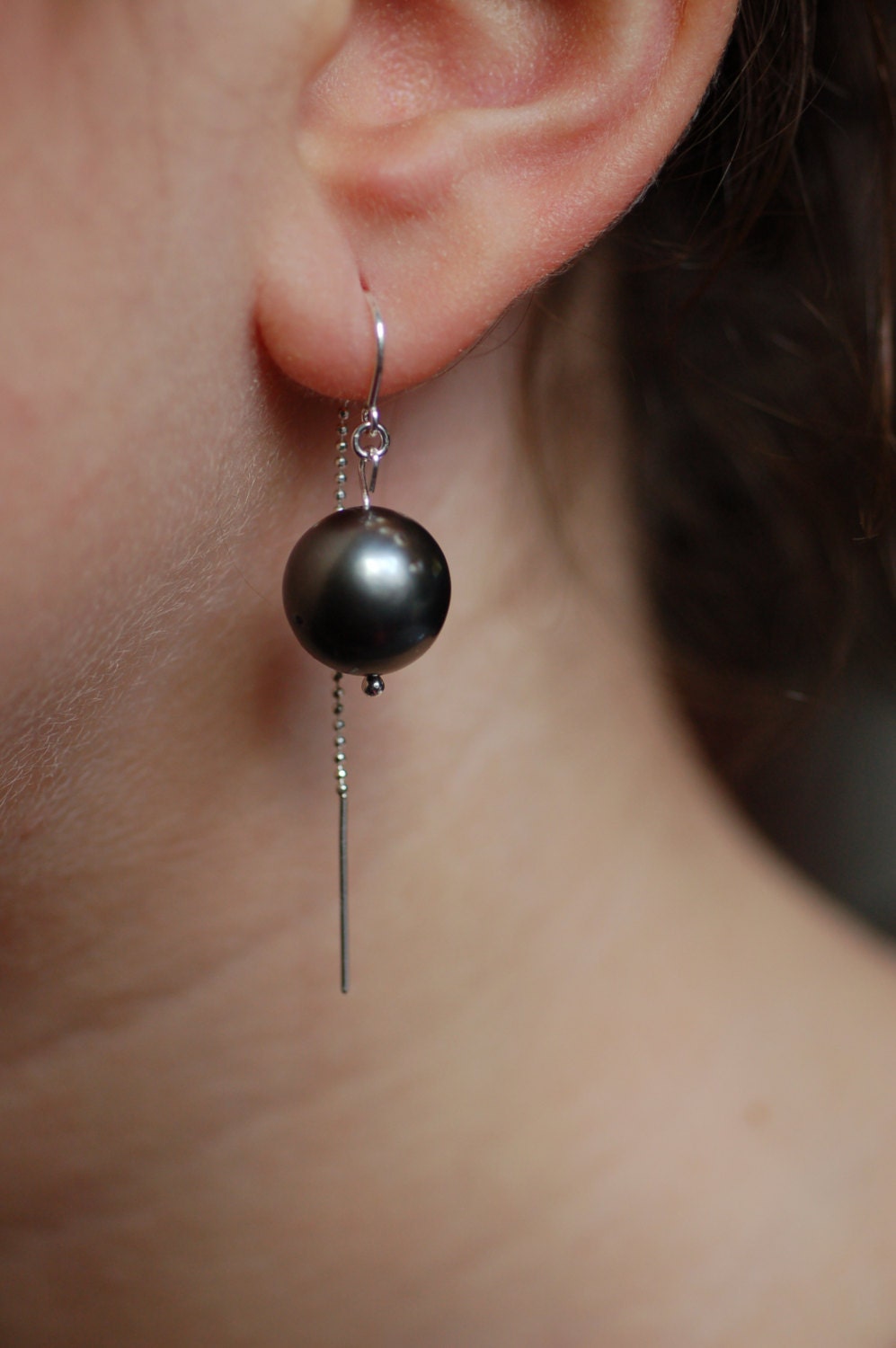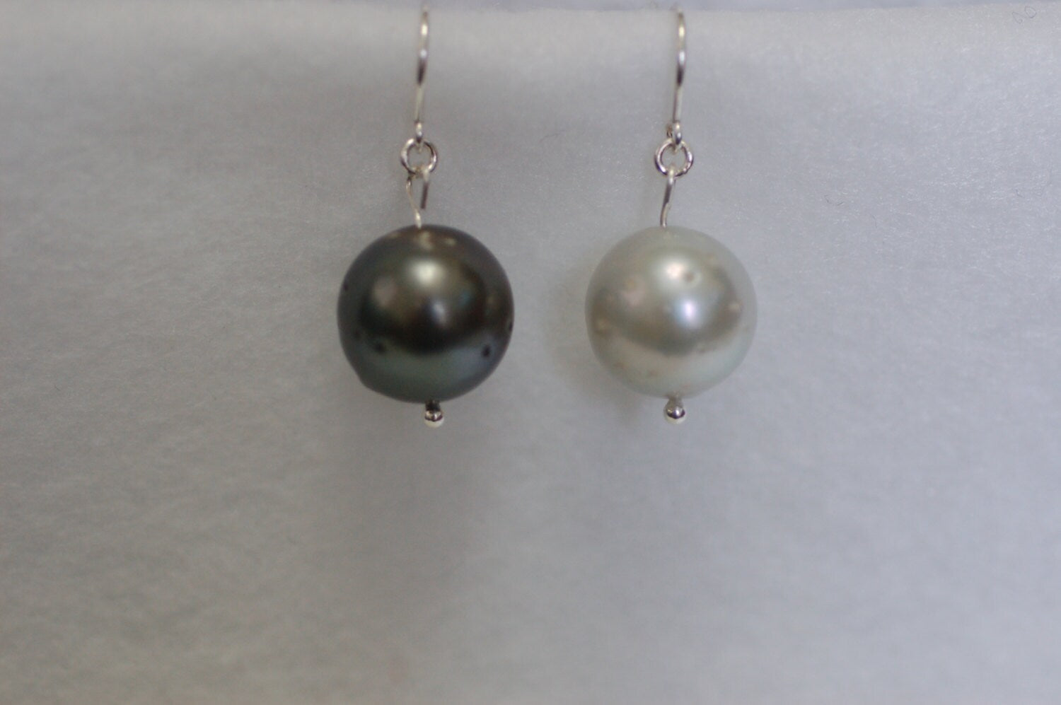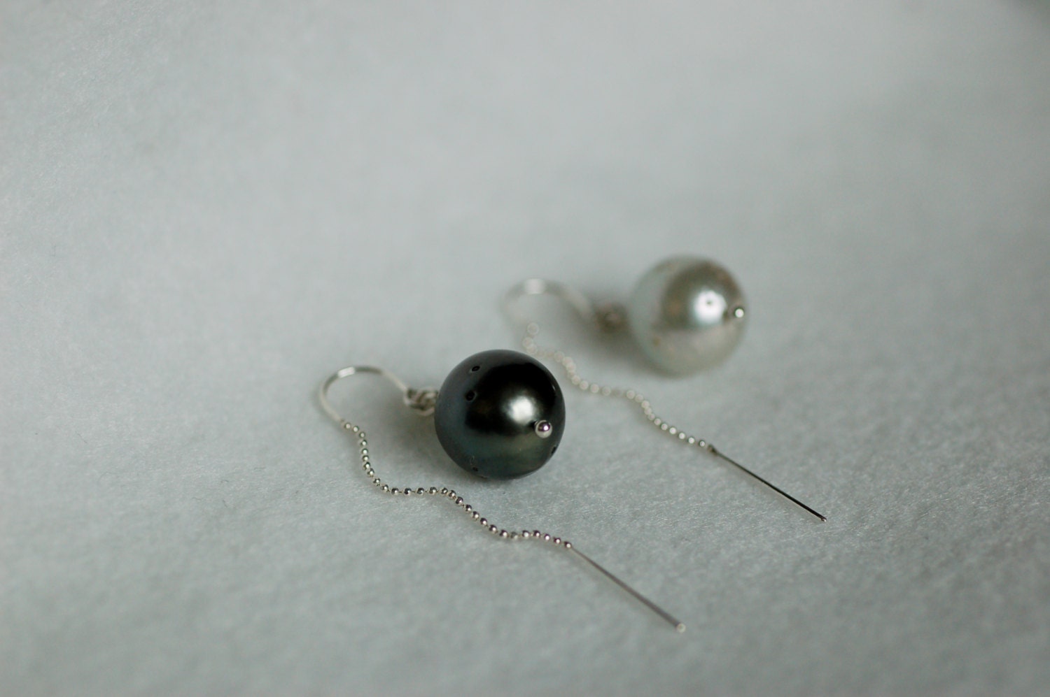 There is harmony in this simple uncomplicated Black Tahitian and White South Sea Pearls on a silver ear thread. Opposites do attract.