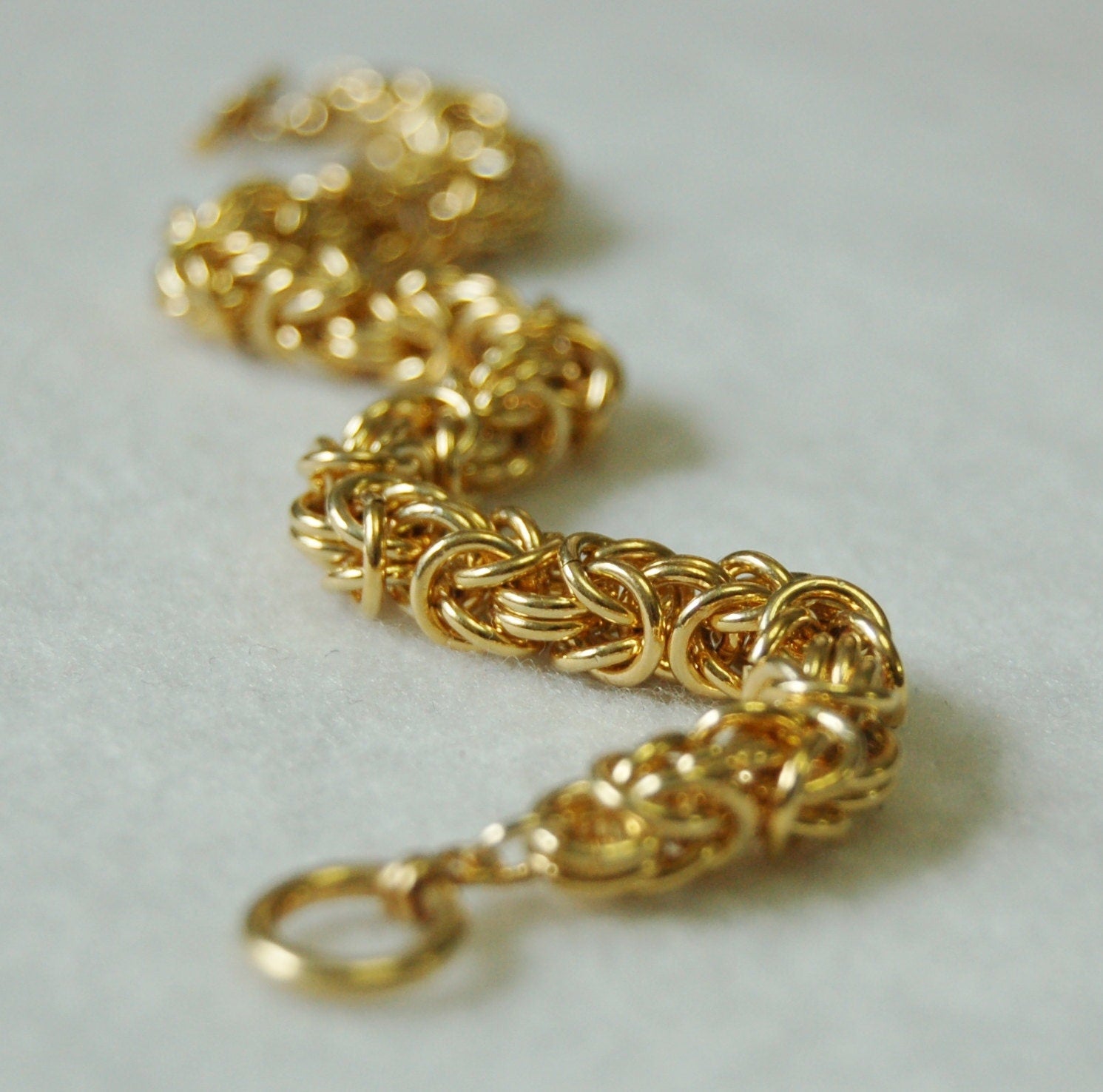 Jewelry doesn’t get any more classic than this! A beautiful Byzantine weave makes this bracelet stand out in a crowd. Handmade out of gold plated silver rings, this bracelet makes a statement. The color is the warmest of gold and the weight of it will feel like your wrist is caressed by the sun. A toggle clasp finishes this elegant piece. It bracelet will stand the test of time. This item is unisex piece. Lady’s size 7-8” and men’s 9-10”. The width is approximately ¼”, it’s a substantial piece. The men’s (not shown) has a lobster clasp. This weave can also be made into a necklace. Please email for additional details on men’s bracelet and necklace.
