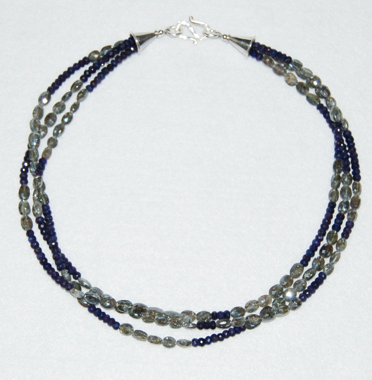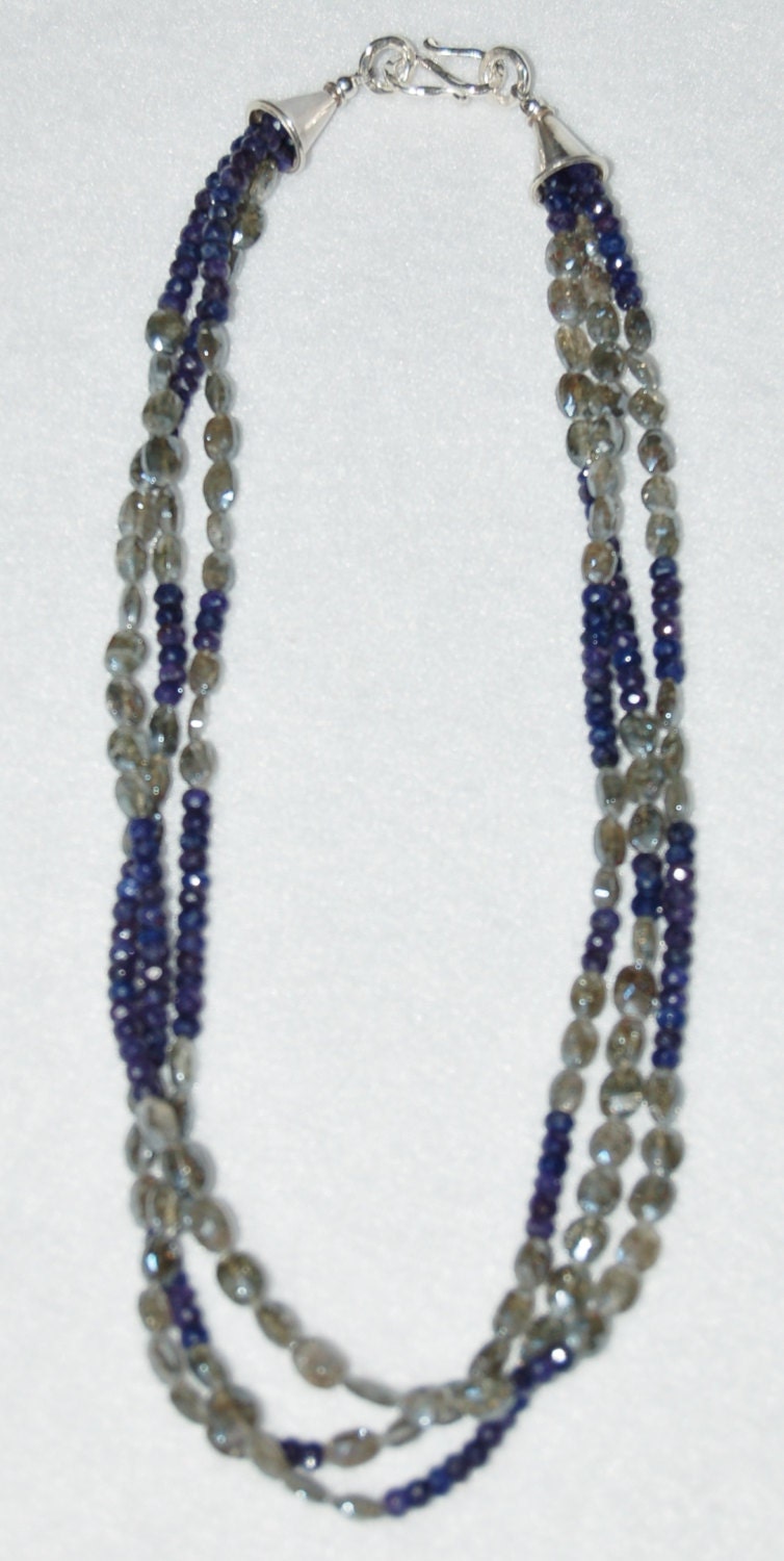 Three strands of blue sapphire and iridescent silver silverite beads come together to create a dreamy cascading necklace to adorn you. The color combination will make any evening outfit pop. An elegant piece for the holiday season! Approx 17” long, silver hardware