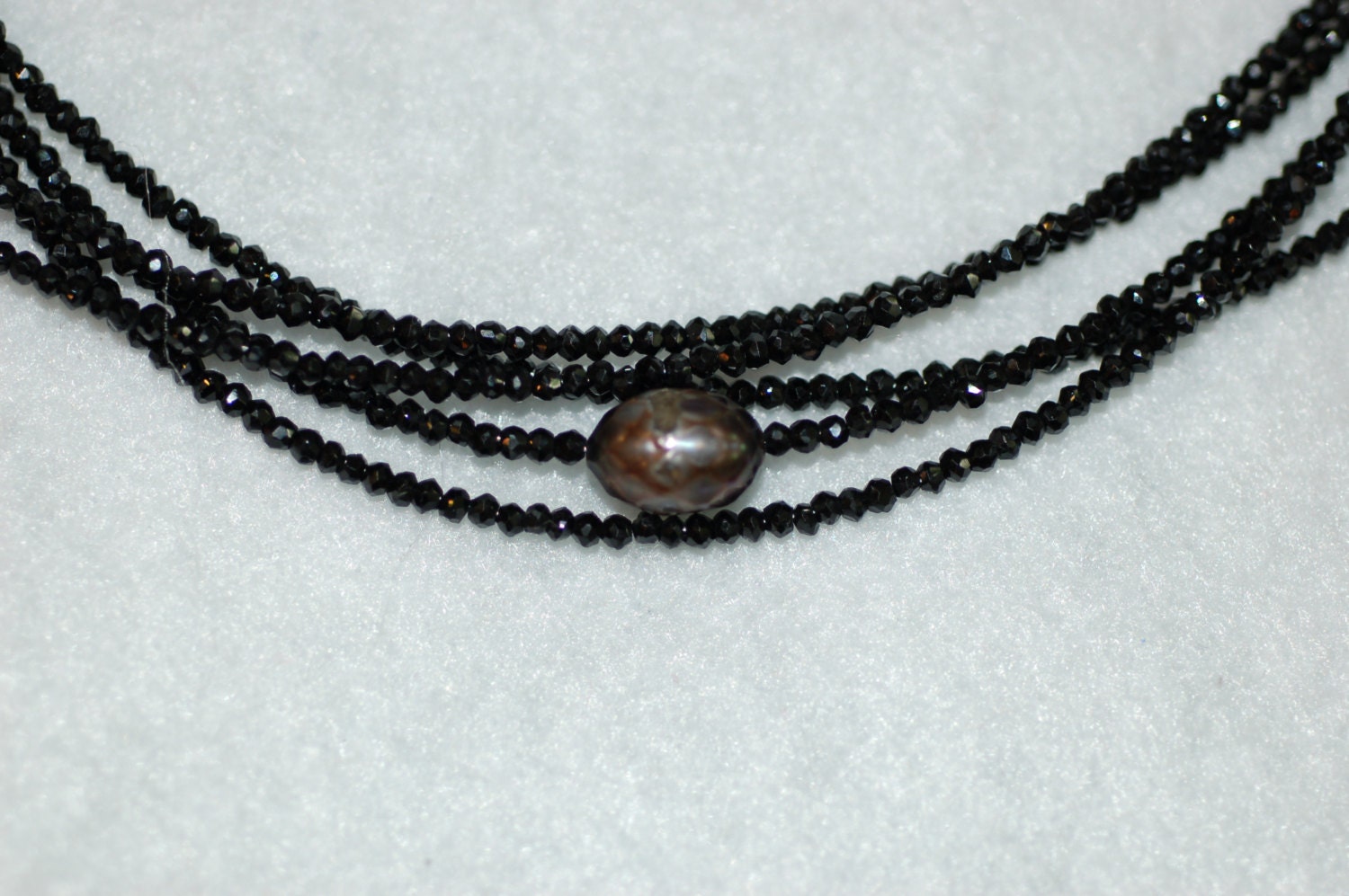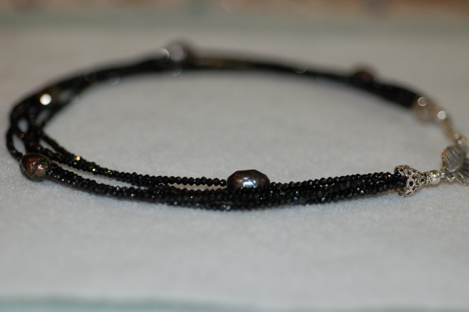 Dyed faceted fresh water pearls are suspended on black Spinel strands, to create a rich and decadent necklace. The necklace is finished with silver end caps and a silver leaf clasp. A perfect necklace that can go from the office to a night out in Soho! Approx 16” long.