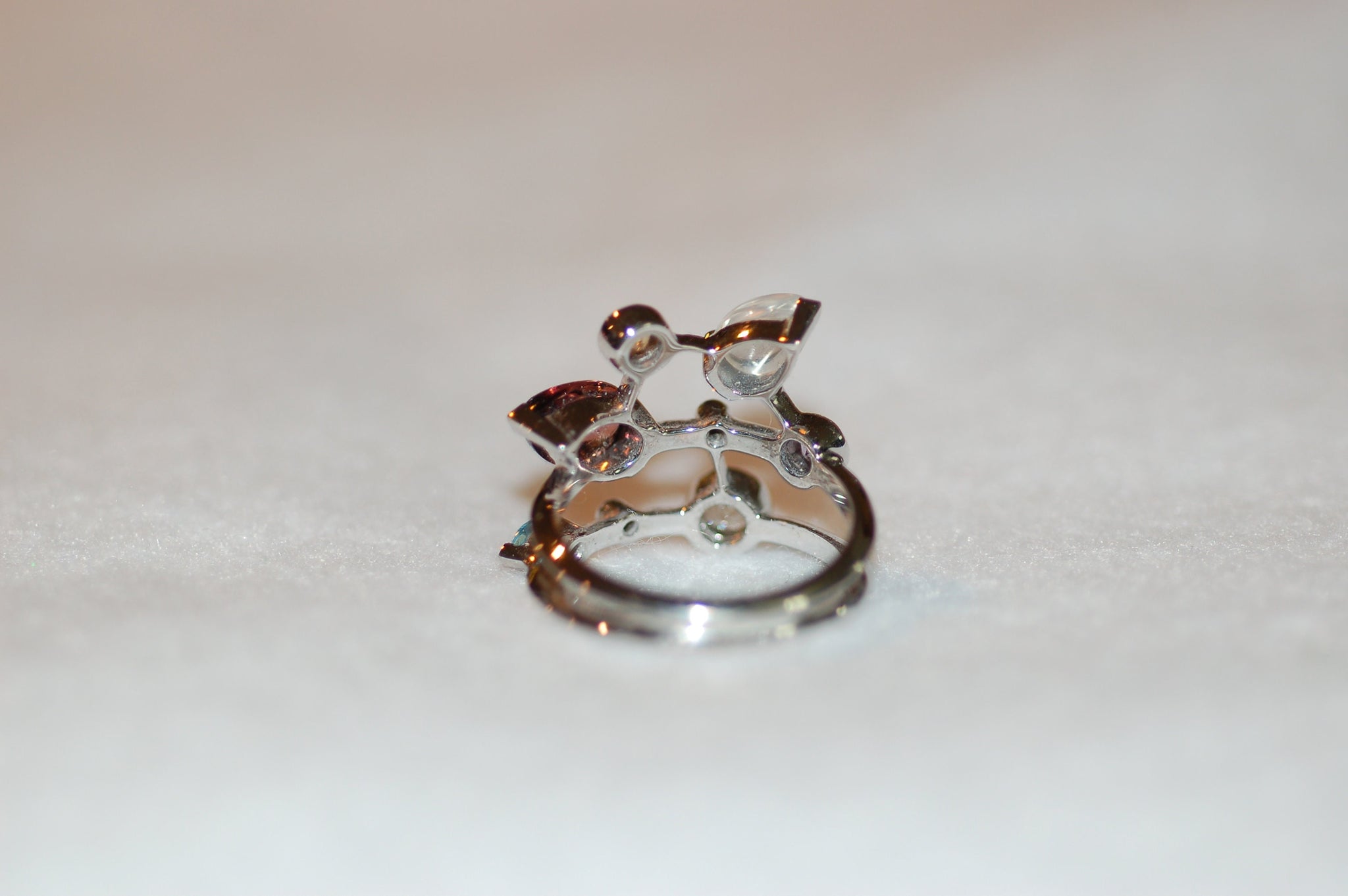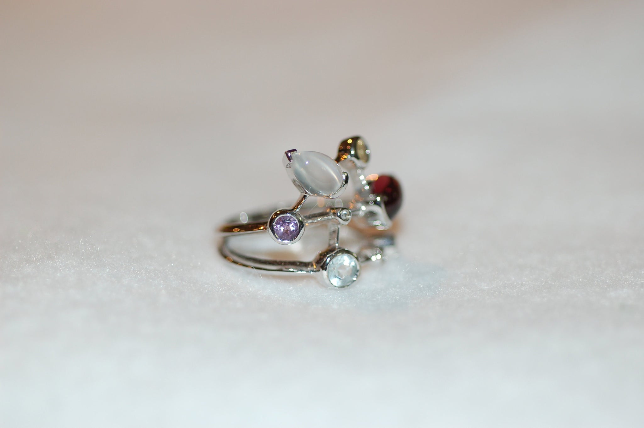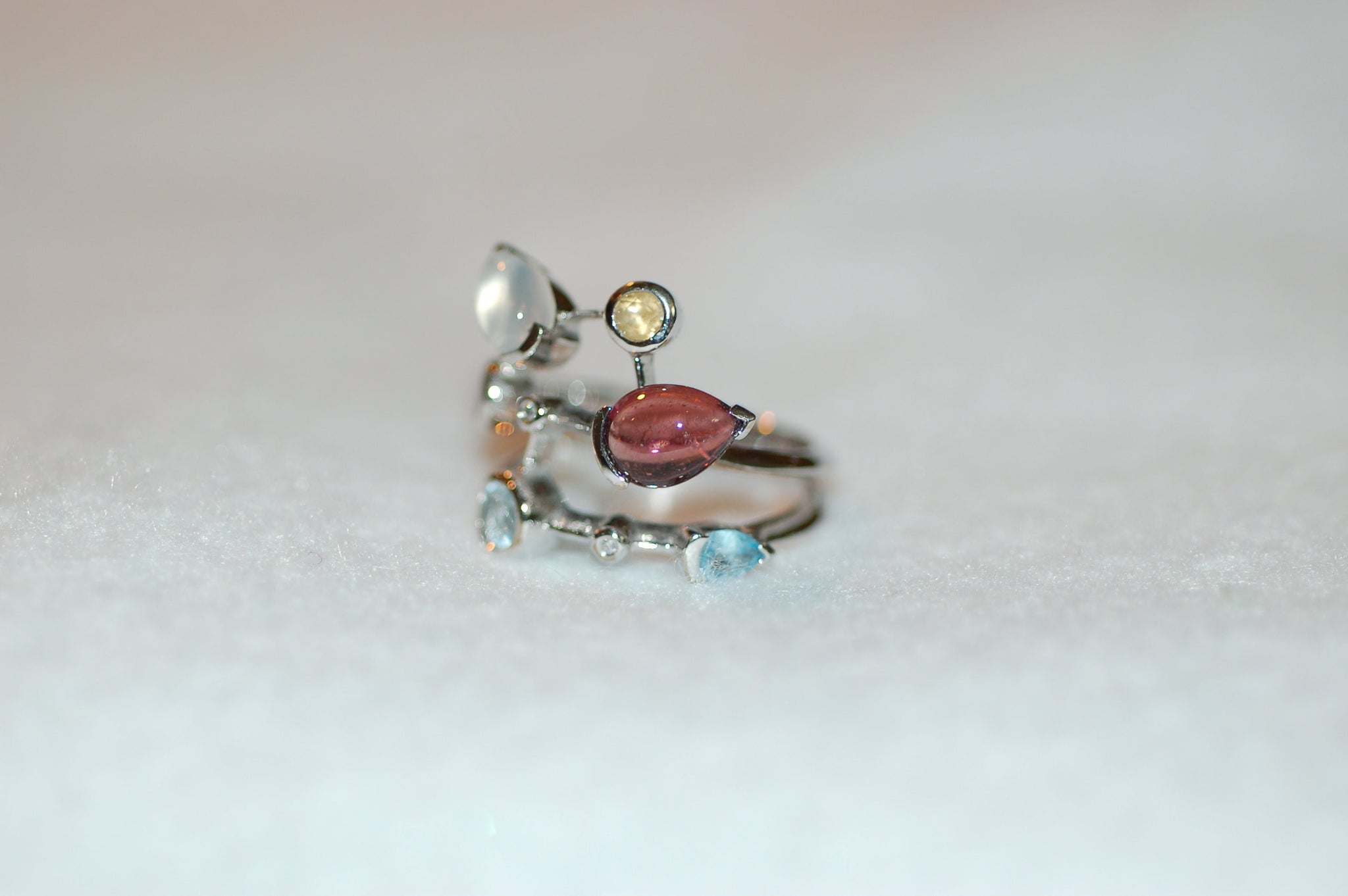 Unique multi shape gemstone ring will set you apart from everyone else. Various gemstones and diamond accent are set in 14K white gold to bring out the beautifully colored stones. This gorgeous and elegant ring will be a show stopper! 14K white gold, .02ct diam tw, amethyst, blue topaz, citrine, quartz, aquamarine,garnet, size 6.5-6.75