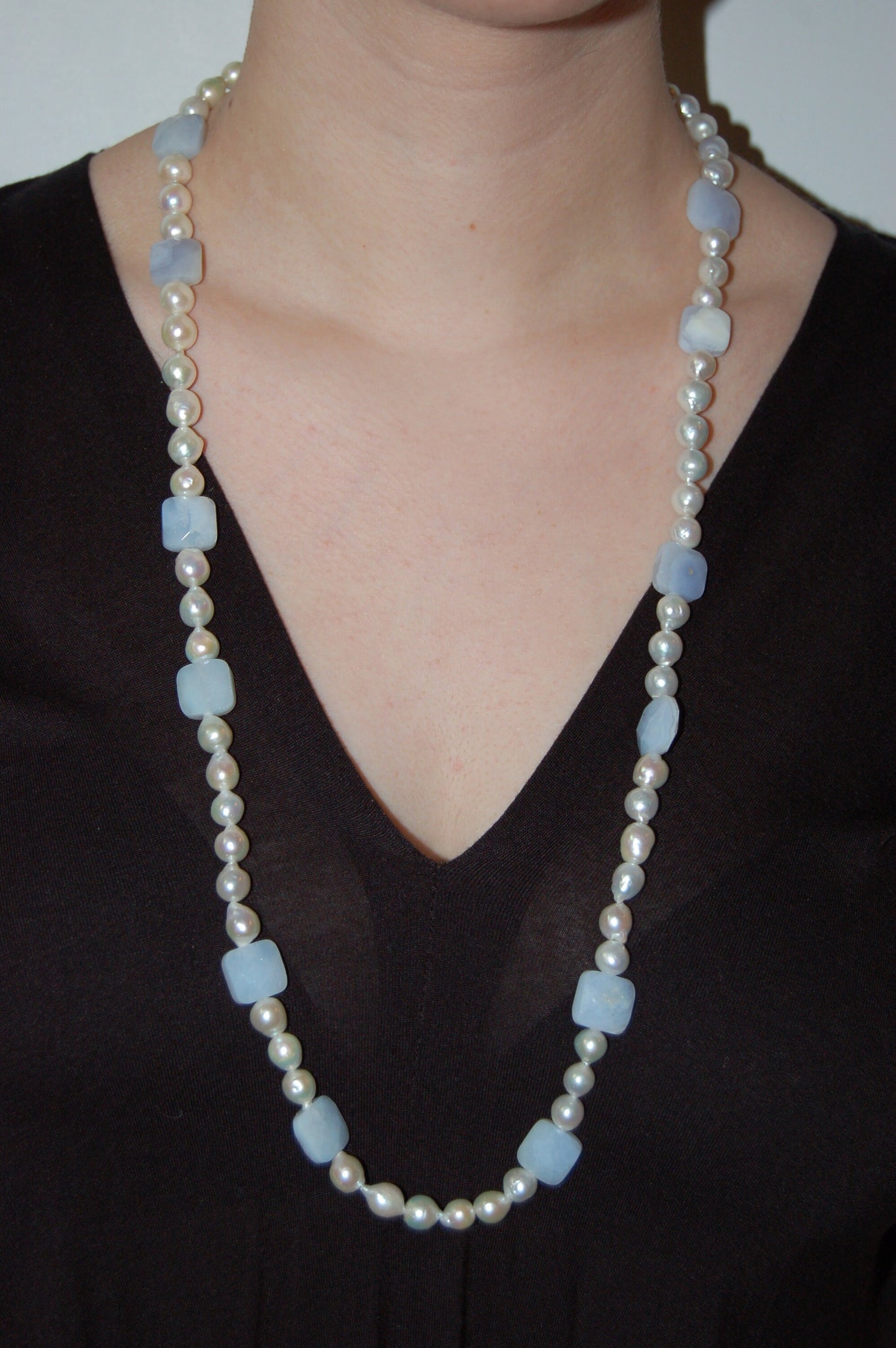 Cushion shaped chalcedony beads are paired with white cultured pearls to make an elegant necklace that will work from day through night. Wear it long or short for a versatile look. Silver S lock completes the look.