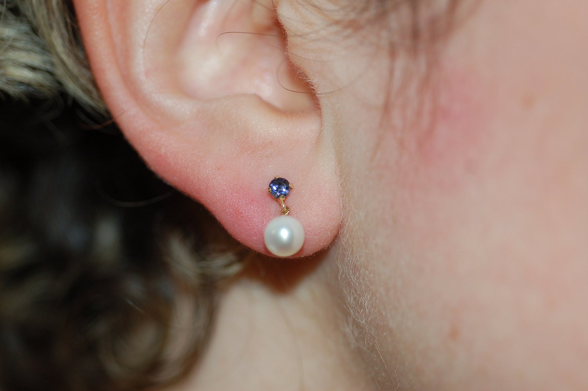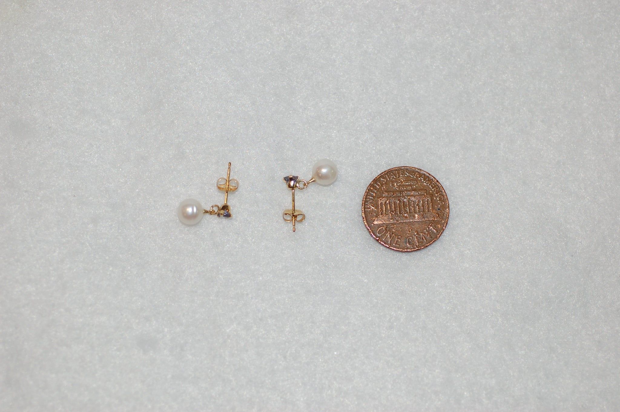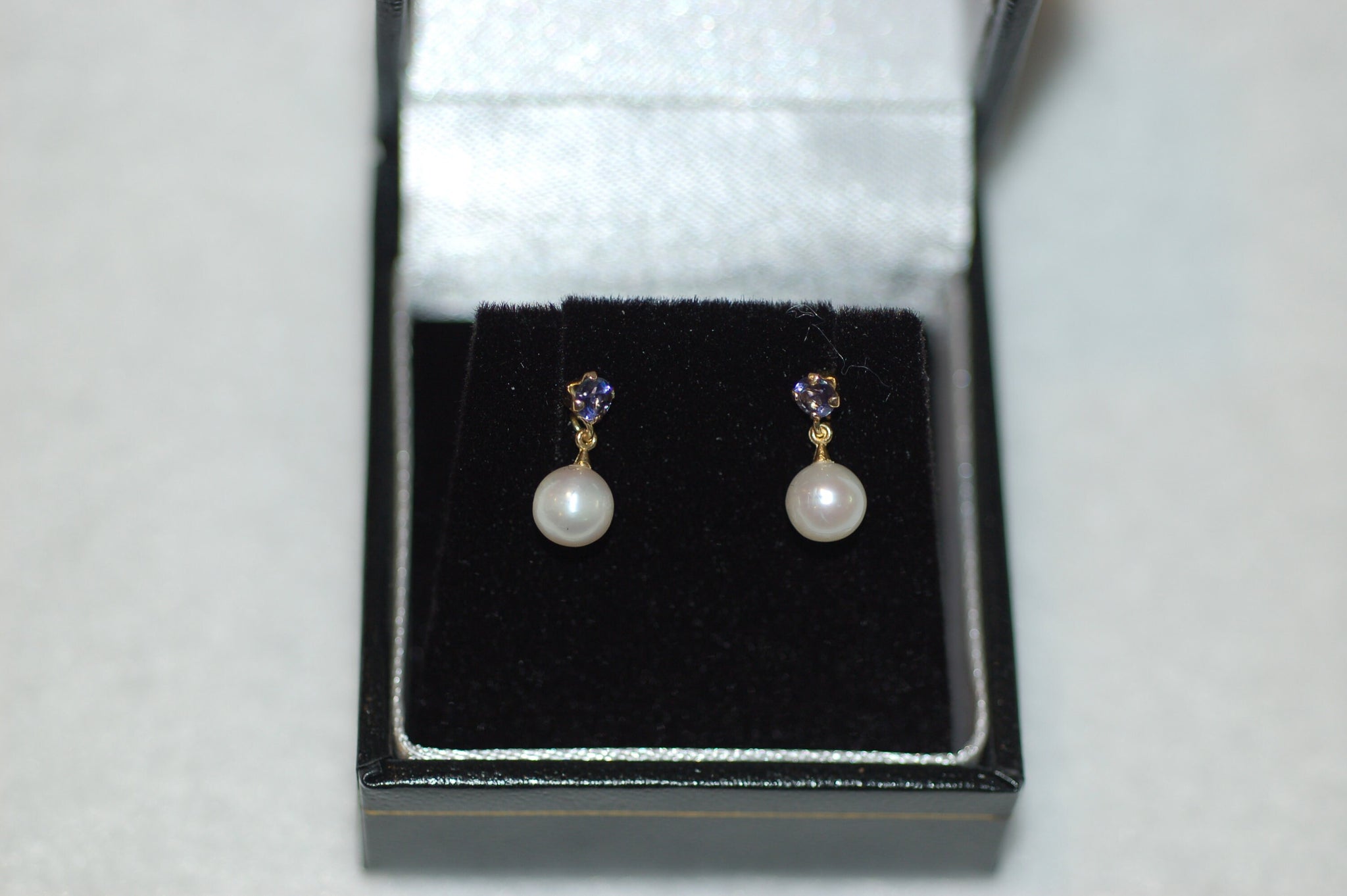 Adorable and dainty these earrings are a must have! A white freshwater pearl set in 14K yellow gold dangles from a prong set round iolite.