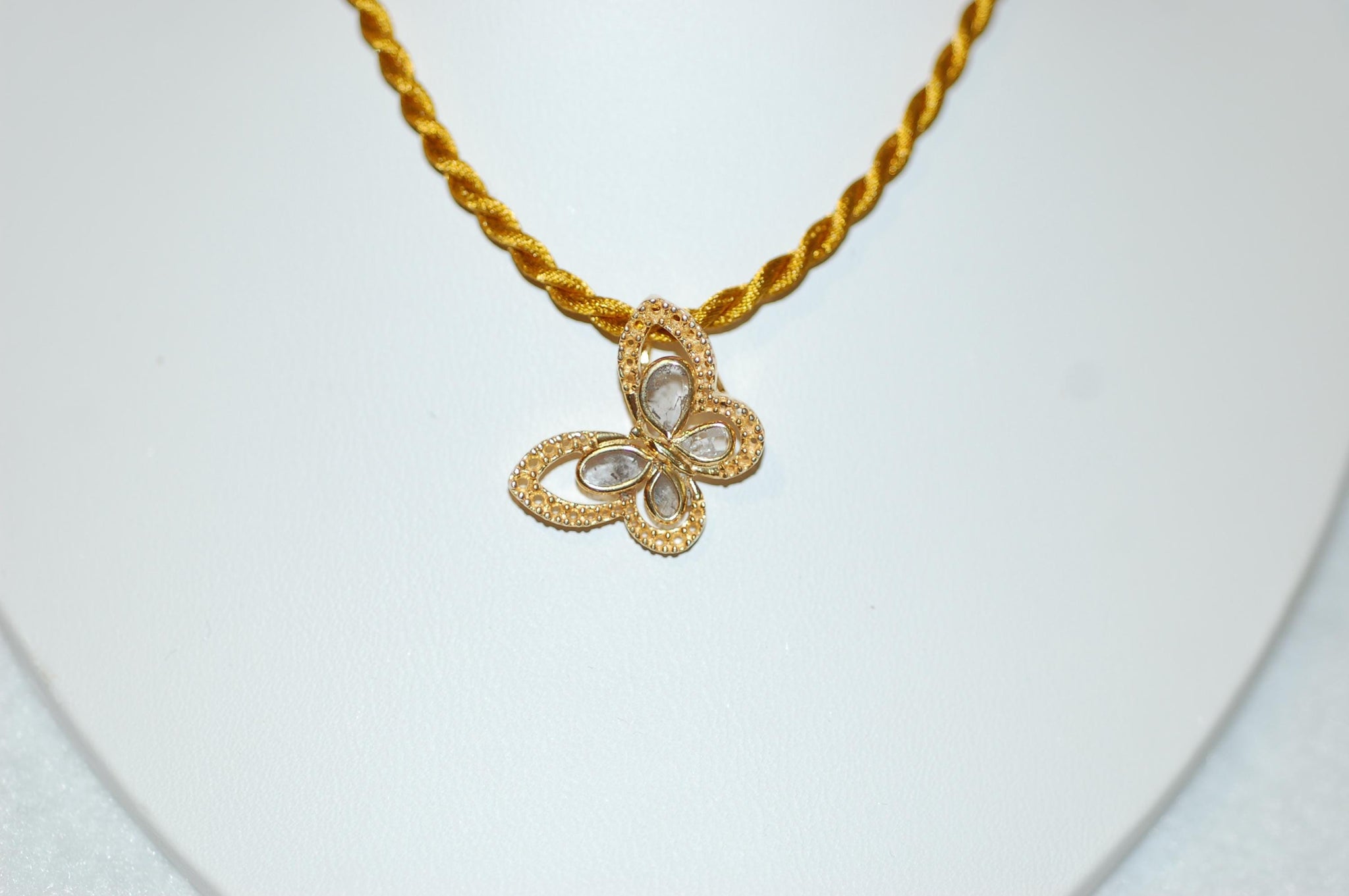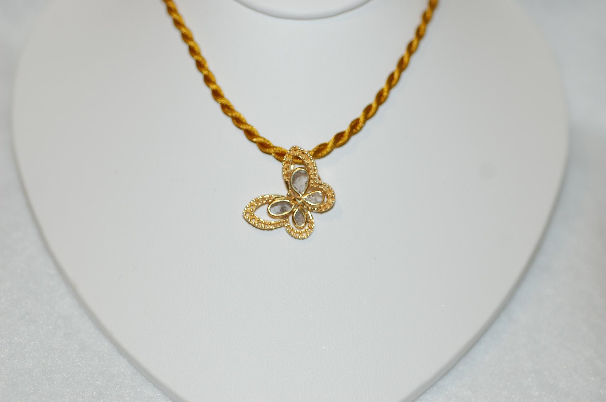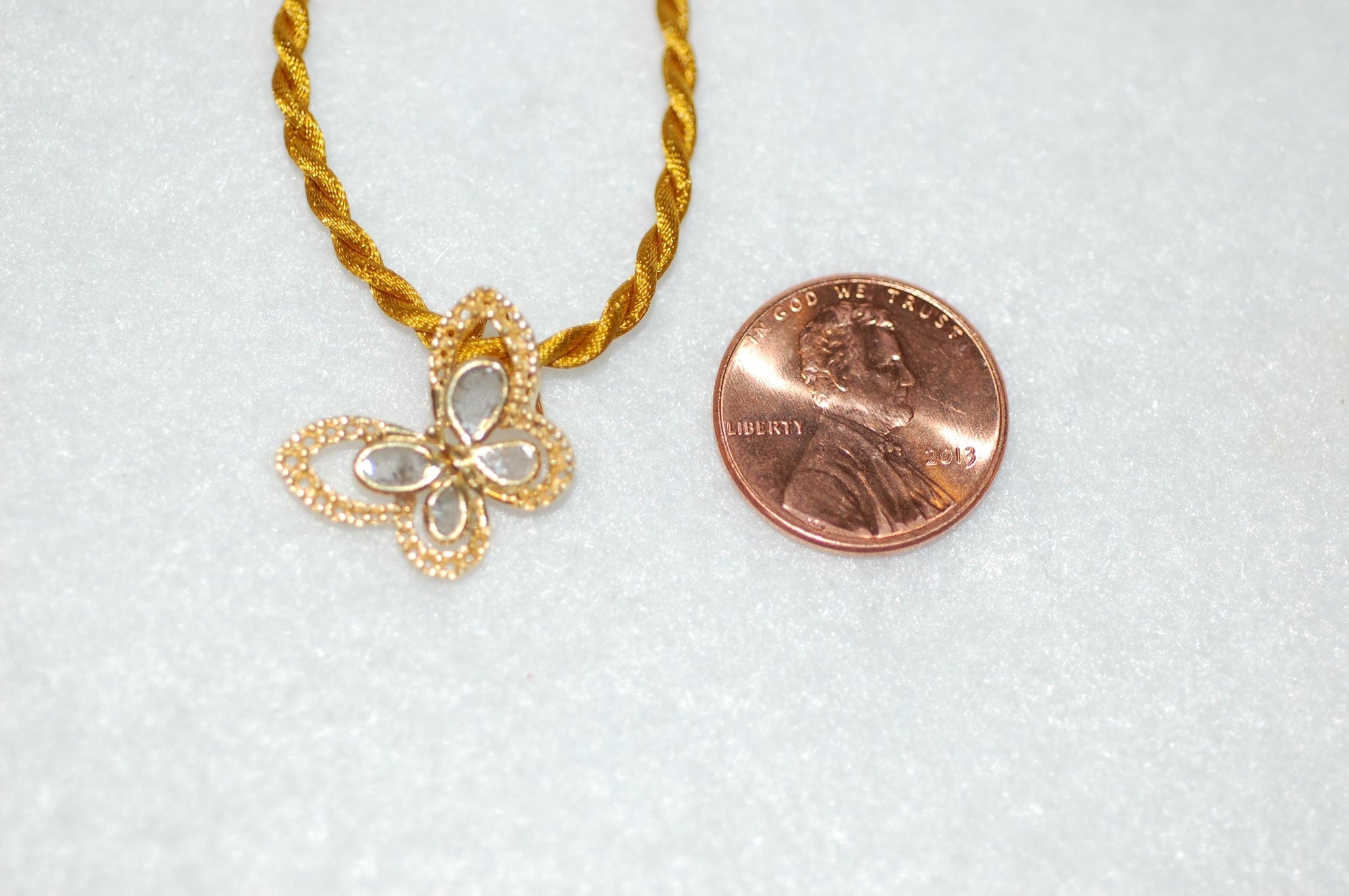 Pretty butterfly! The butterfly features a gold platted over sterling silver setting with four wing sections, each containing a rose cut diamond. What makes this piece particularly striking is the intricate milgrain detailing that surrounds each wing section. This traditional jewelry technique creates tiny beaded borders around the gemstone settings, adding texture and vintage appeal to the overall design. The milgrain work demonstrates fine craftsmanship and gives the butterfly a delicate, lace-like quality. The pendant hangs from satin cord complements the warm tone of the butterfly setting. The butterfly's wings are arranged in a natural, slightly asymmetrical pattern that gives the piece an organic, lifelike quality rather than a rigid geometric appearance. The combination of the warm gold, sparkling clear stones, and decorative milgrain creates a piece that's both classic and timeless. .15ct diamond, sterling silver, yellow gold plating, choice of colored satin cord