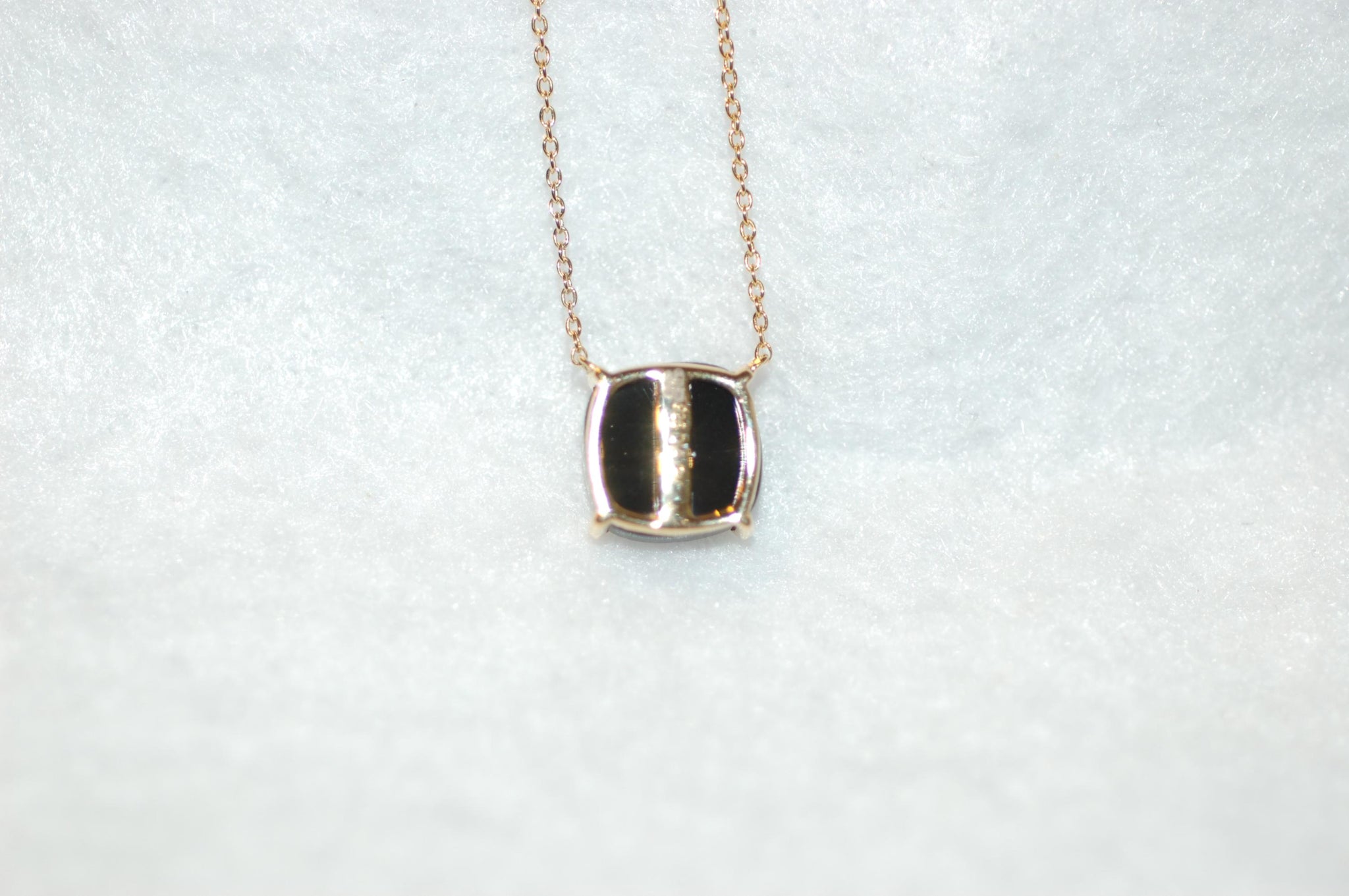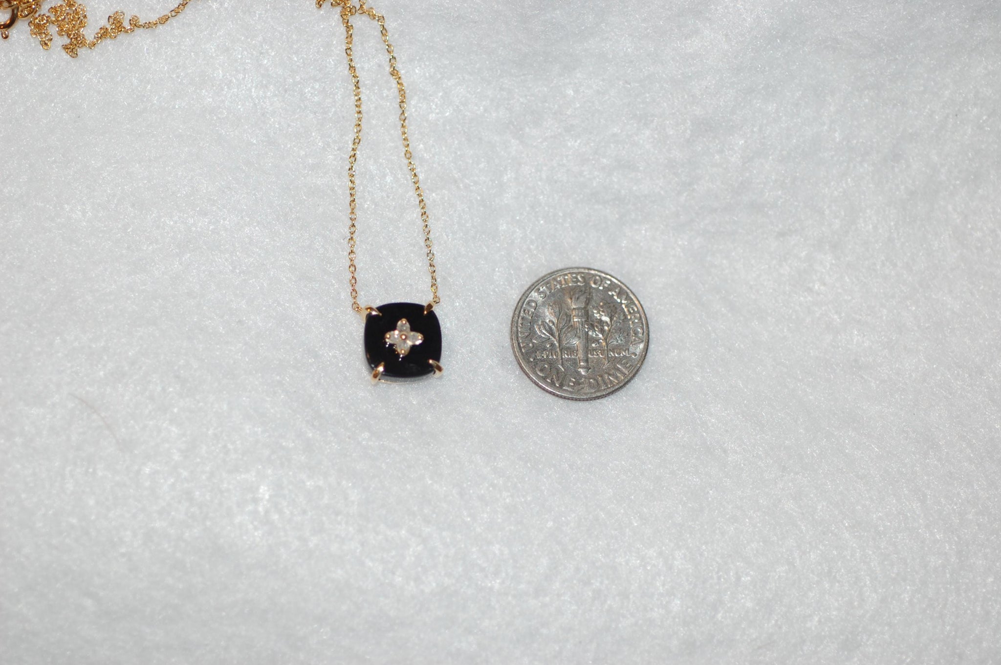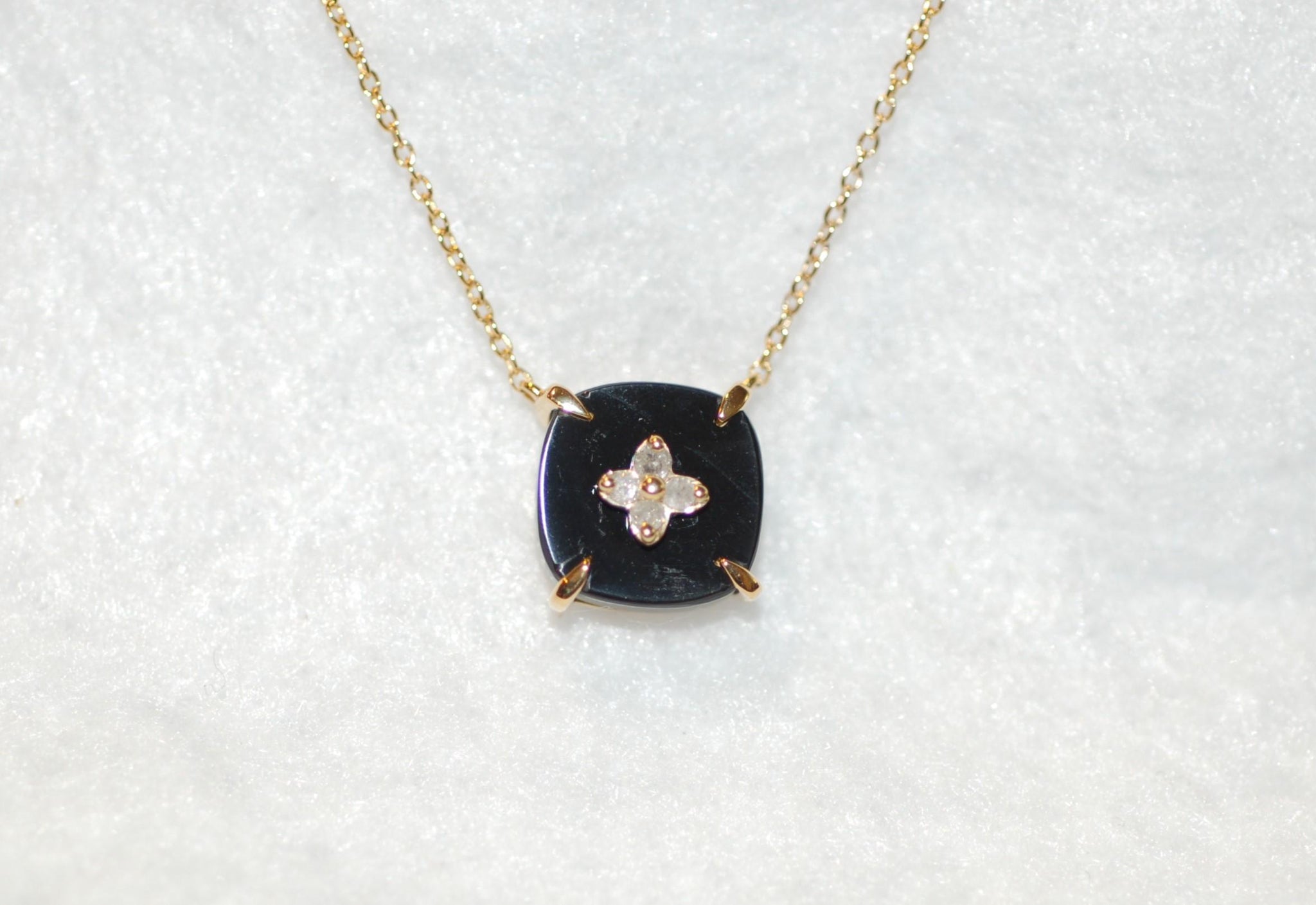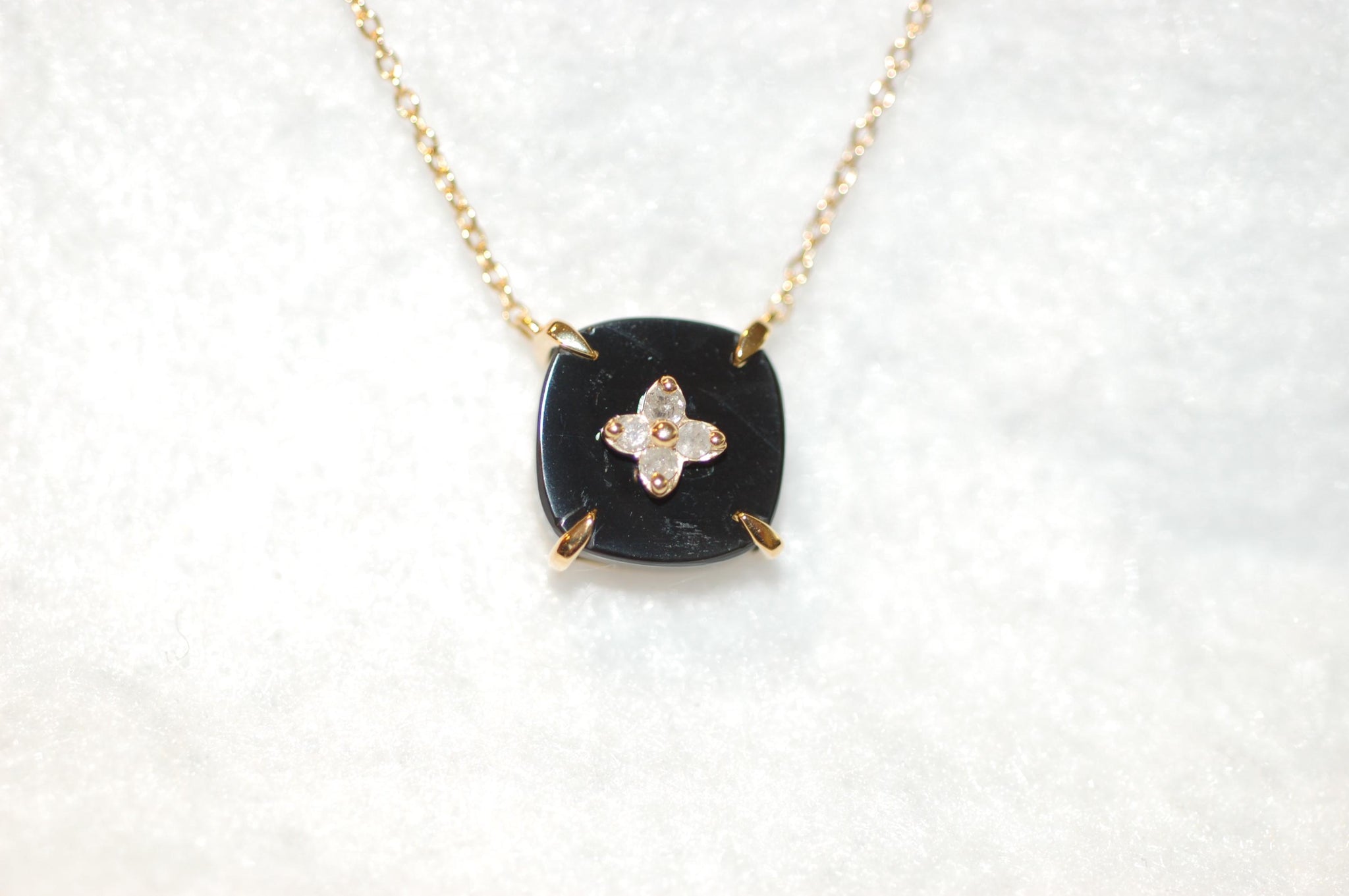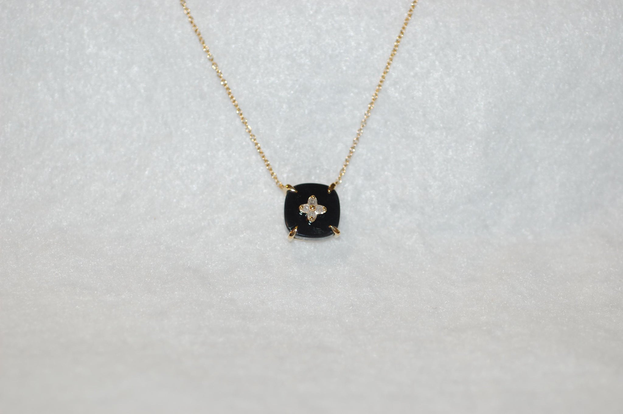 Fashion forward and stylish! Diamonds set in a four petal shape on black onyx create a classic and stylish pendant. The delicate chain in yellow gold plated silver adds to the overall minimalist look. A beautiful piece for a wedding or any special occasion! .04ct diamonds, black onyx, gold plating, sterling silver, 16"-18" adjustable chain.