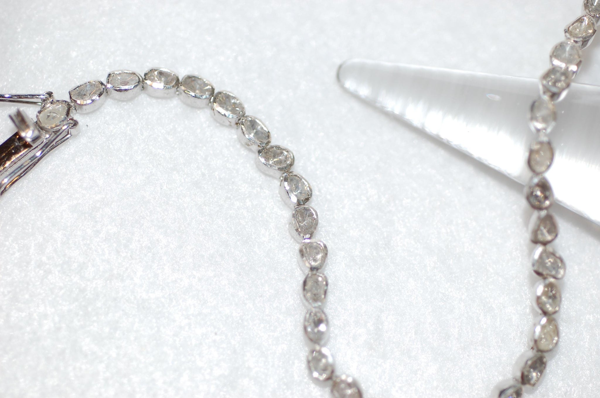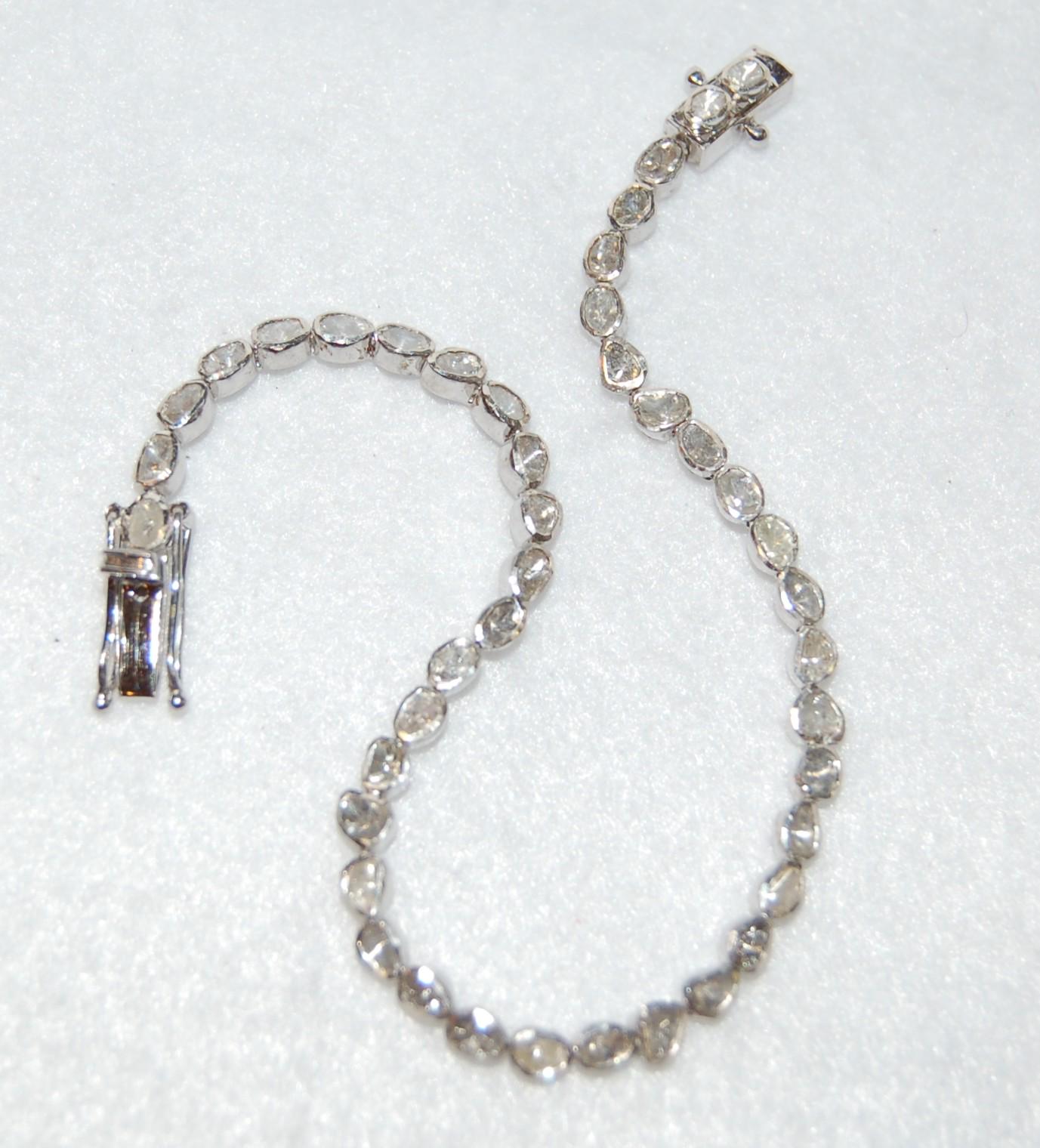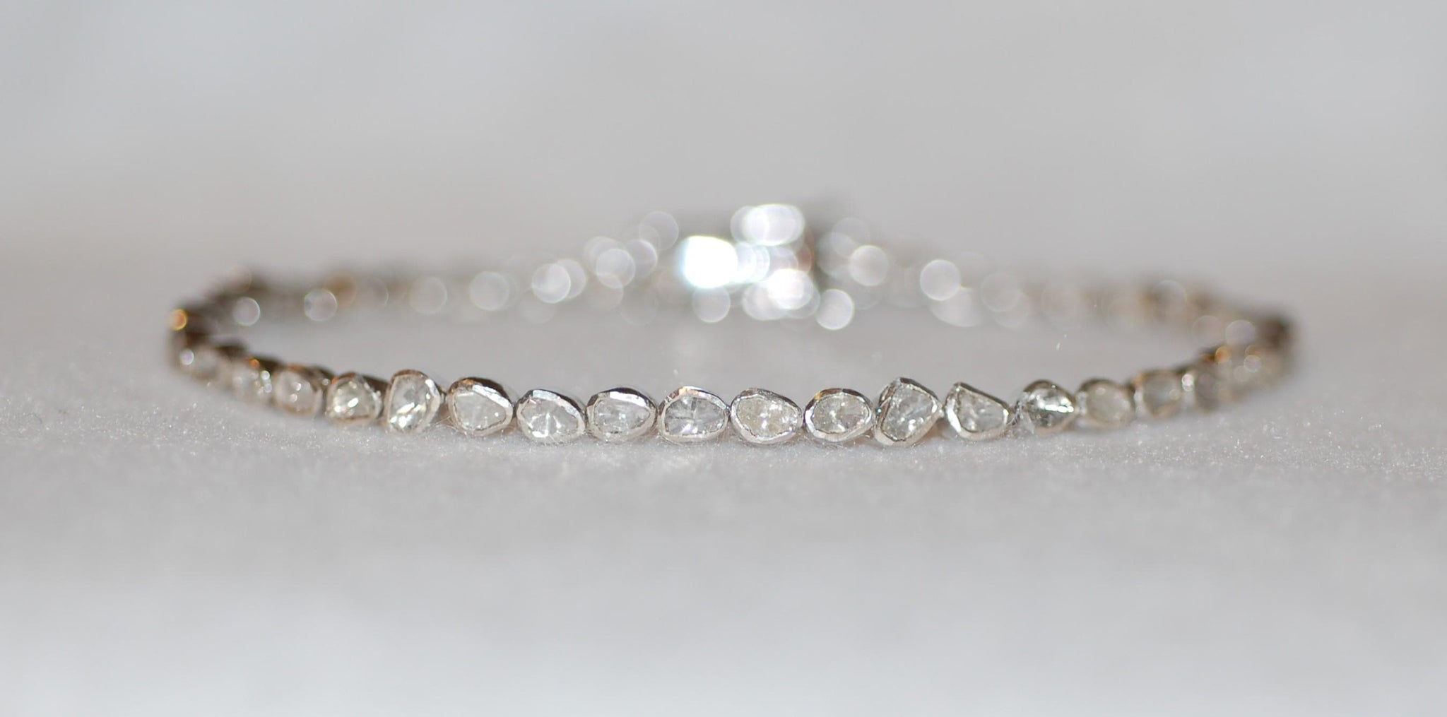 A fresh take on a classic! This a stunning diamond tennis bracelet features a continuous line of rose-cut diamonds. The diamonds have an organic, irregular shape rather than traditional round brilliants, giving the bracelet a modern and unique aesthetic. Each diamond is bezel-set rhodium plated sterling silver. The diamonds catch and reflect light beautifully, showing their natural clarity and brilliance. The overall effect is very elegant and contemporary, with the irregular diamond shapes creating visual interest while maintaining the classic tennis bracelet silhouette. This type of bracelet would be considered high-end fine jewelry, perfect for special occasions or as a statement piece. 1.35ct diamonds, sterling silver, rhodium plating, 8" long. Due to the type of diamonds, please note that they will have varying degrees of inclusions and other imperfections which make them of a kind.