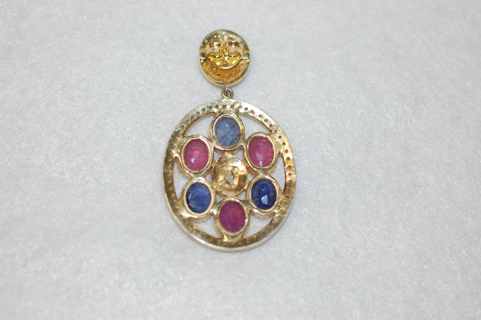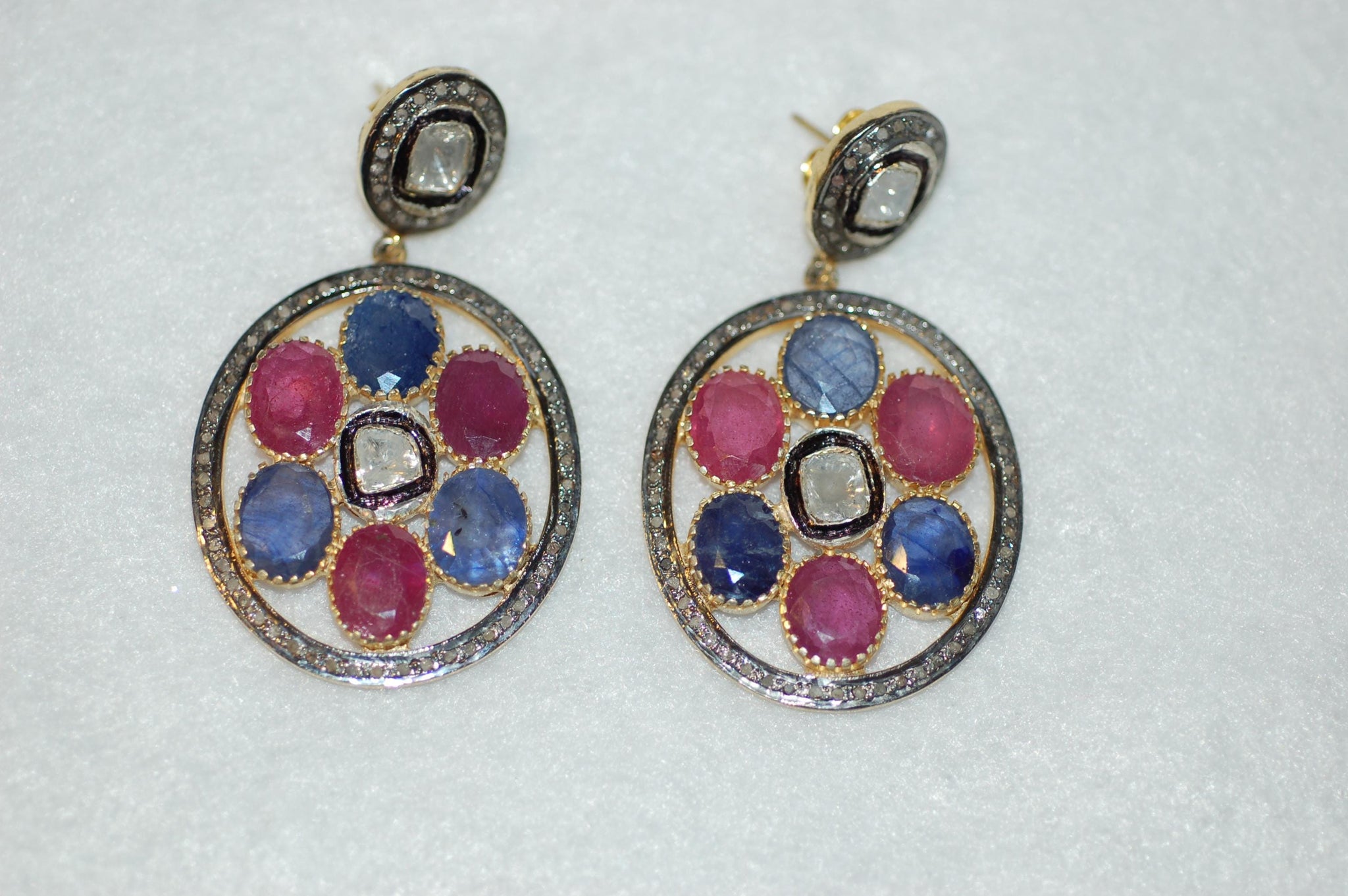 The bold and the beautiful! The earrings are elegant and ornate pieces of jewelry featuring a circular pendant design. Small oval-shaped studs with diamonds centers have a larger circular pendant hanging from them with more sapphires, rubies and diamonds.
