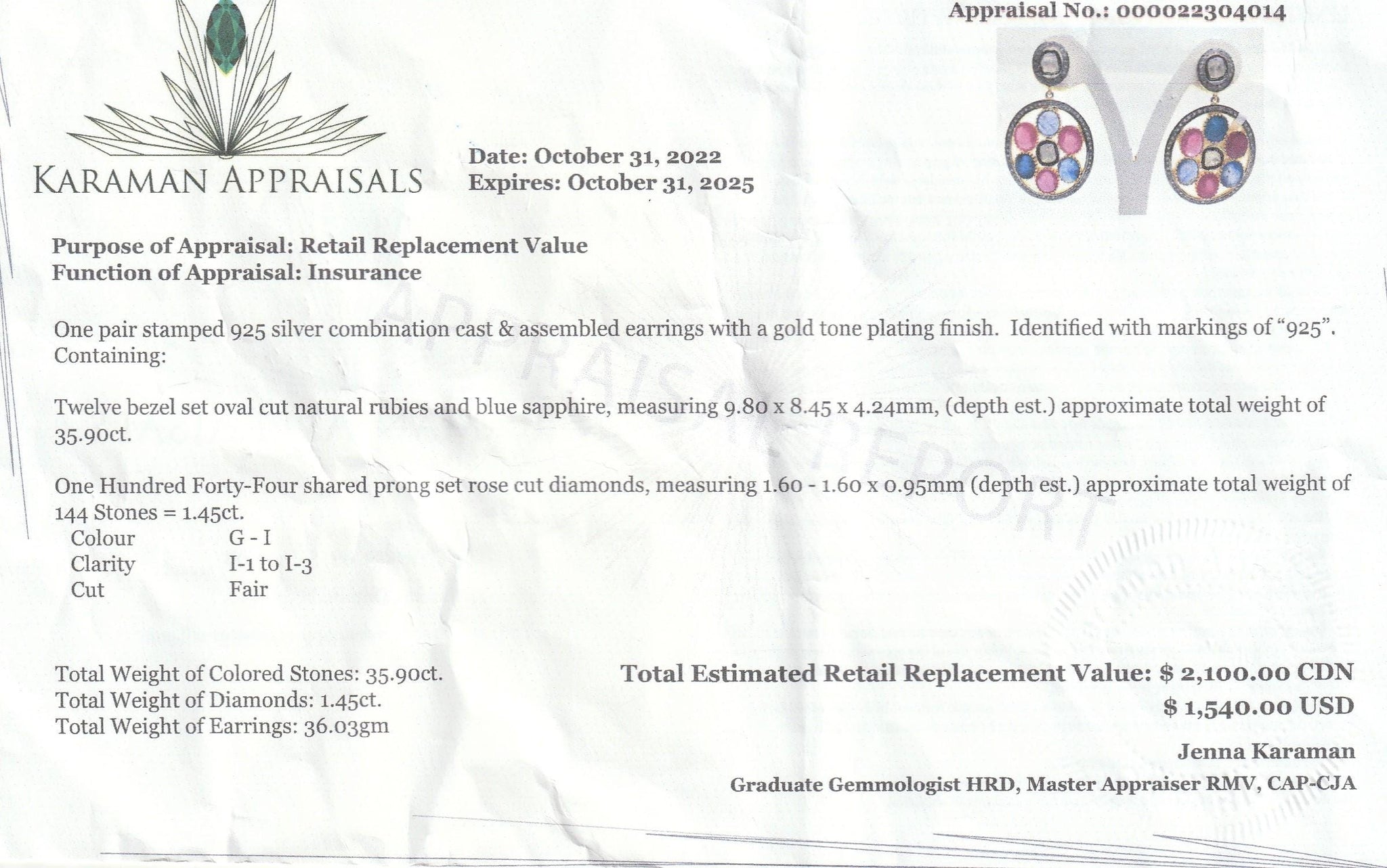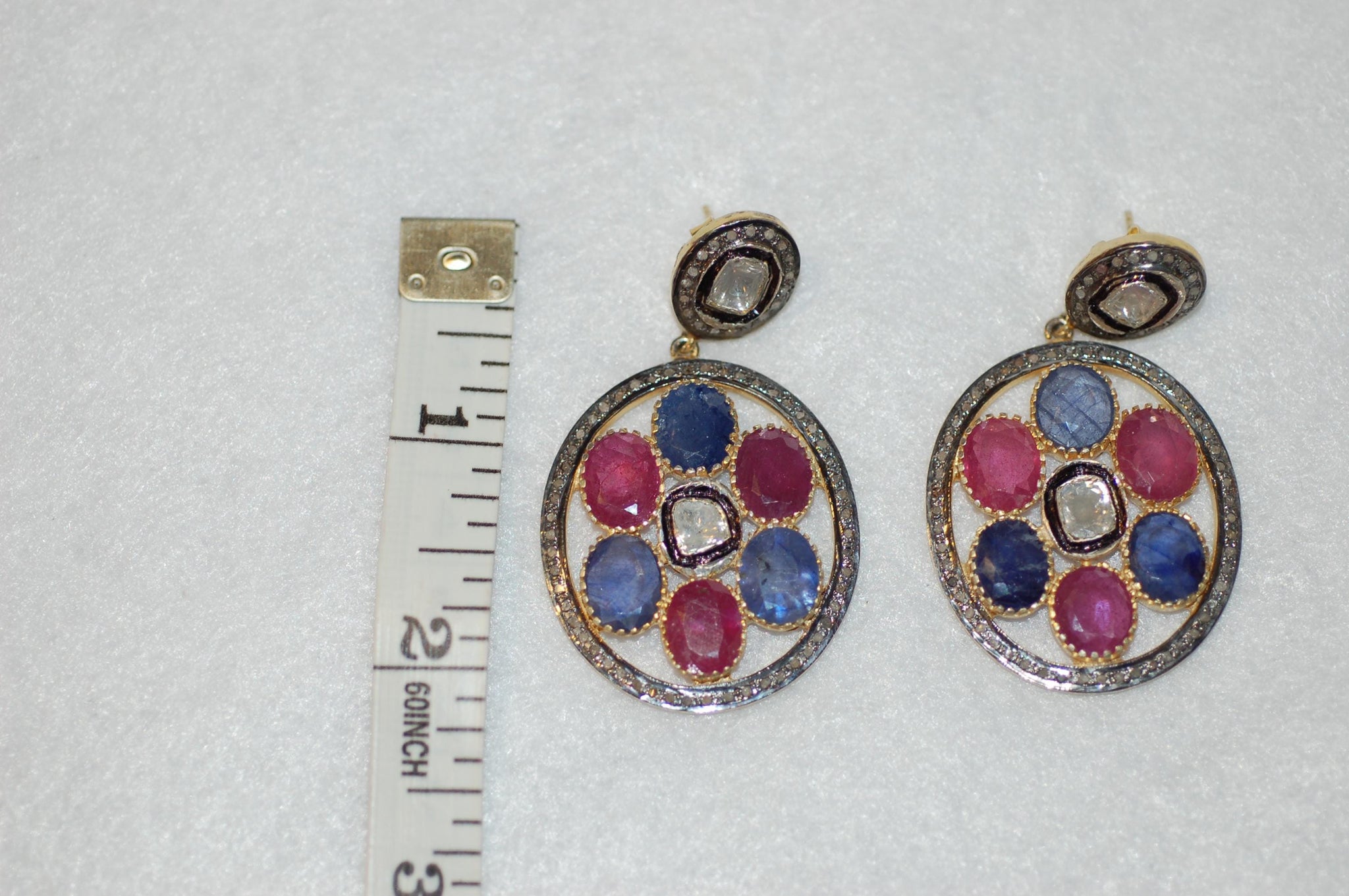 An outer ring of small diamonds encircles the entire design. This creates a floral or star-like arrangement within the circular frame. The combination of blue sapphires and pink rubies with the diamond centers stone and diamond accents gives these earrings a colorful, luxurious appearance. The earrings are made out of sterling silver and gold platting. The overall style blends traditional Indian or Middle Eastern influences with contemporary design elements, making them statement pieces that would likely be worn for special occasions or formal events. sapphire and rubies 35.9cttw, diamonds 1.4cttw, sterling silver, gold platting. Due to the type of diamonds, please note that they will have varying degrees of inclusions, other imperfections and color variations which make them of a kind.