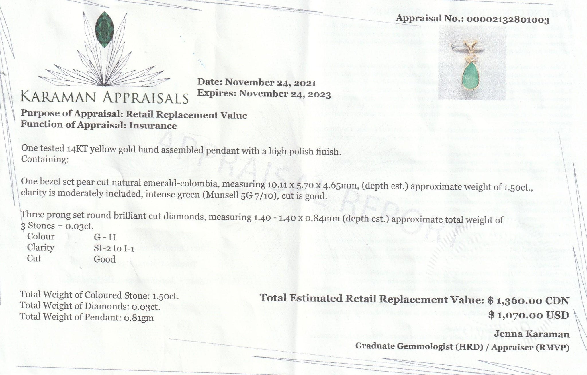 Gorgeous natural Columbian emerald teardrop shaped stone is bezel set in 14K yellow gold with three diamond accents. Simple and natural pendant that you will wear all the time. That's all you need. 1.5ct emerald, .03ct diamonds, 14k yellow gold, approx 3/4" long