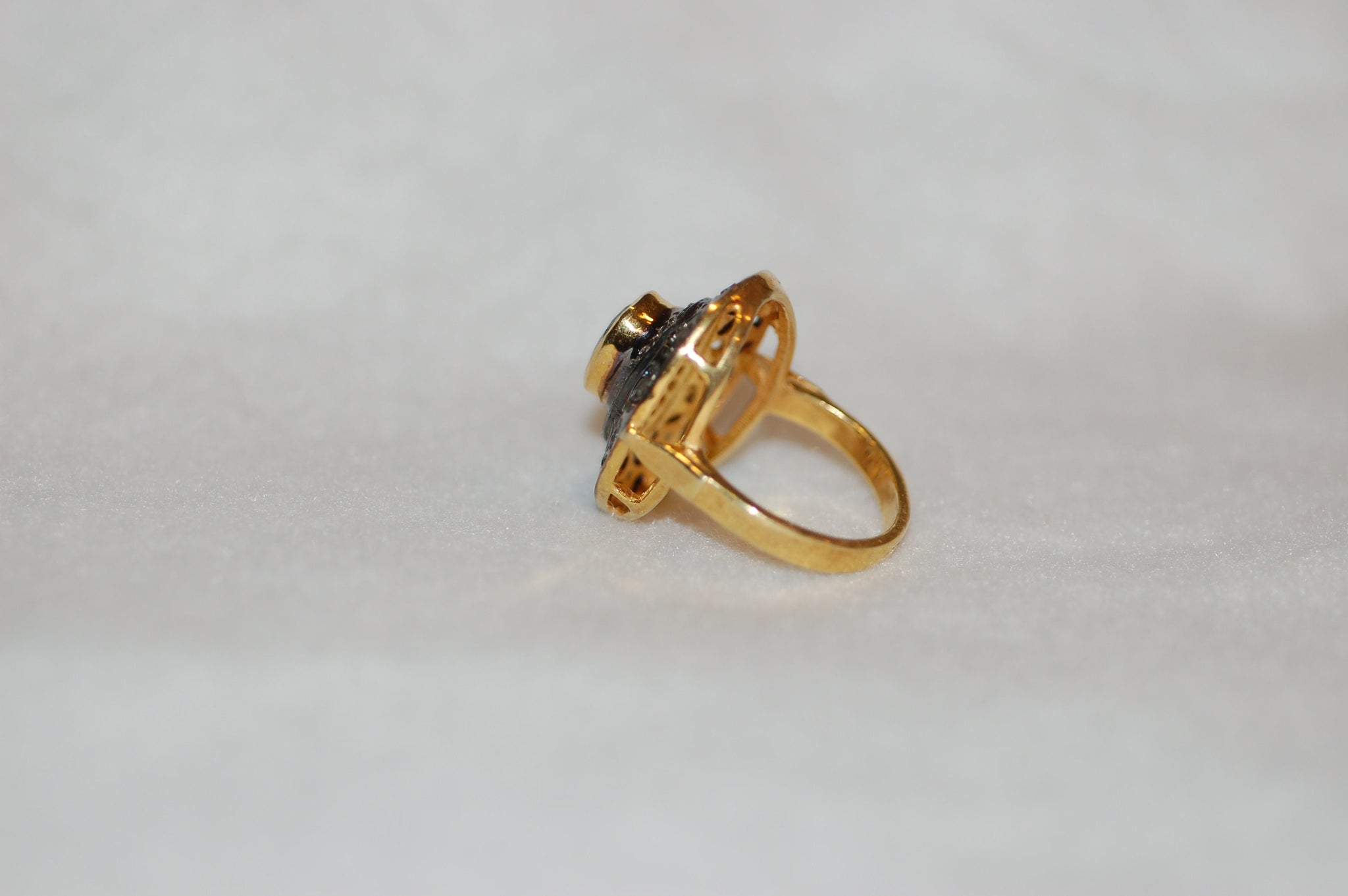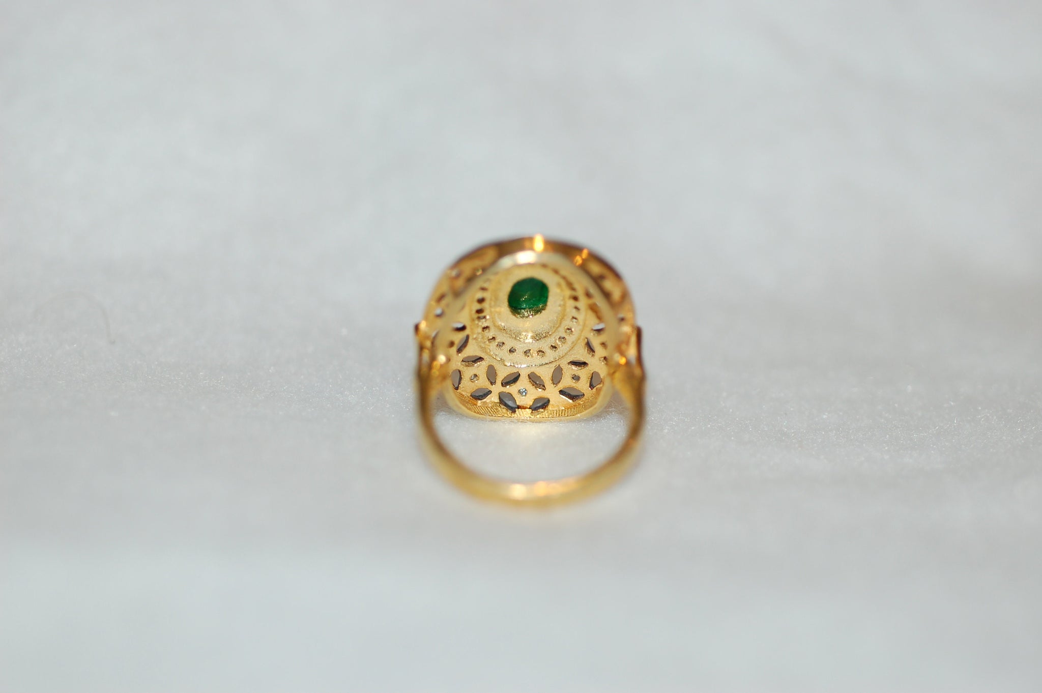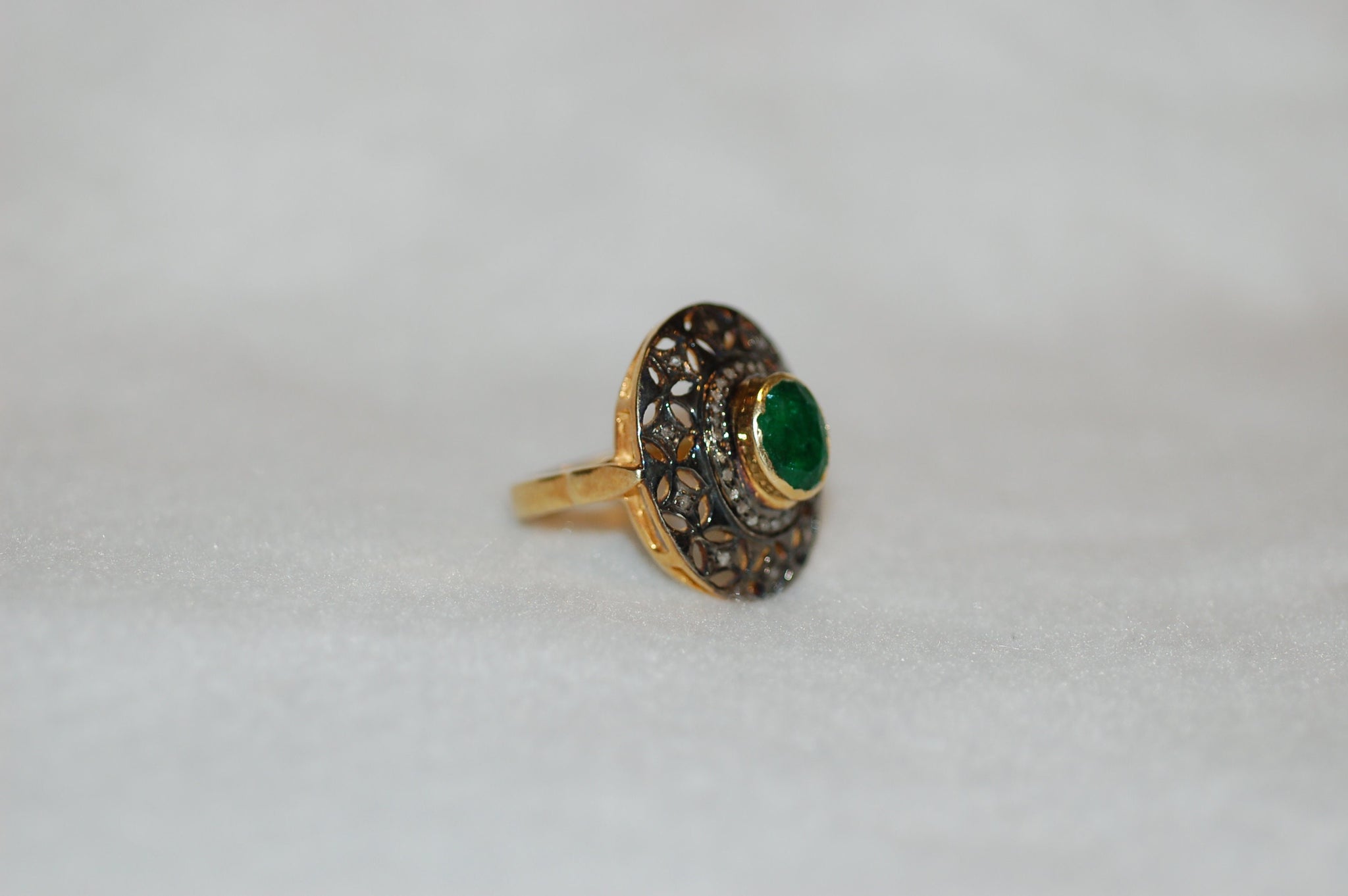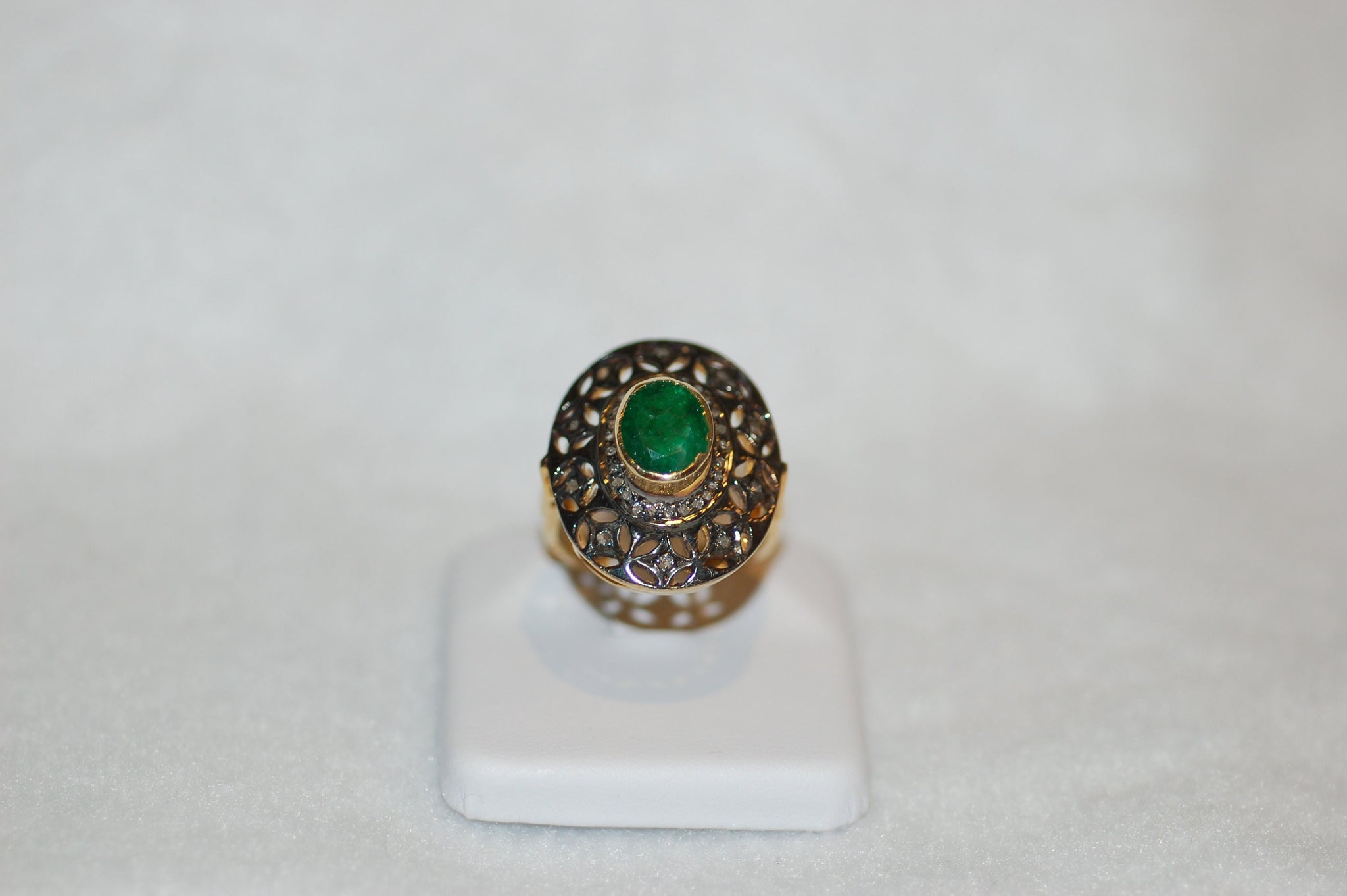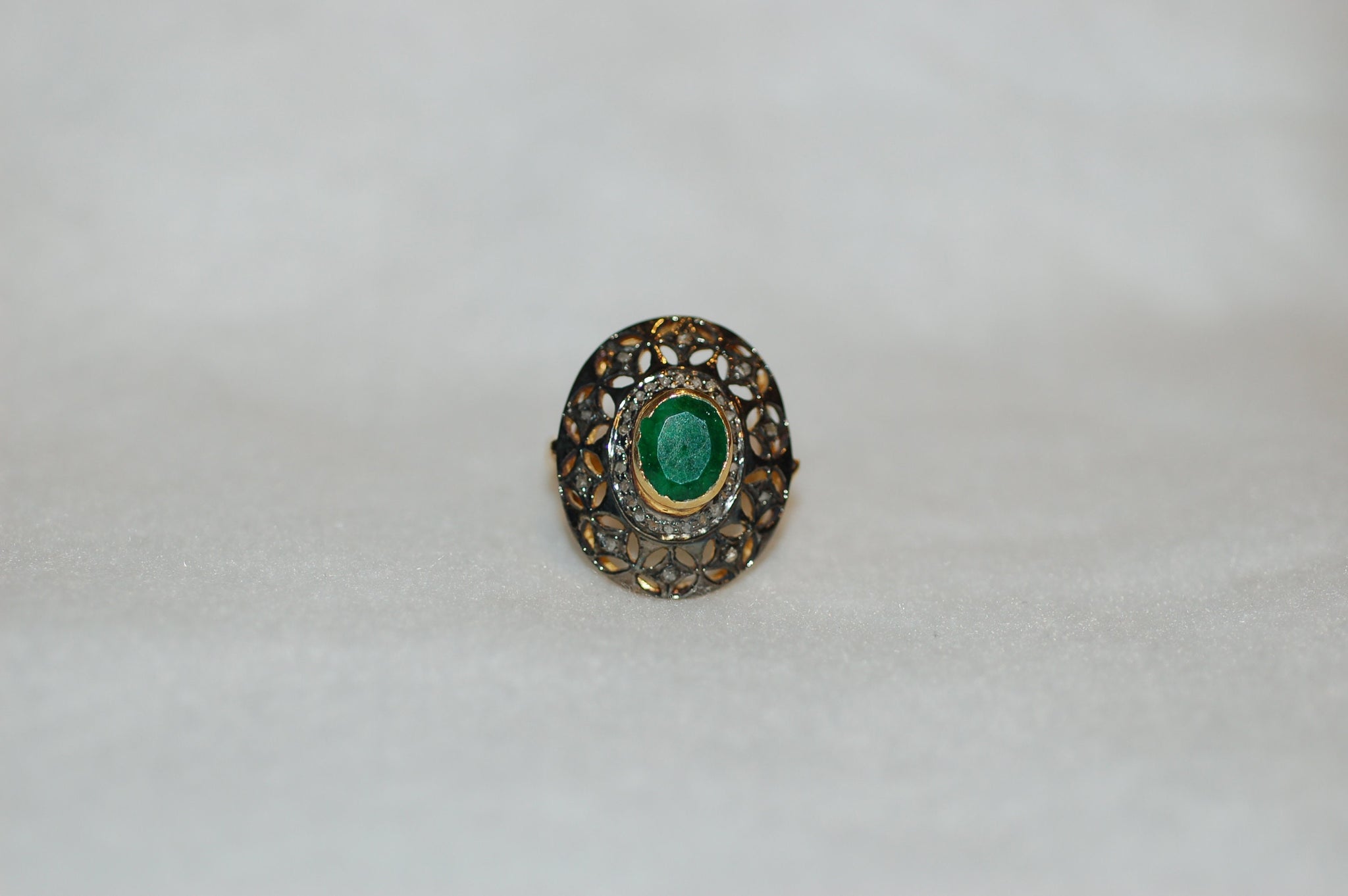 Gorgeous large natural oval emerald is surrounded by filigree studded in micro salt n pepper diamonds. The antique finish gives this ring a different look from all others. This ring is a conversation starter! 1.05ct emerald, .30 cttw diam, sterling silver, gold plating, size 7 3/4, please inquire for other sizes