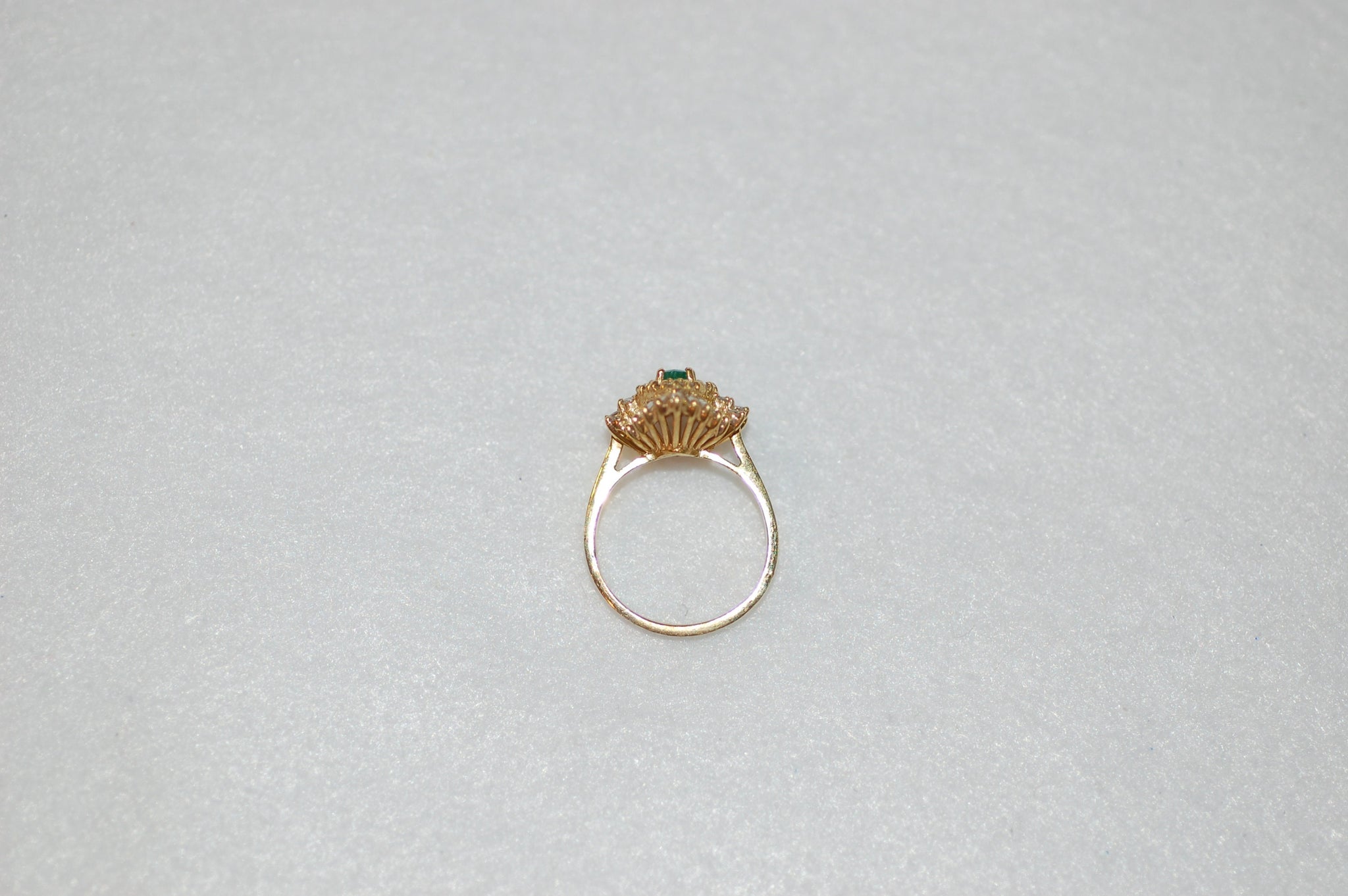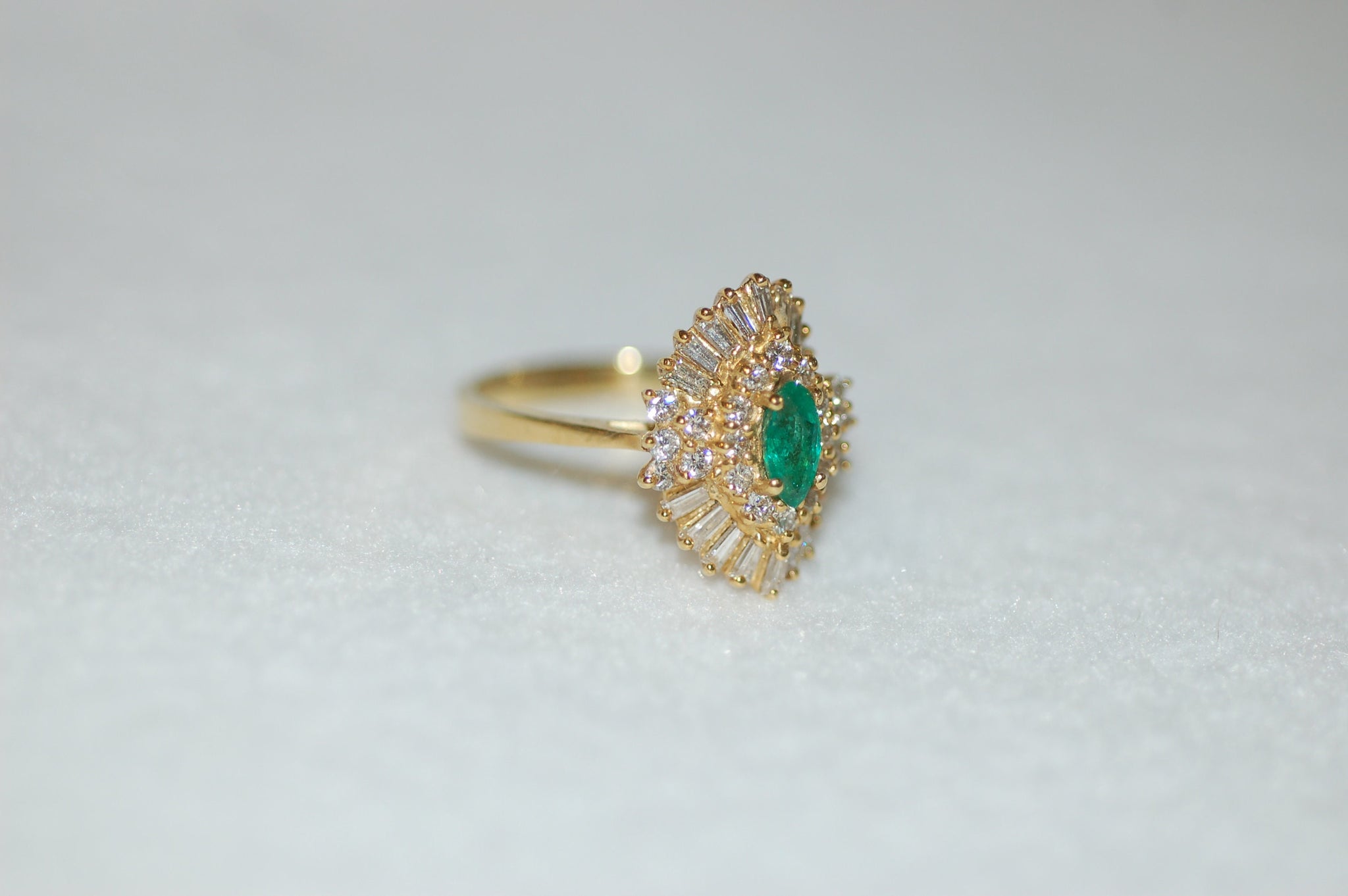 Natural emerald marquis is surrounded by rows upon rows of round and baguette diamonds! A statement piece for any occasion! Emerald .65ct, diamonds tw 1.4ct, 14K yellow gold, size 7, can be sized. please allow extra week for delivery.
