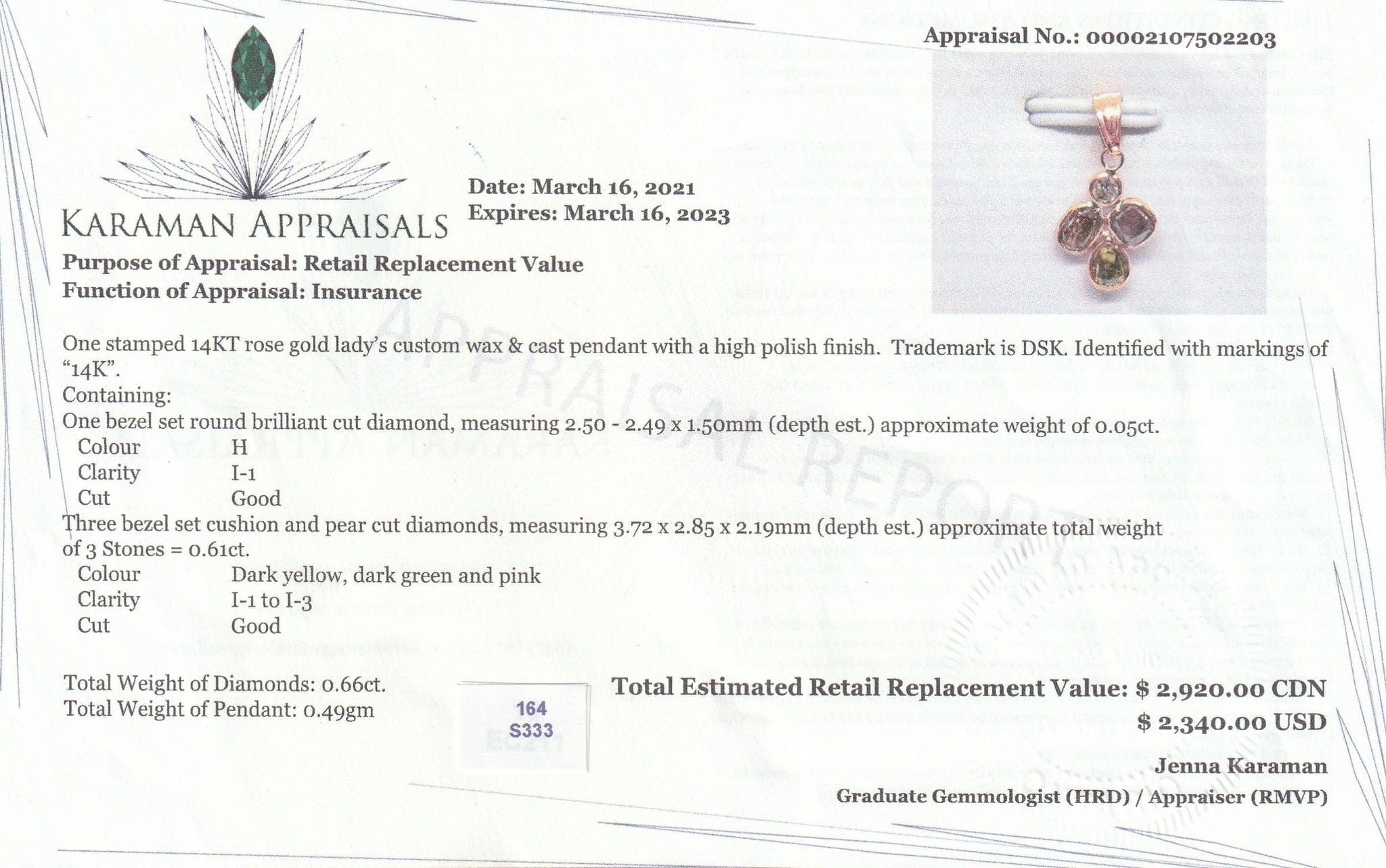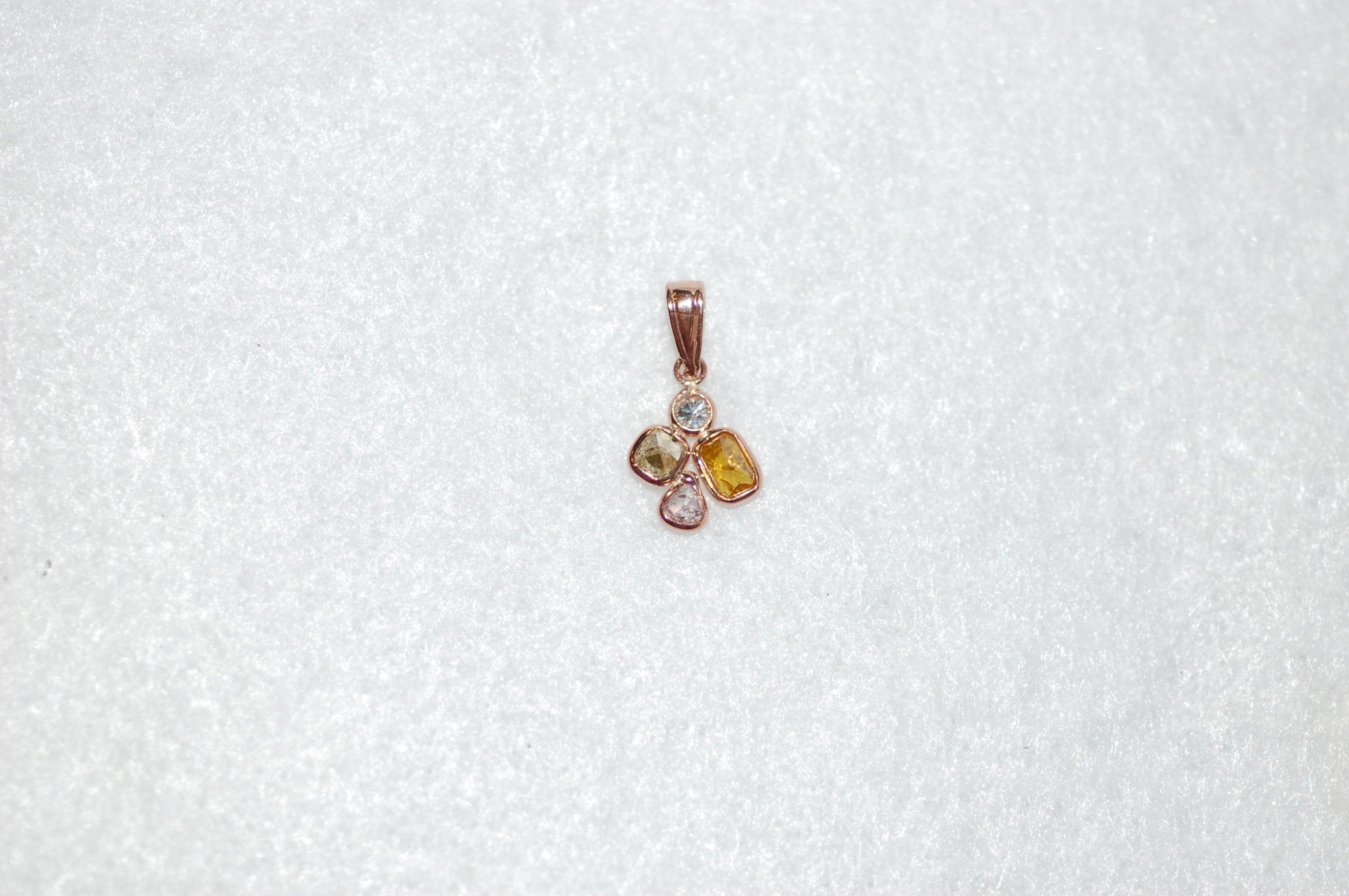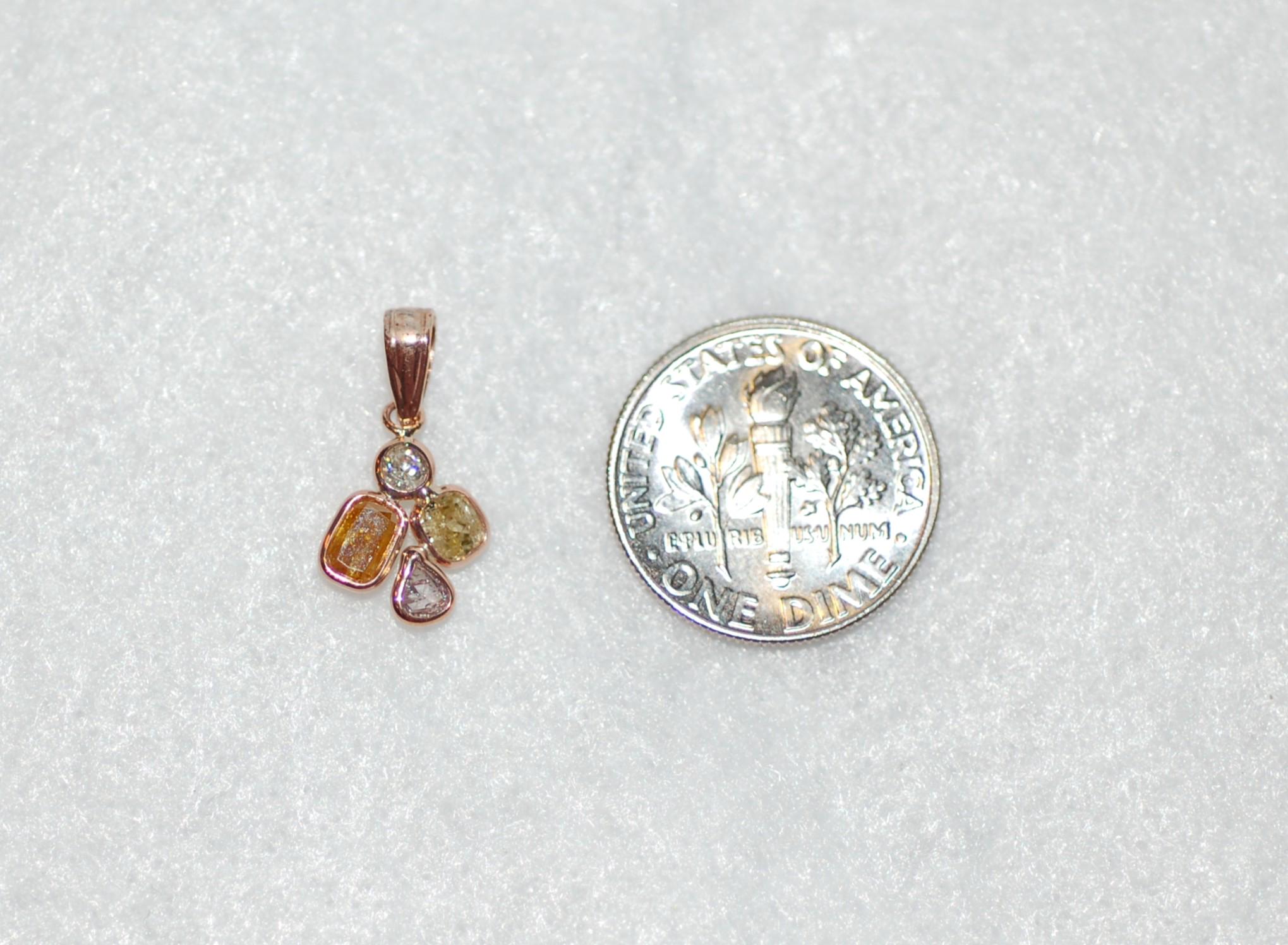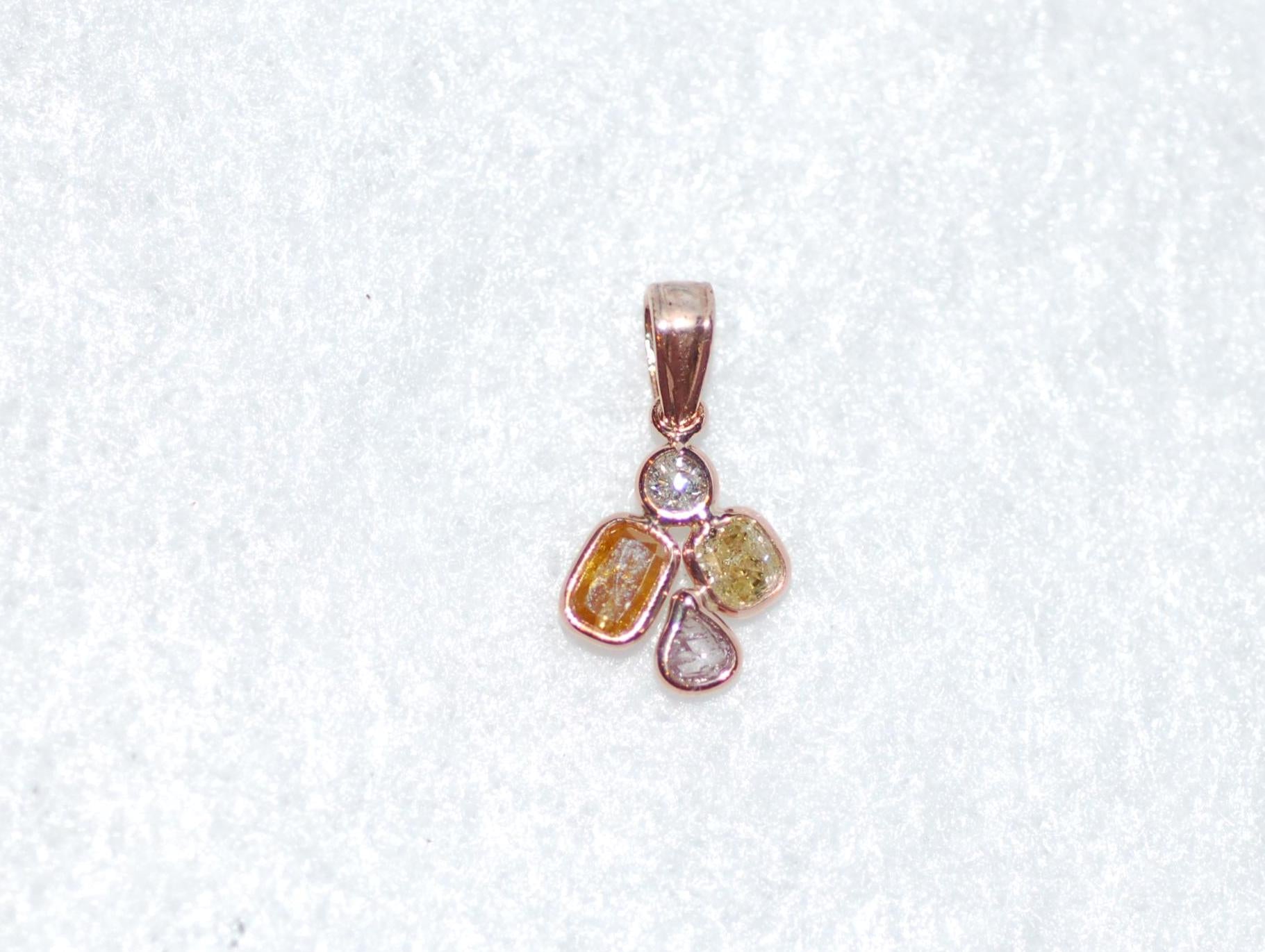 Absolutely adorable!! Fancy color diamonds are bezel set and are arranged in a round petal design to create a delicate pedant. Pale pink, white, yellow and orange diamonds create a beautiful natural form. A stunning look! .60cttw diamonds, 14K rose gold, w/o chain $1300.
