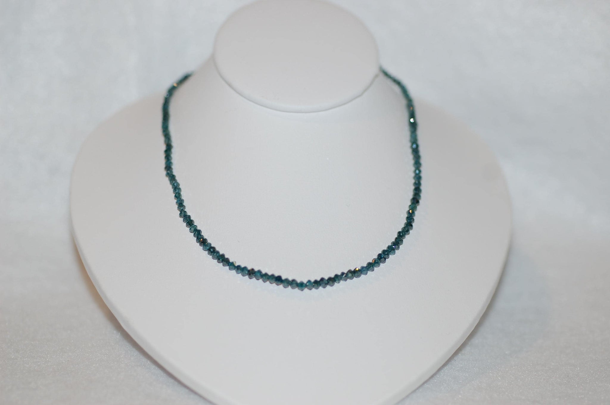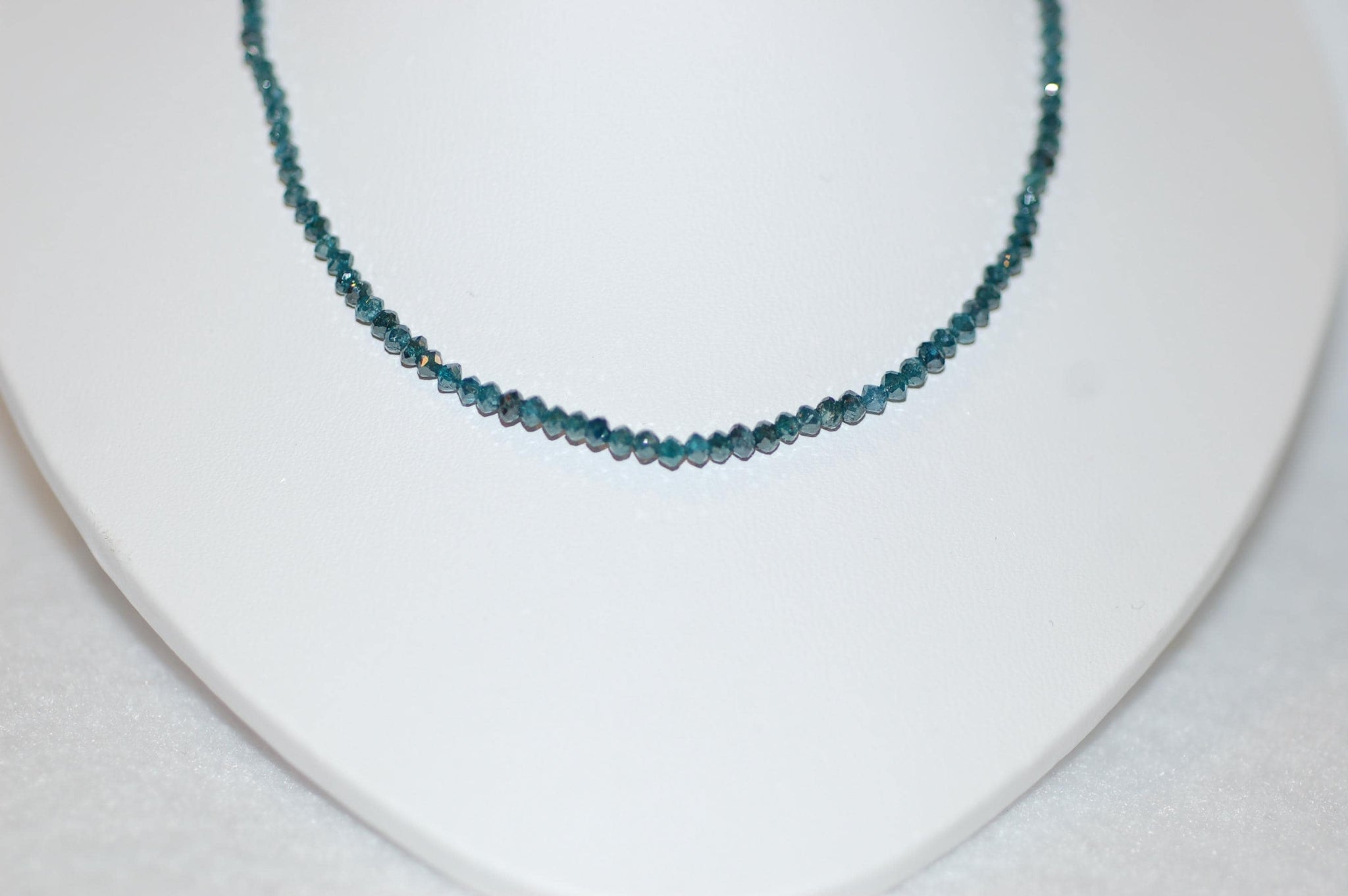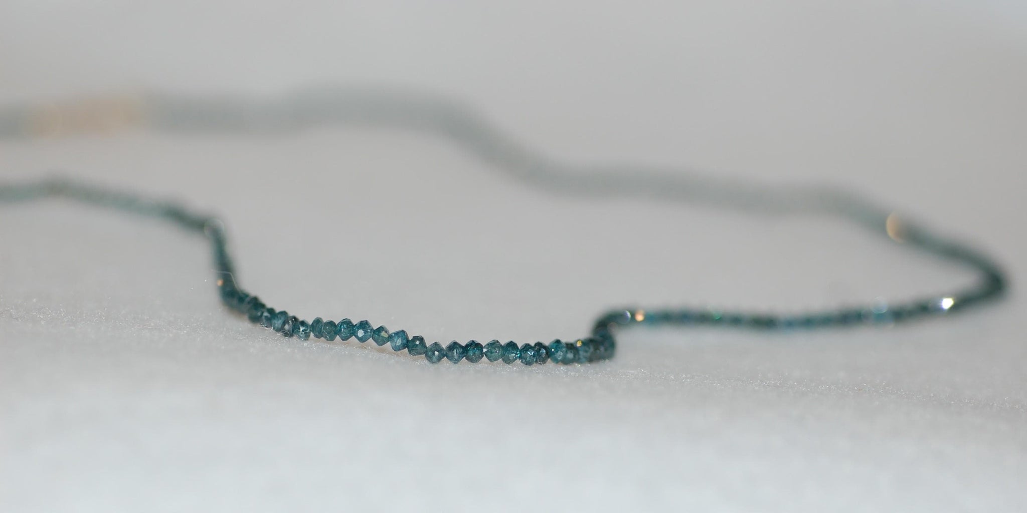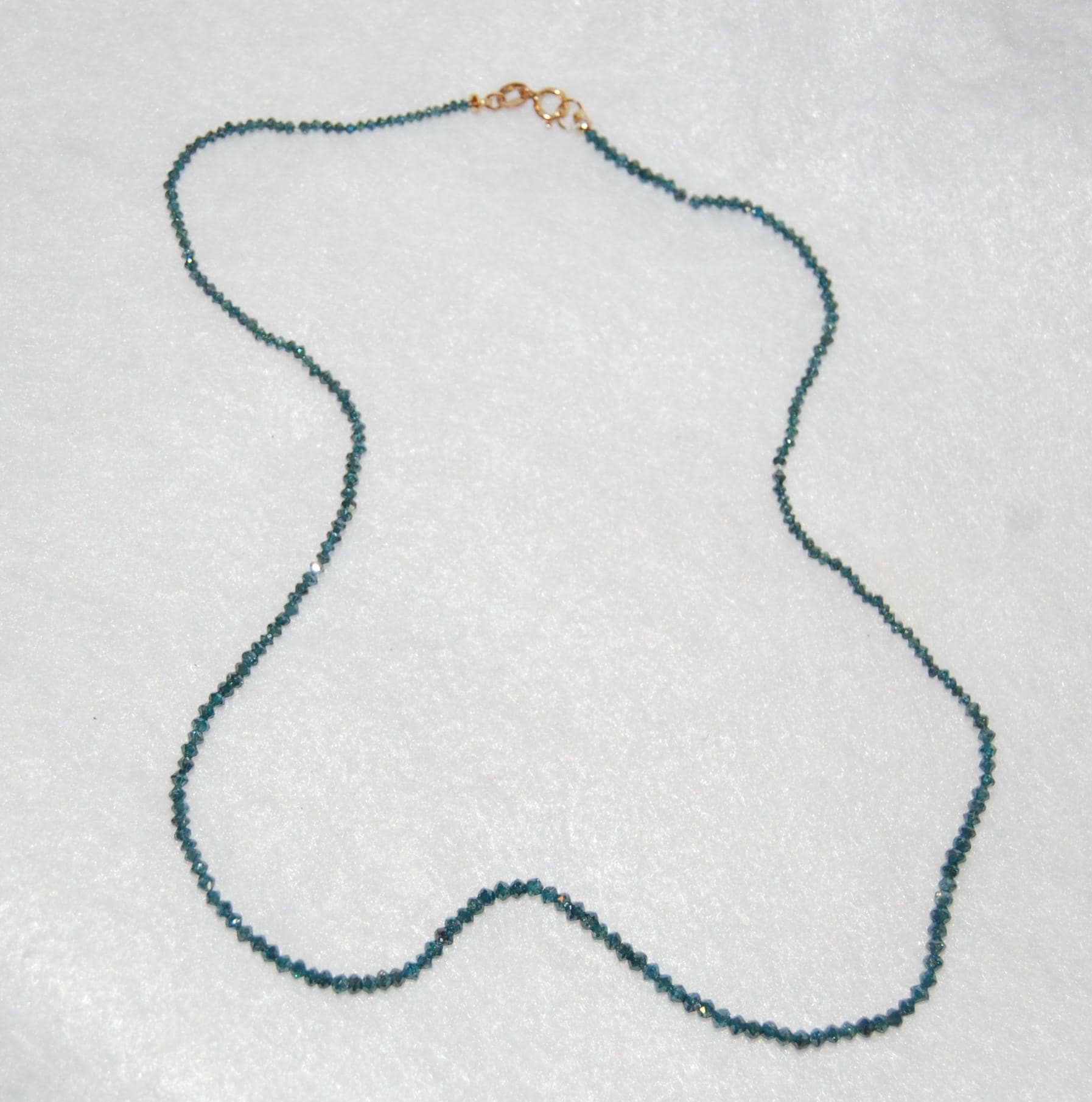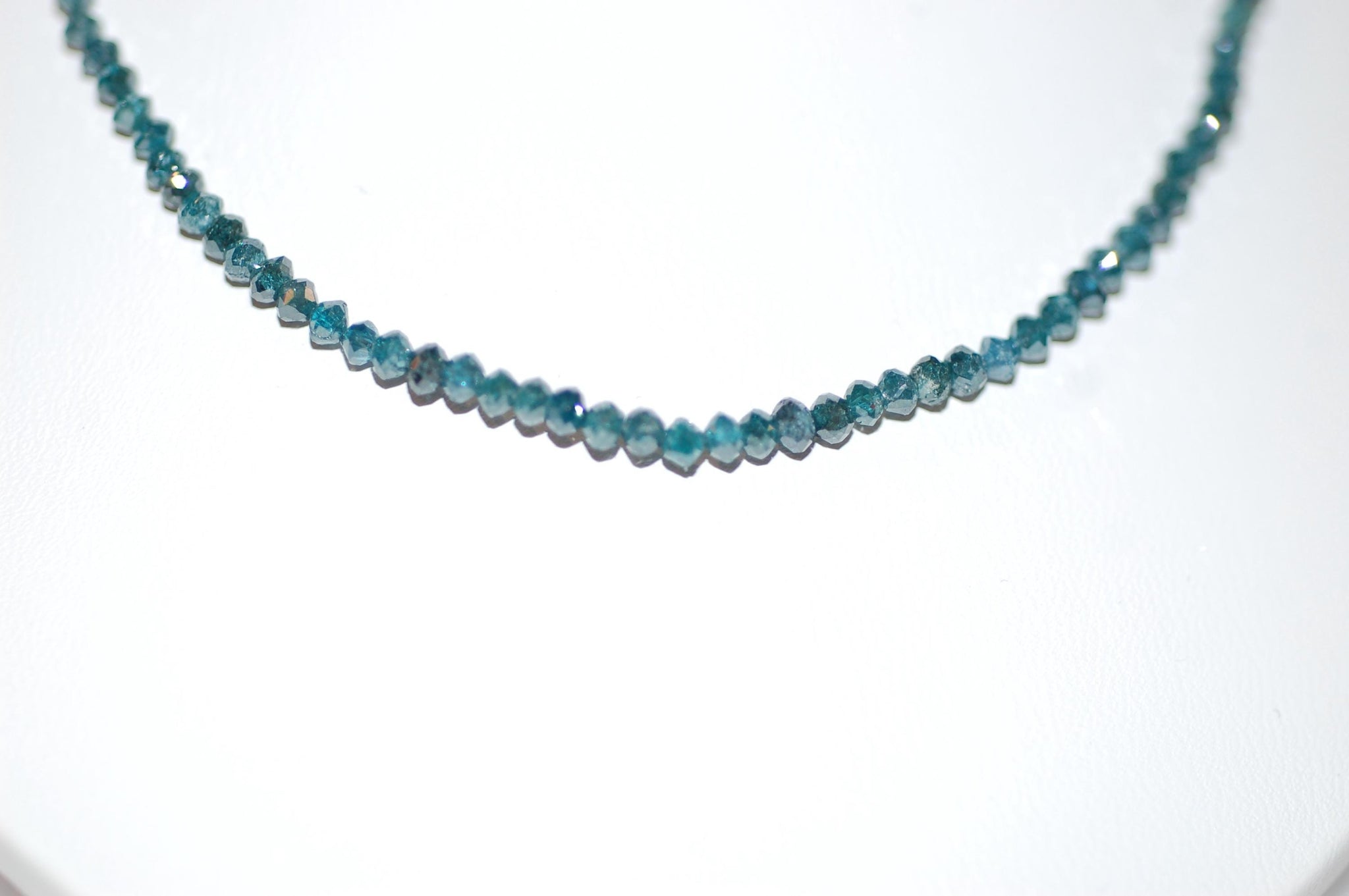 This gorgeous diamond bead rivière necklace is a work of art. Subtly graduating teal blue diamond beads will adorn your neck and make you feel like royalty. This is a very special piece for that special person. 13.5ct diamonds, 10K yellow gold, approx 16" long, color enhanced. Please note that the diamonds will have varying degrees of inclusions, other imperfections and color variations which make them one of a kind.