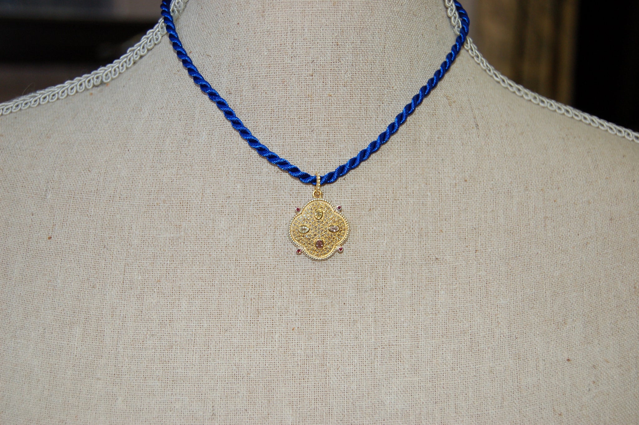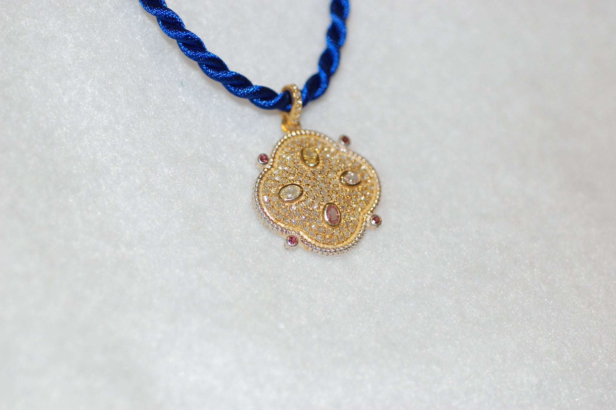 This fancy diamond pave pendant must be yours! Oval and round colored diamonds are set against white pave diamonds bring the colors of both. The clover shape of the pendant is reminiscent of antiquity. A unisex piece that looks like a million! includes either a blue or red 16" satin cord. inquire for longer cords for men. colored diamonds, white diamonds, gold plated over silver