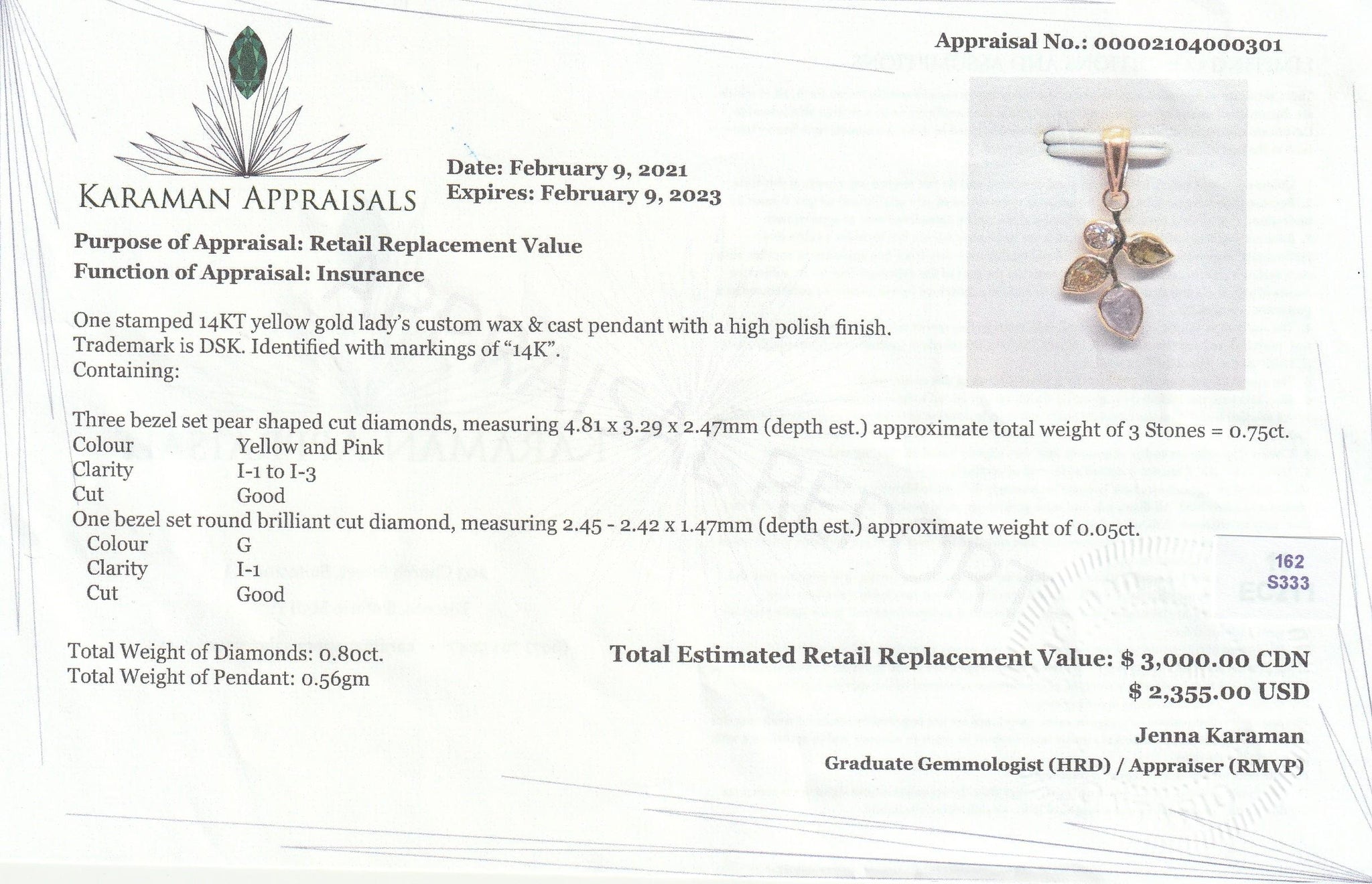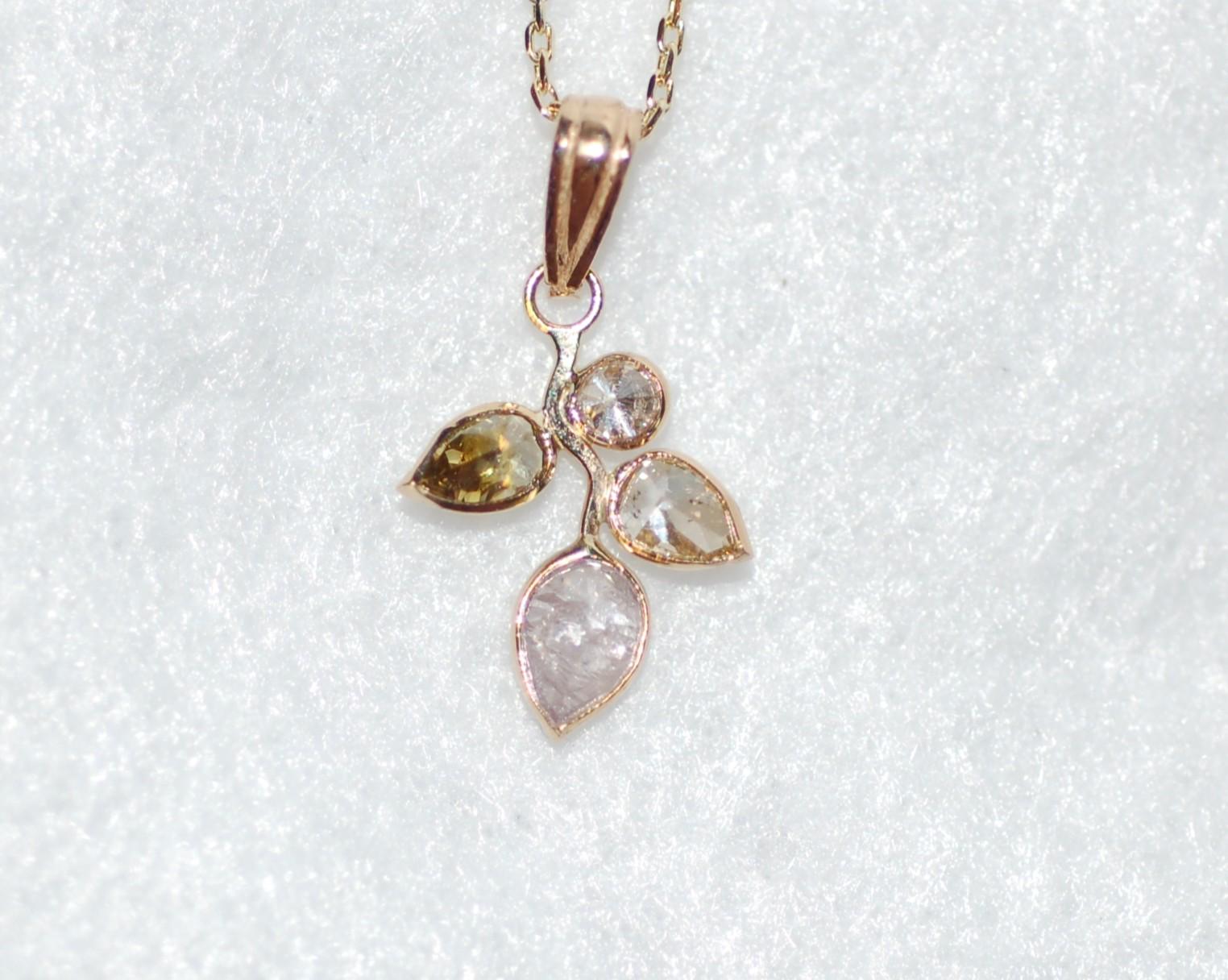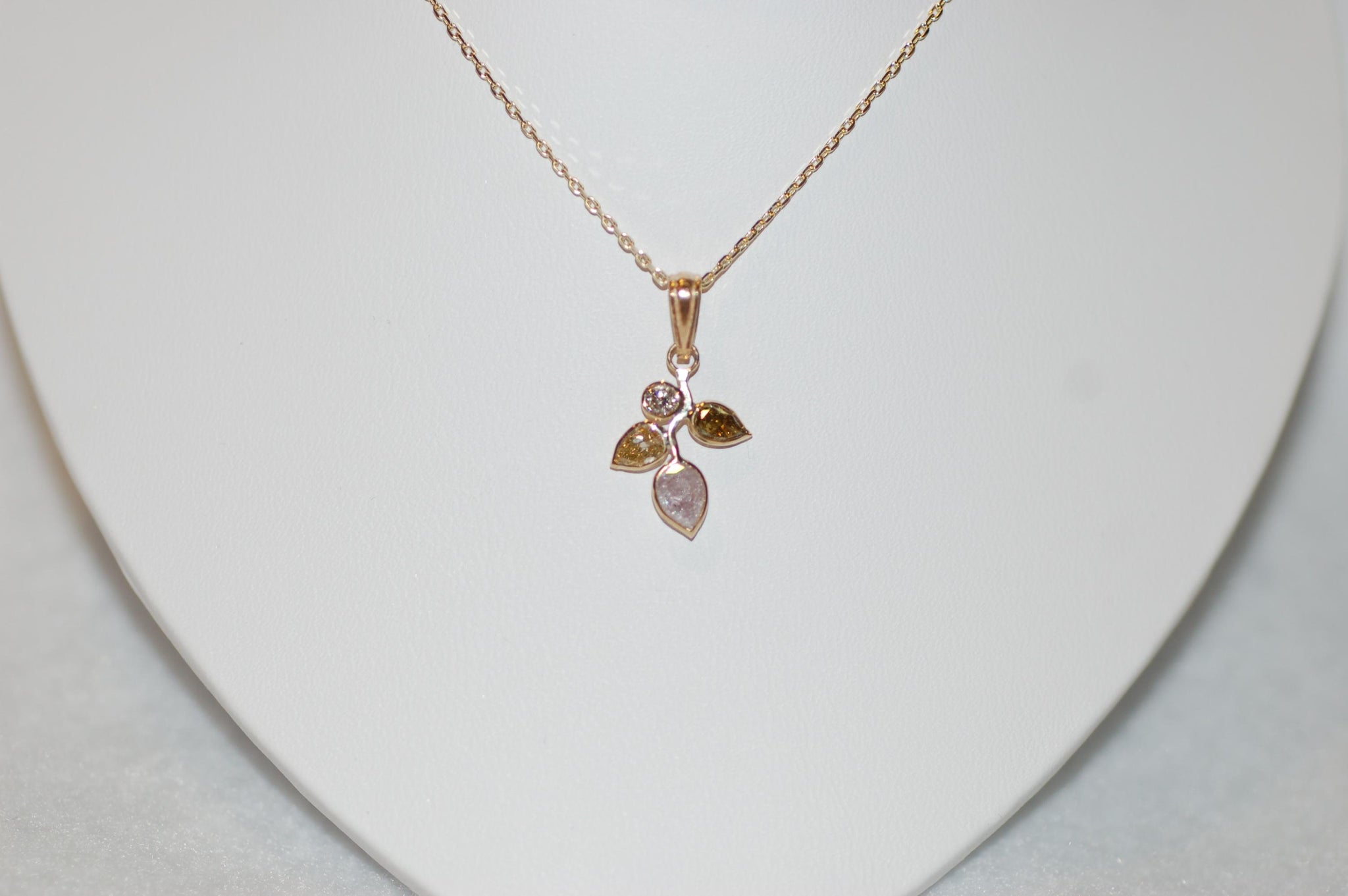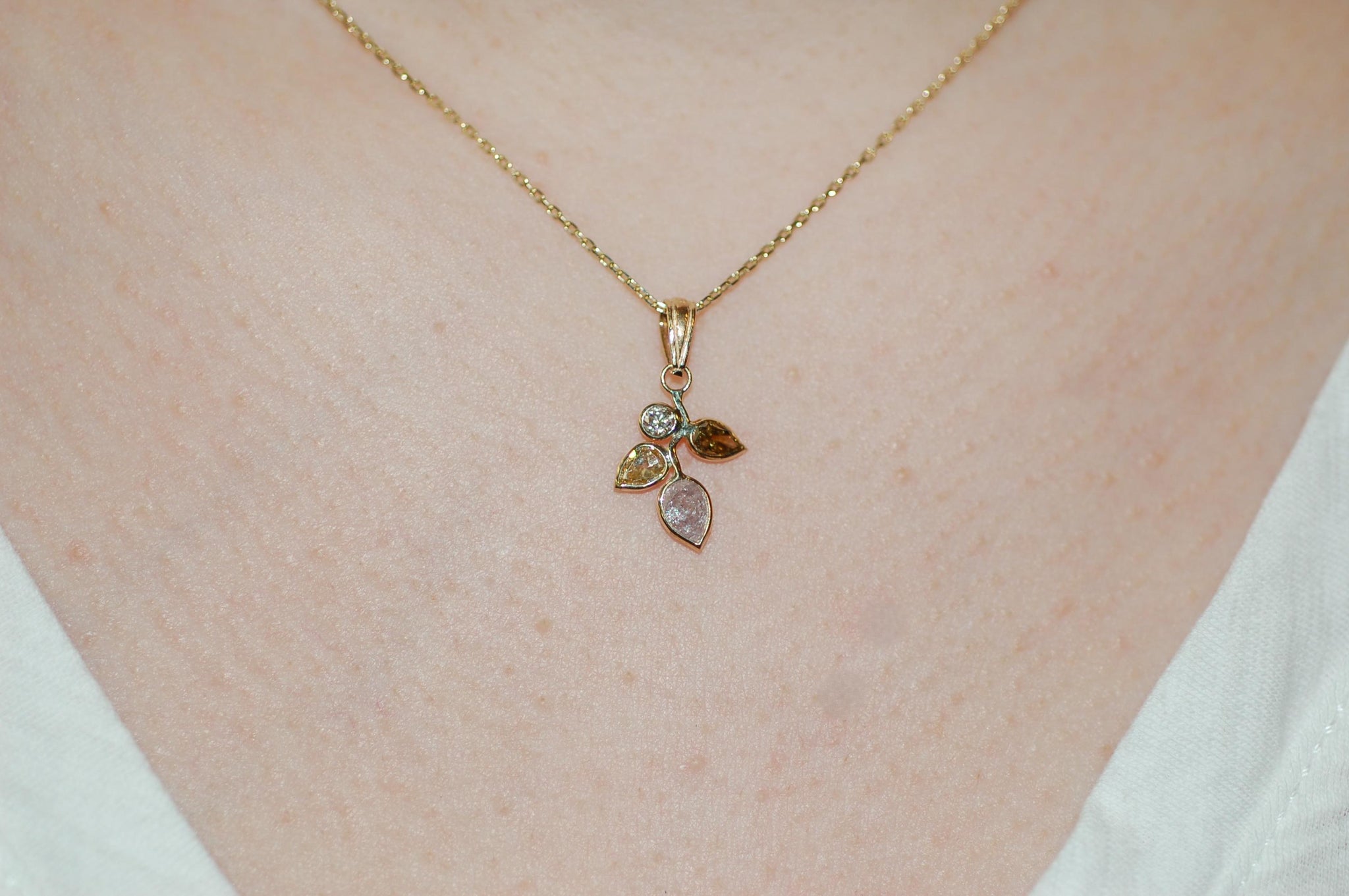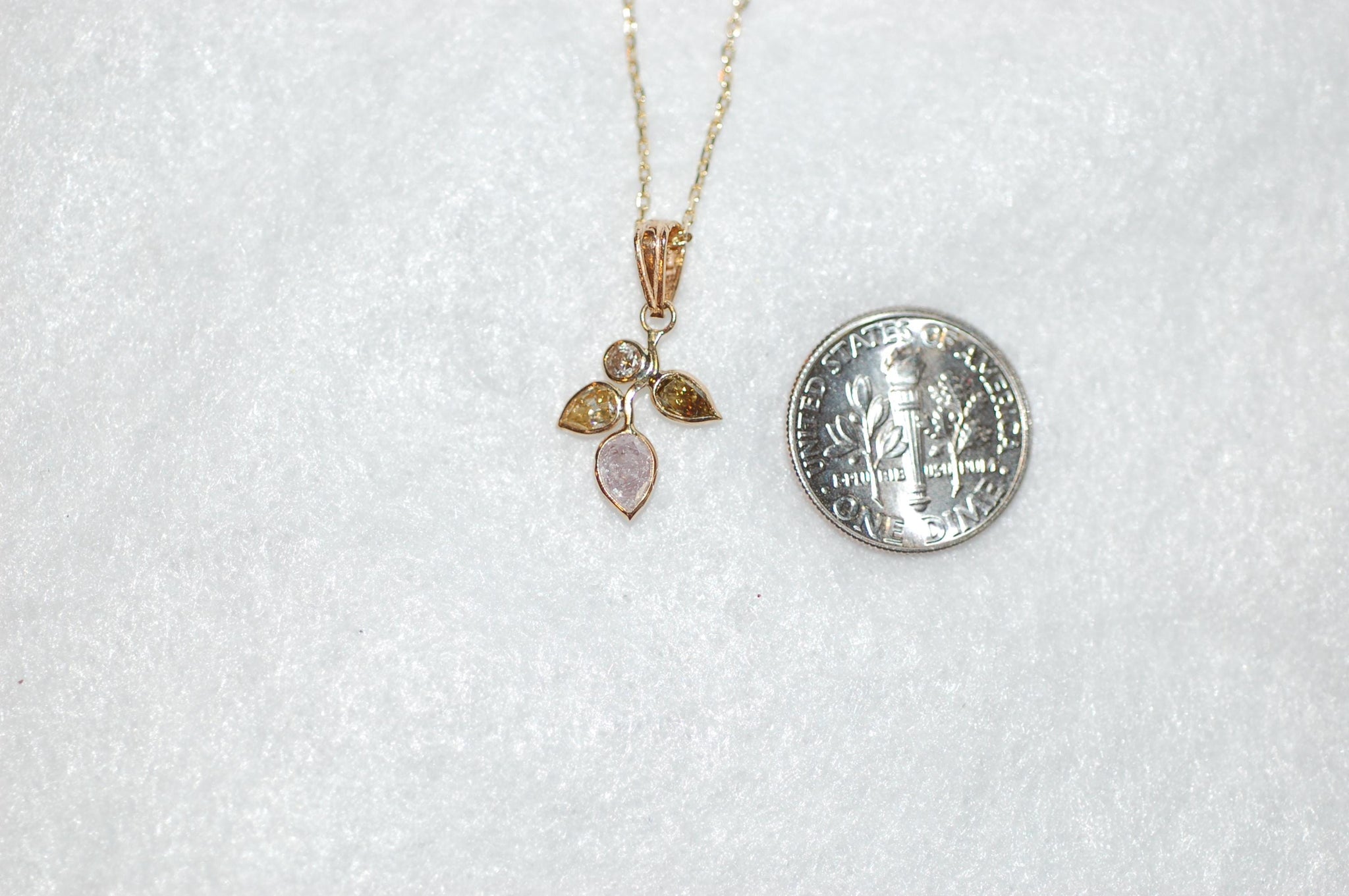 Absolutely adorable!! Fancy color diamonds are bezel set and are arranged in a pointy leaf design to create a delicate pedant. Pale pink, white, yellow and cognac diamonds create a beautiful natural form. A stunning look! .80cttw diamonds, 14K yellow gold, 16" chain
