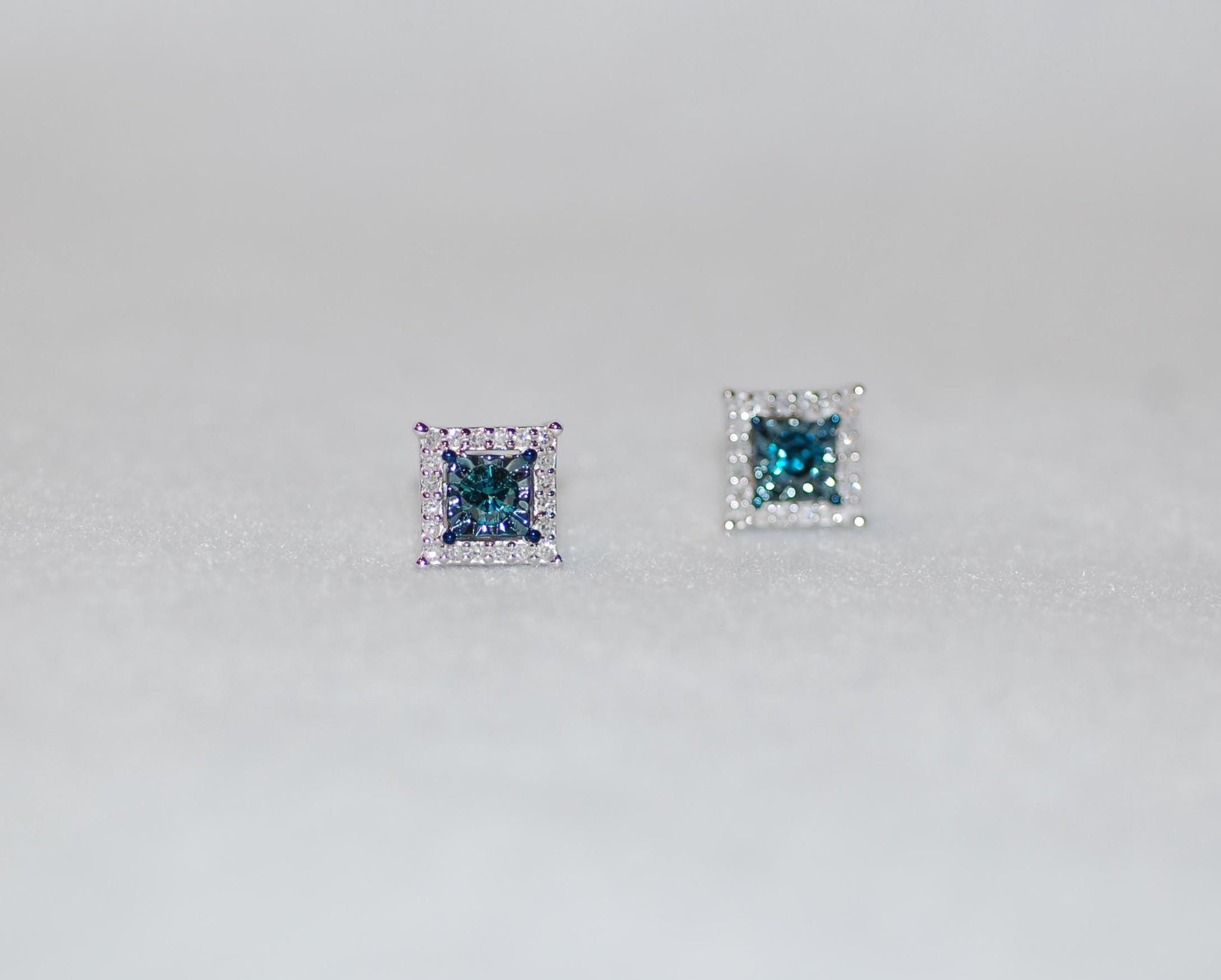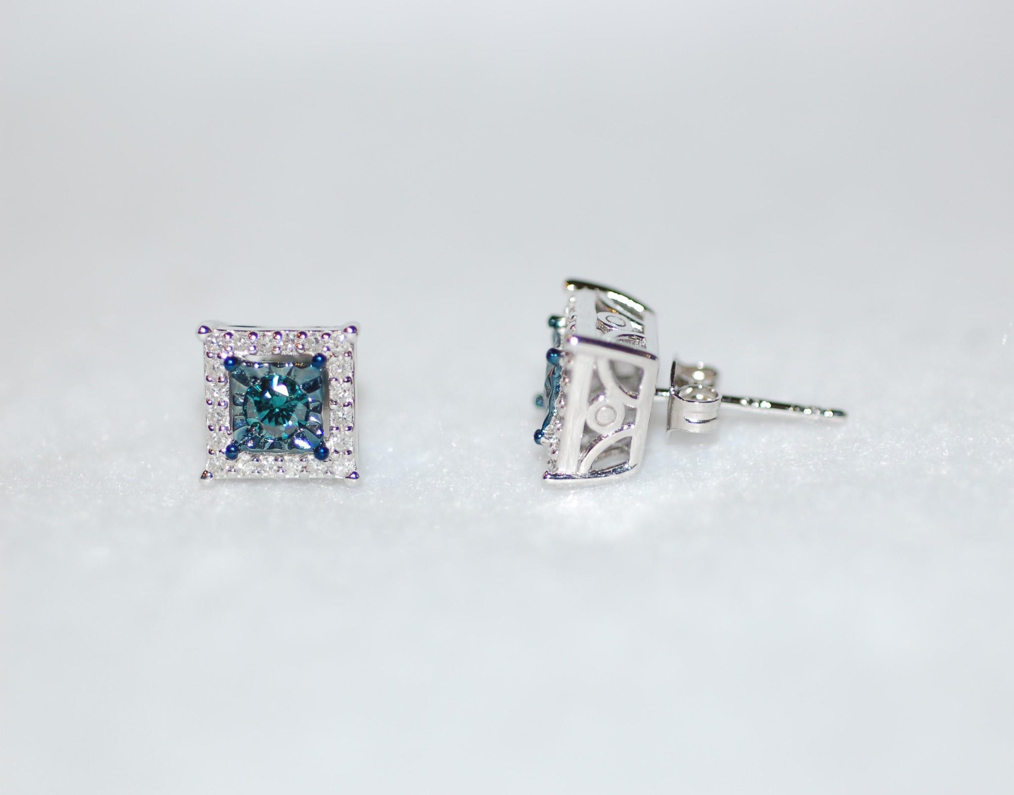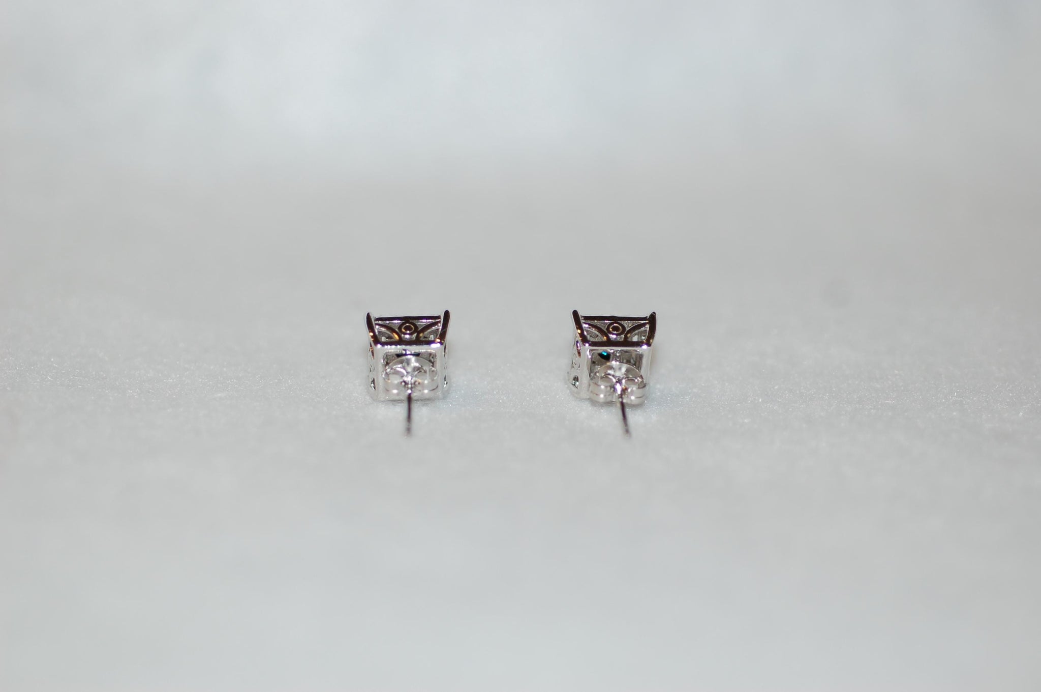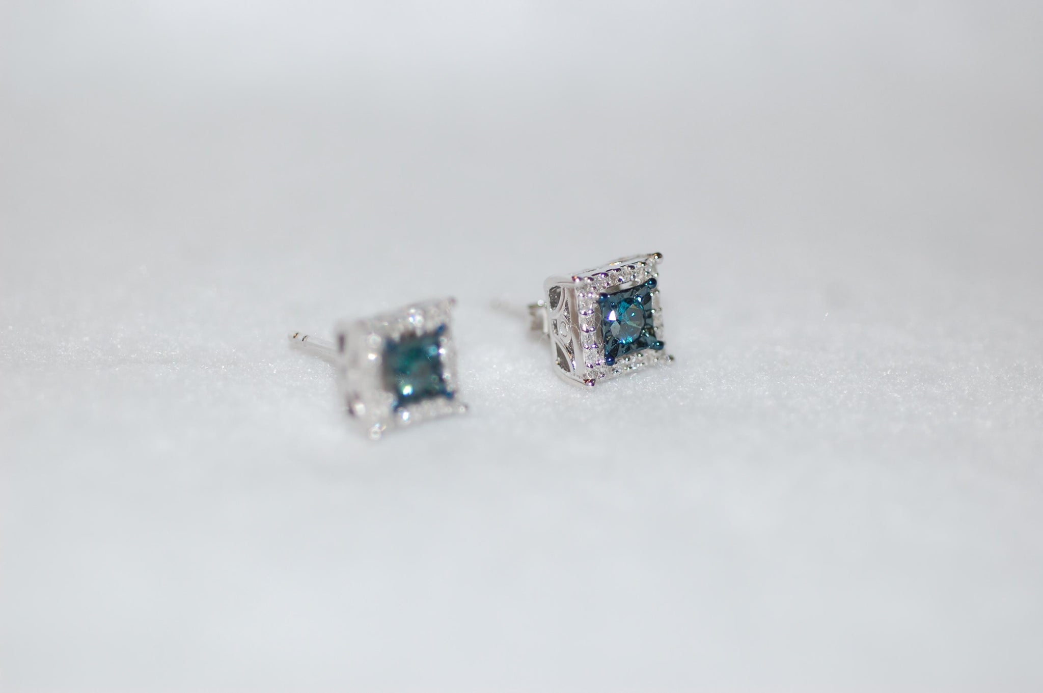 Stunning statement making stud earrings! Gorgeous princes cut blue diamonds and white round cut diamonds are set in a sterling silver filigree setting. Absolutely lovely earrings that will make anyone smile. 1cttw diamonds, sterling silver
