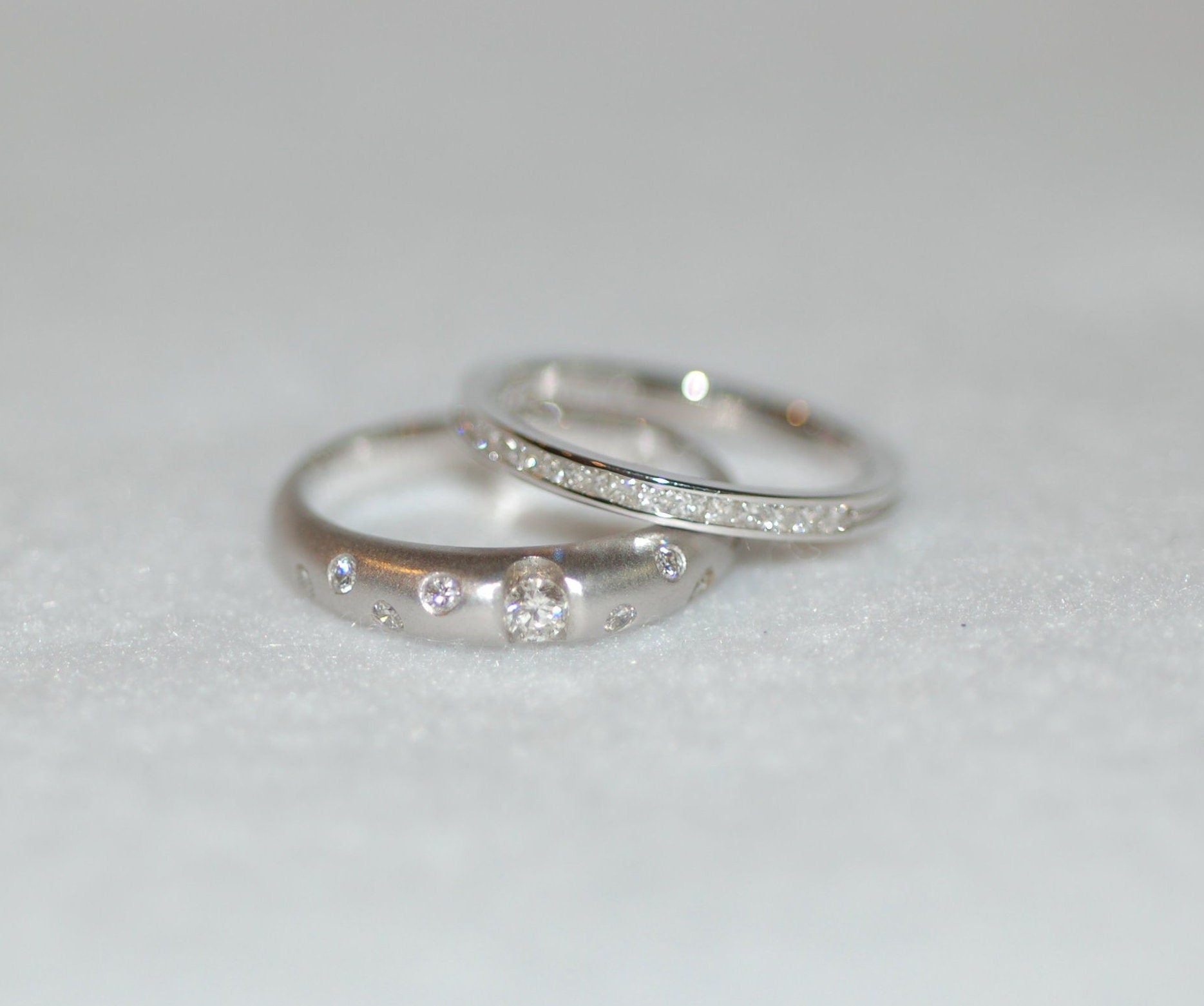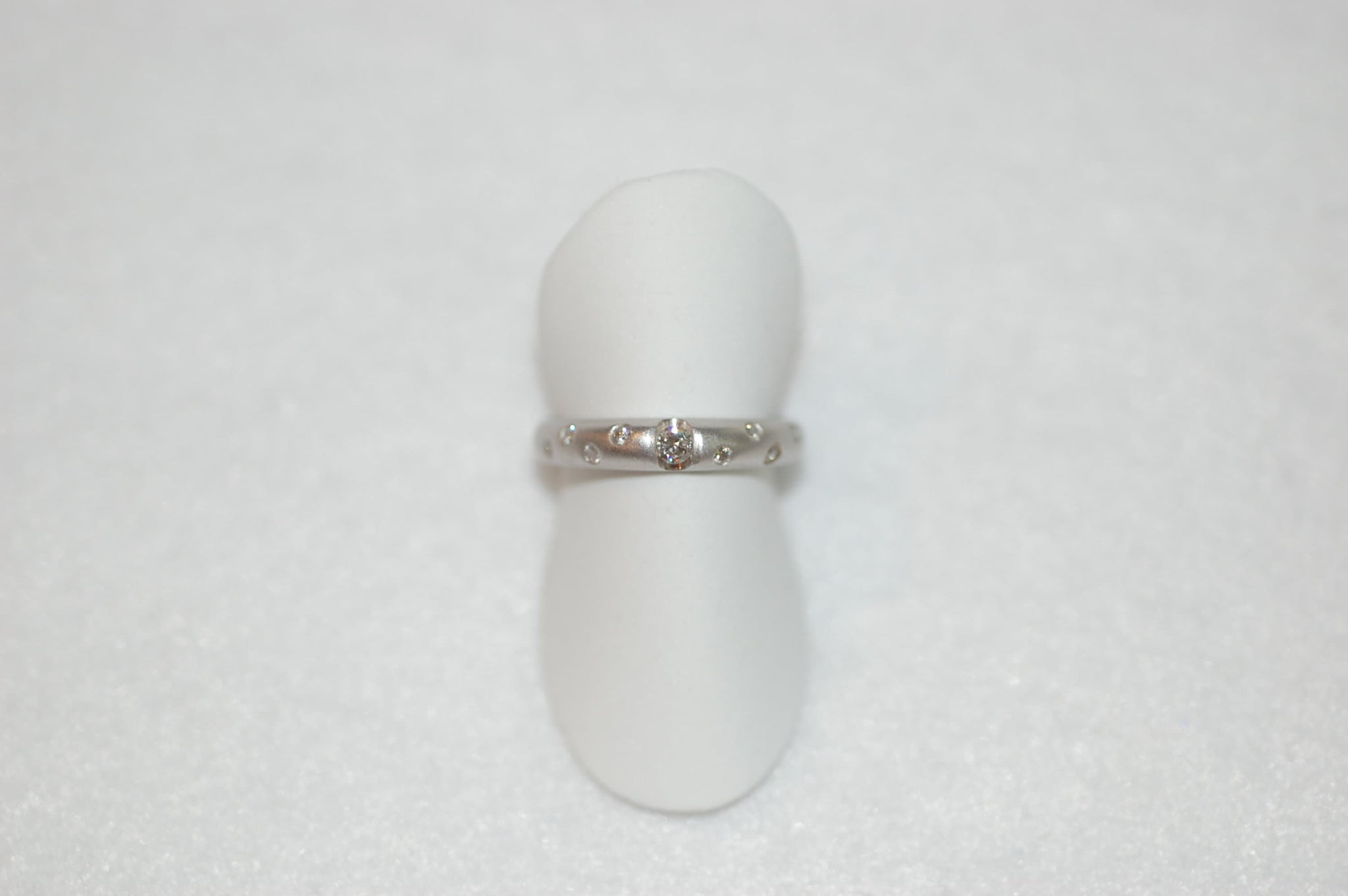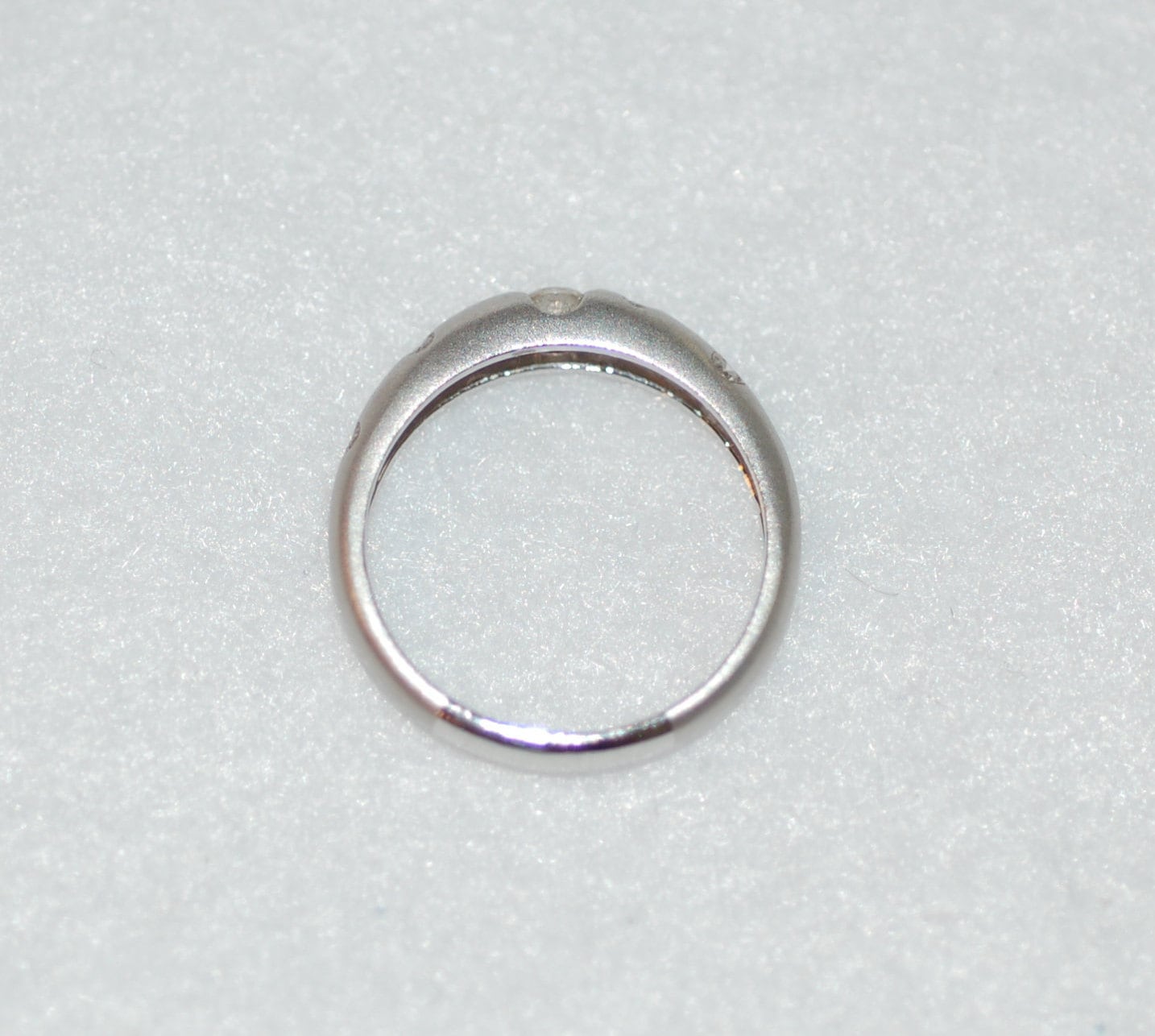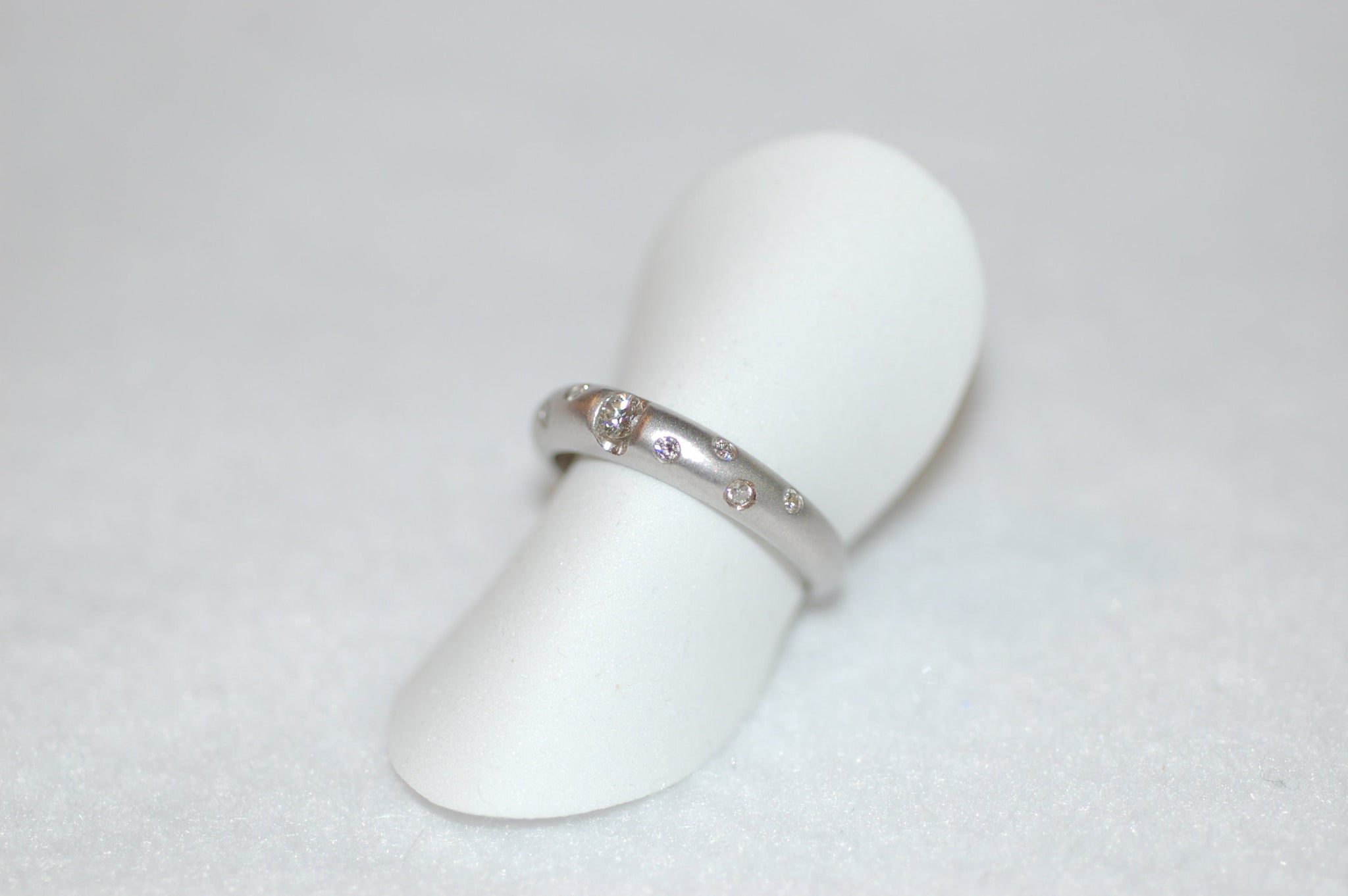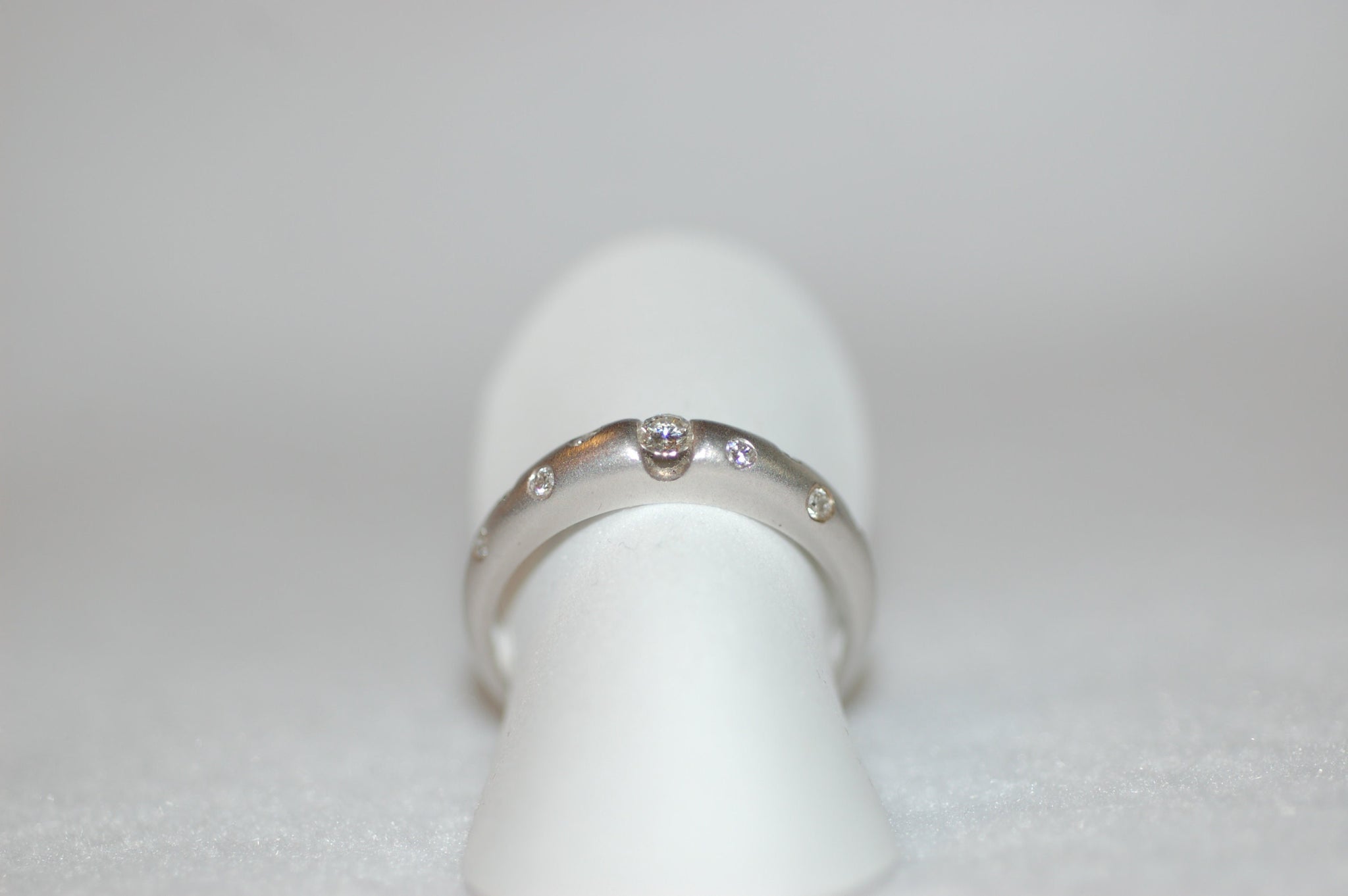 A beautifully .10ct diamond set in a floating setting with four burnish diamond set on either side. The dome shape of the ring will complement any diamond wedding band. A very understated and elegant ring. .10ct dia centers tone, .02ct diam each on the sides, 18K white gold, size 6, can be sized