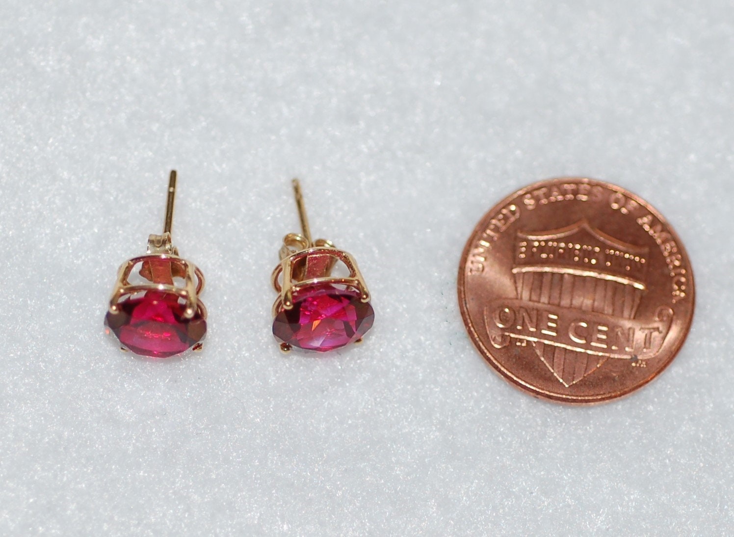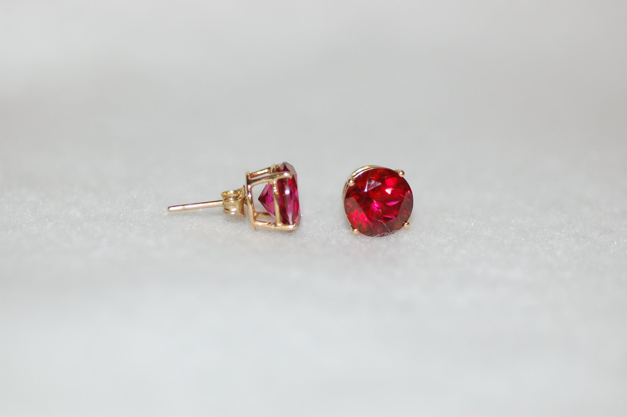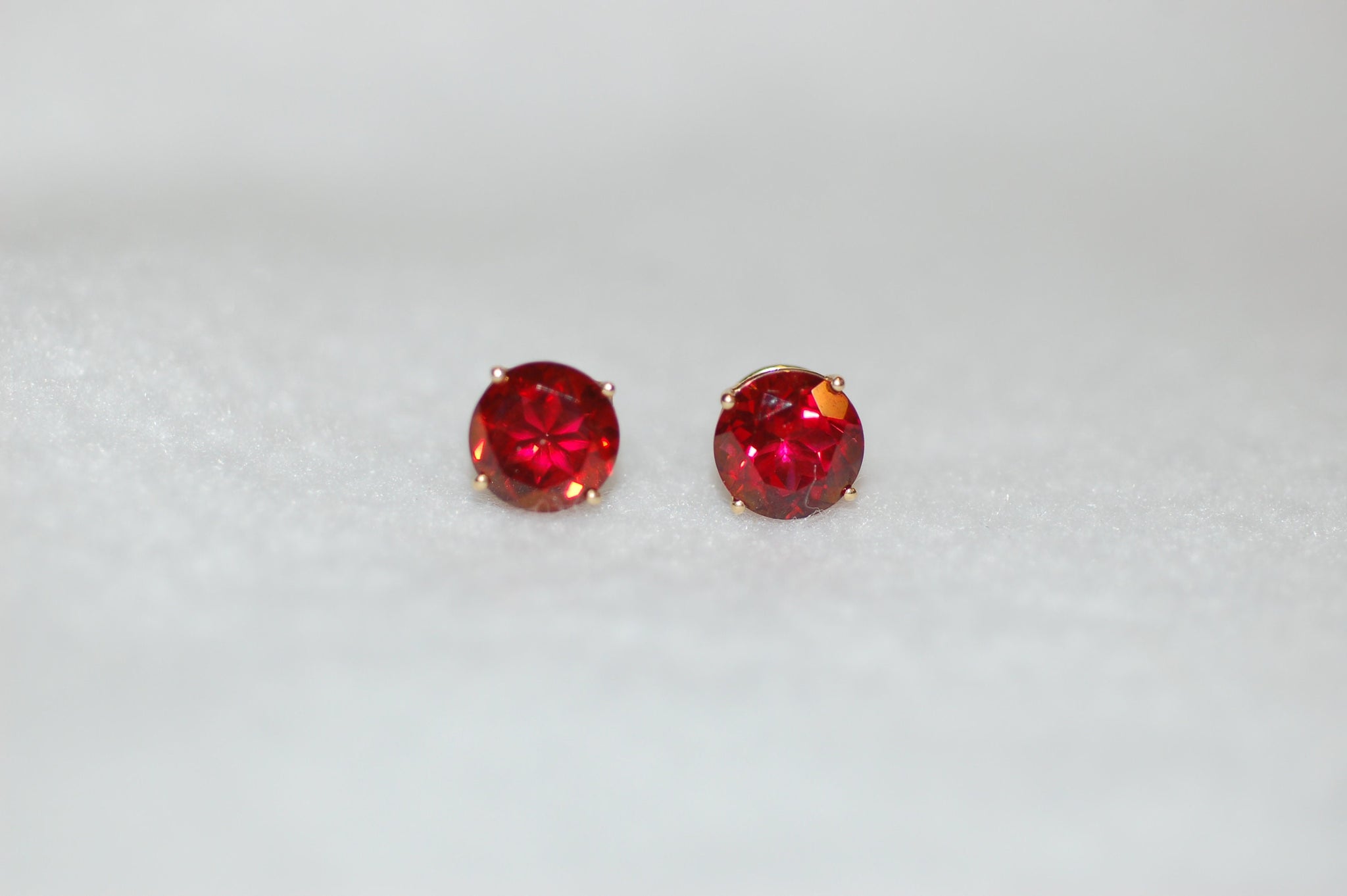 Simple and classic, Garnet Solitaire stud earrings are a timeless perfection. Depending on the light the color fluctuates from fiery red to deep pink. Set in 14K yellow gold.