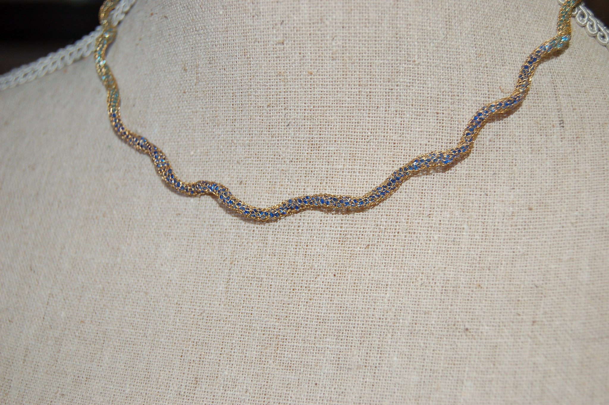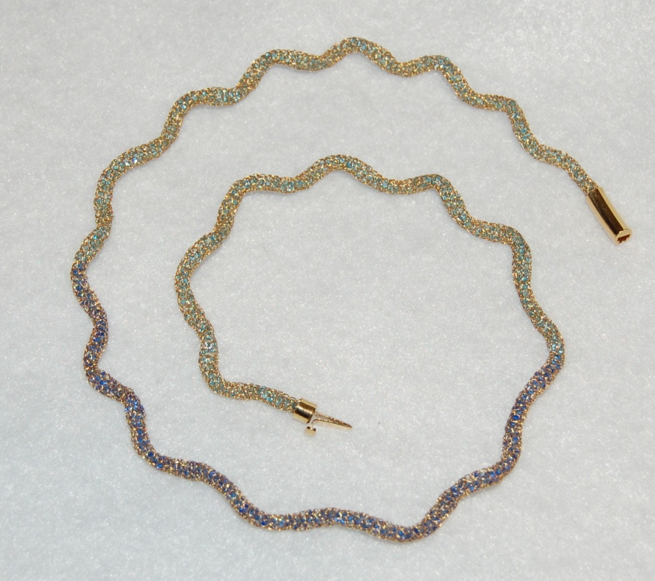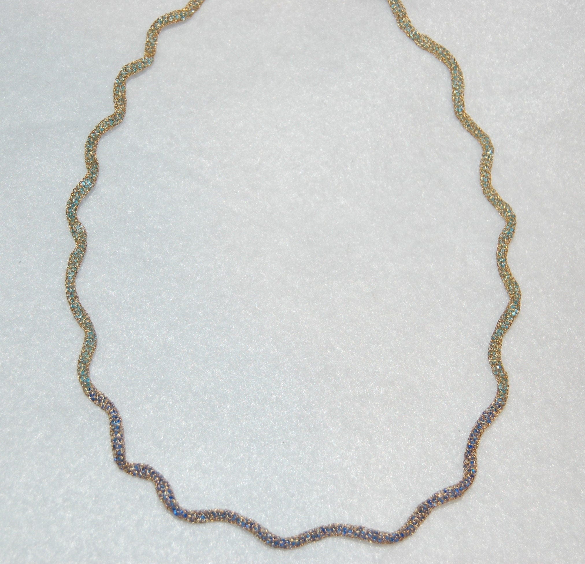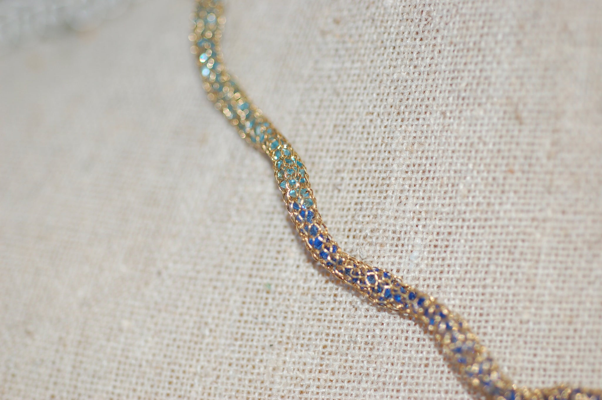 Delicate gold mesh encases green and blue color crystals to great a wave effect necklace. A necklace made for a mermaid! A true one of a kind piece. 14K yellow gold, send message for measurements