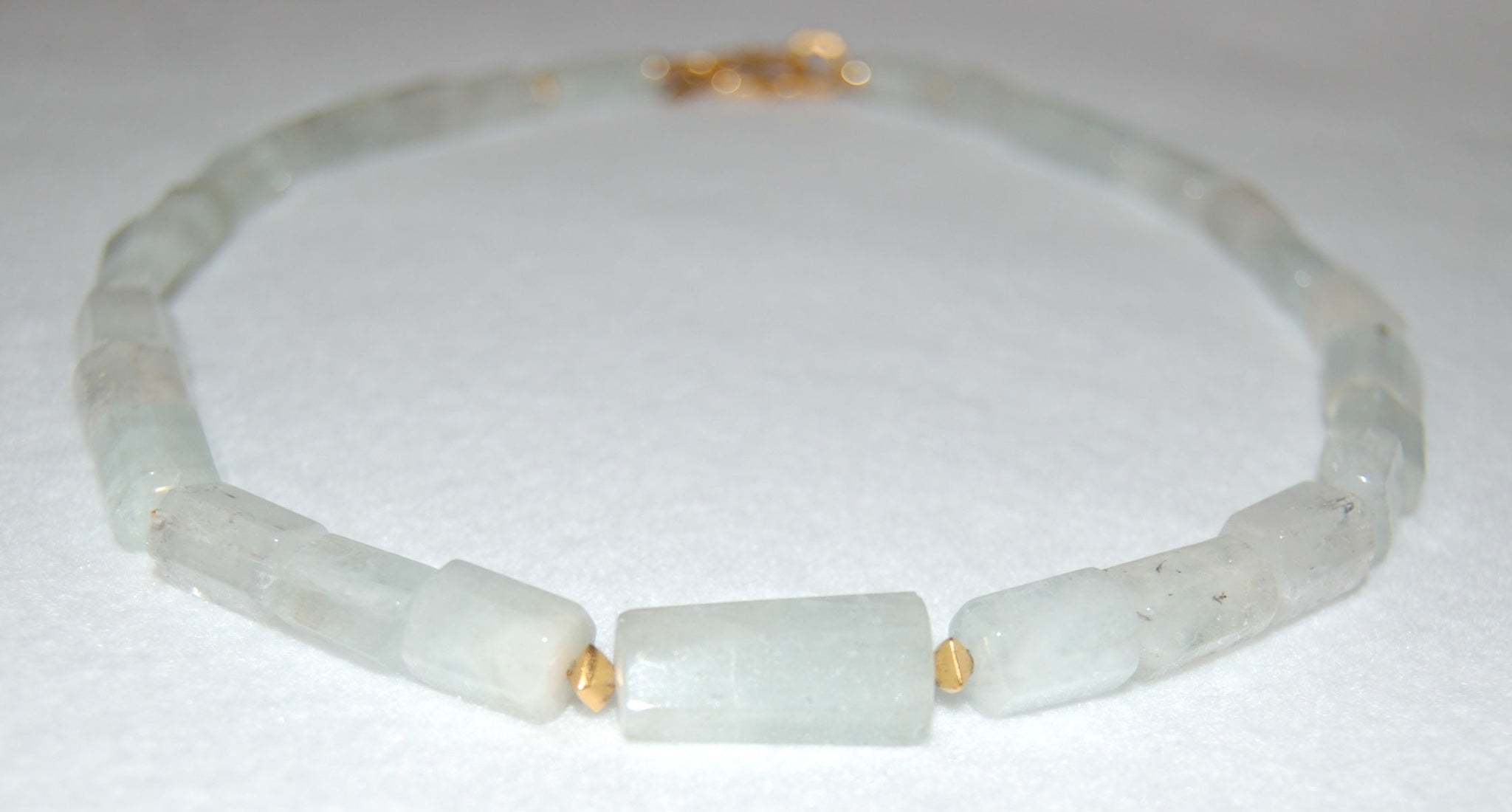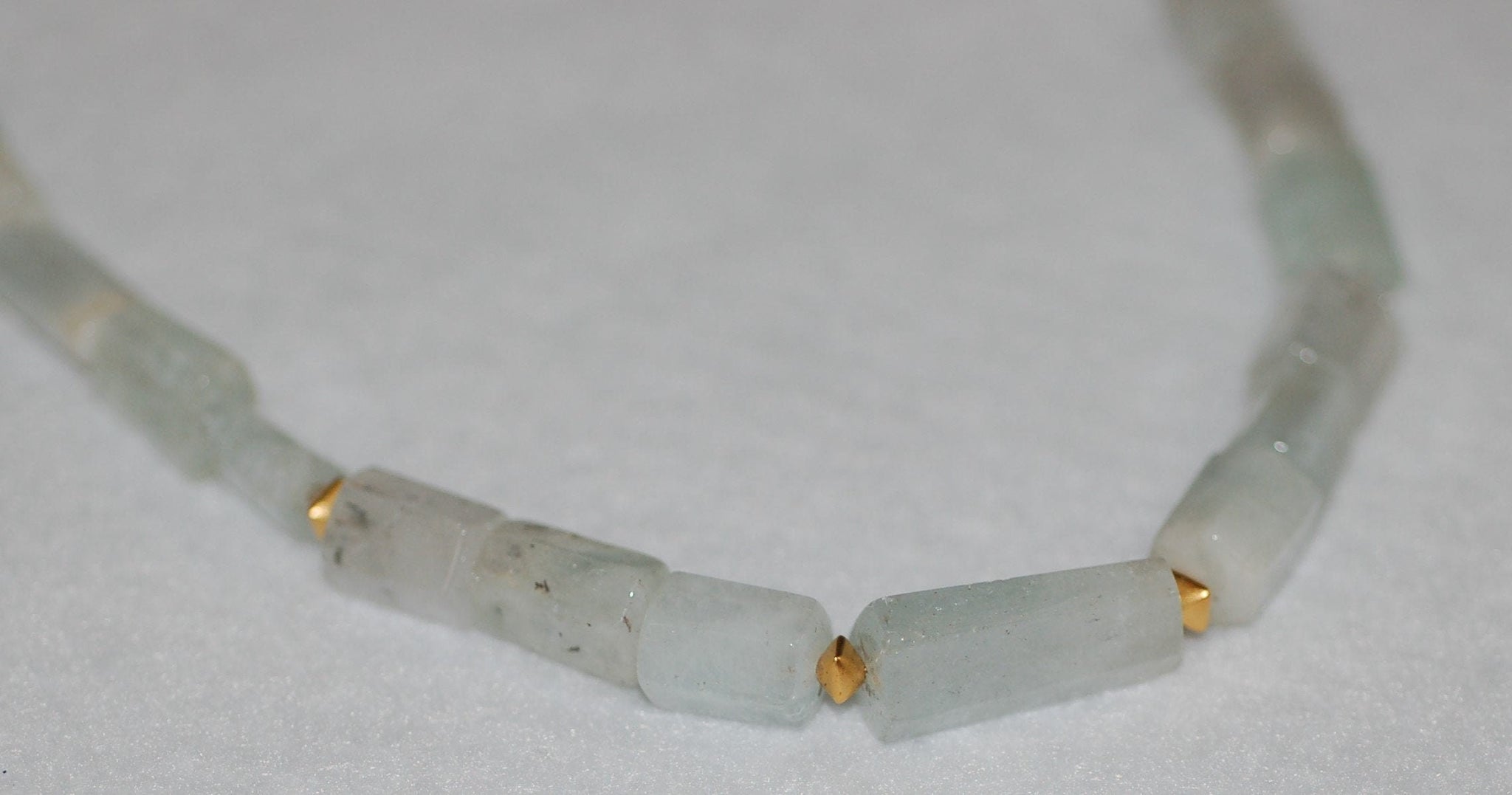 Ancient and modern styles collide in our greek aquamarine necklace. Large faceted rectangular aquamarine stones are paired with gold plated satin geometric beads to create an ancient yet modern look. A timeless design that is perfect for our modern wardrobe! Gold plated hardware, S lock, Approx 18" long