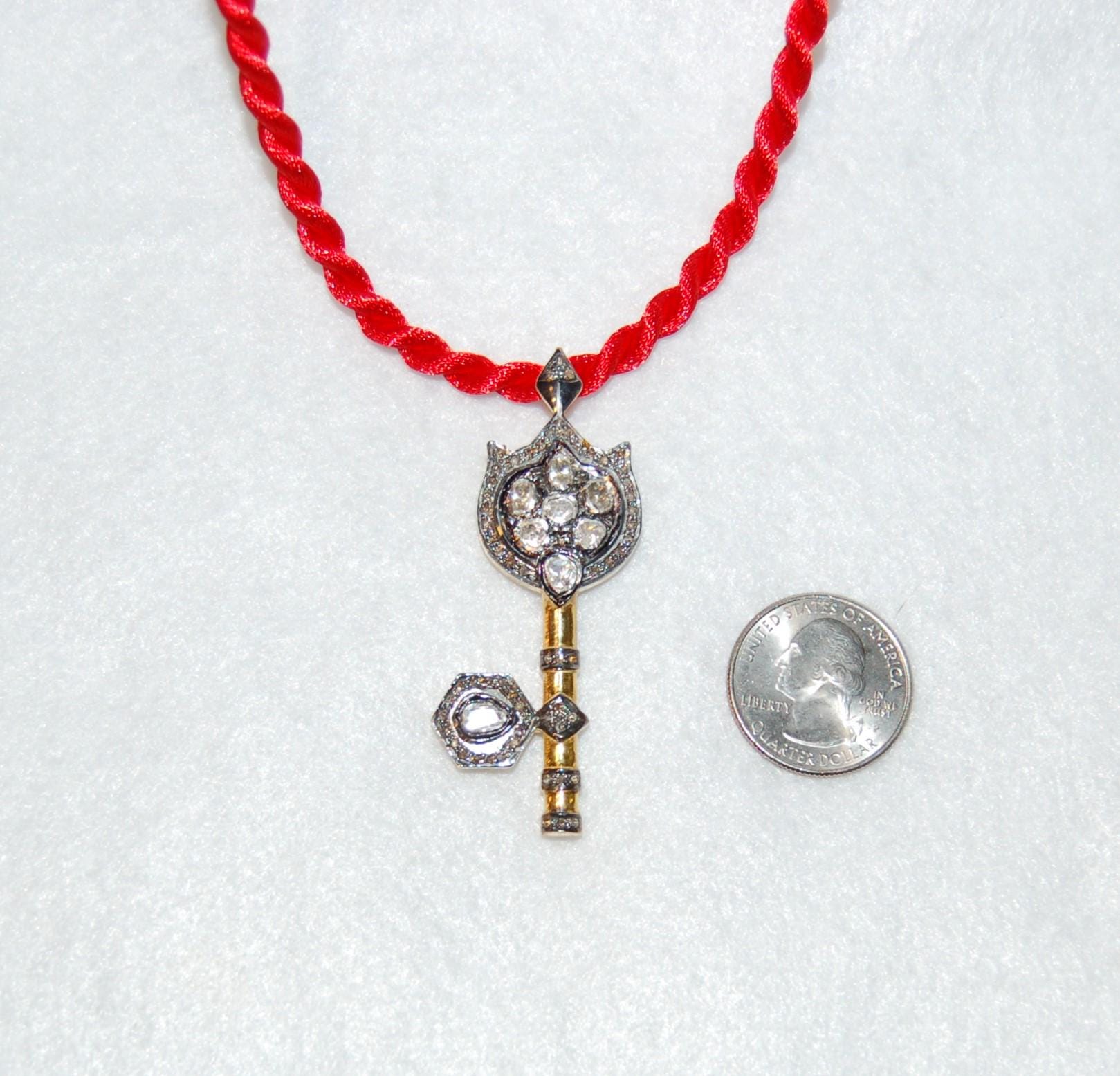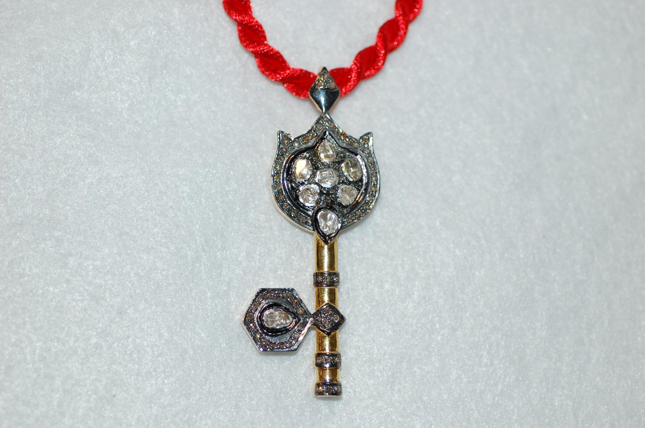 Give the key to your heart to someone special! Rose cut diamonds are set in antiqued silver on the key face. Faceted diamonds outline the top of the key. The back of the key is gold plated to contrast with the antiqued silver. We paired the pendant with a satin cord for a more playful look but it can be worn with any type of chain. Wearable by both men and women. diamonds 2.10cttw, sterling silver, gold plating, rhodium plating. due to the type of diamonds, please note that they will have varying degrees of inclusions and other imperfections which make them of a kind.