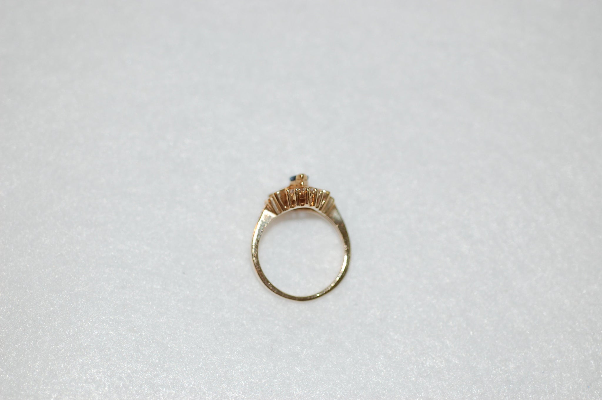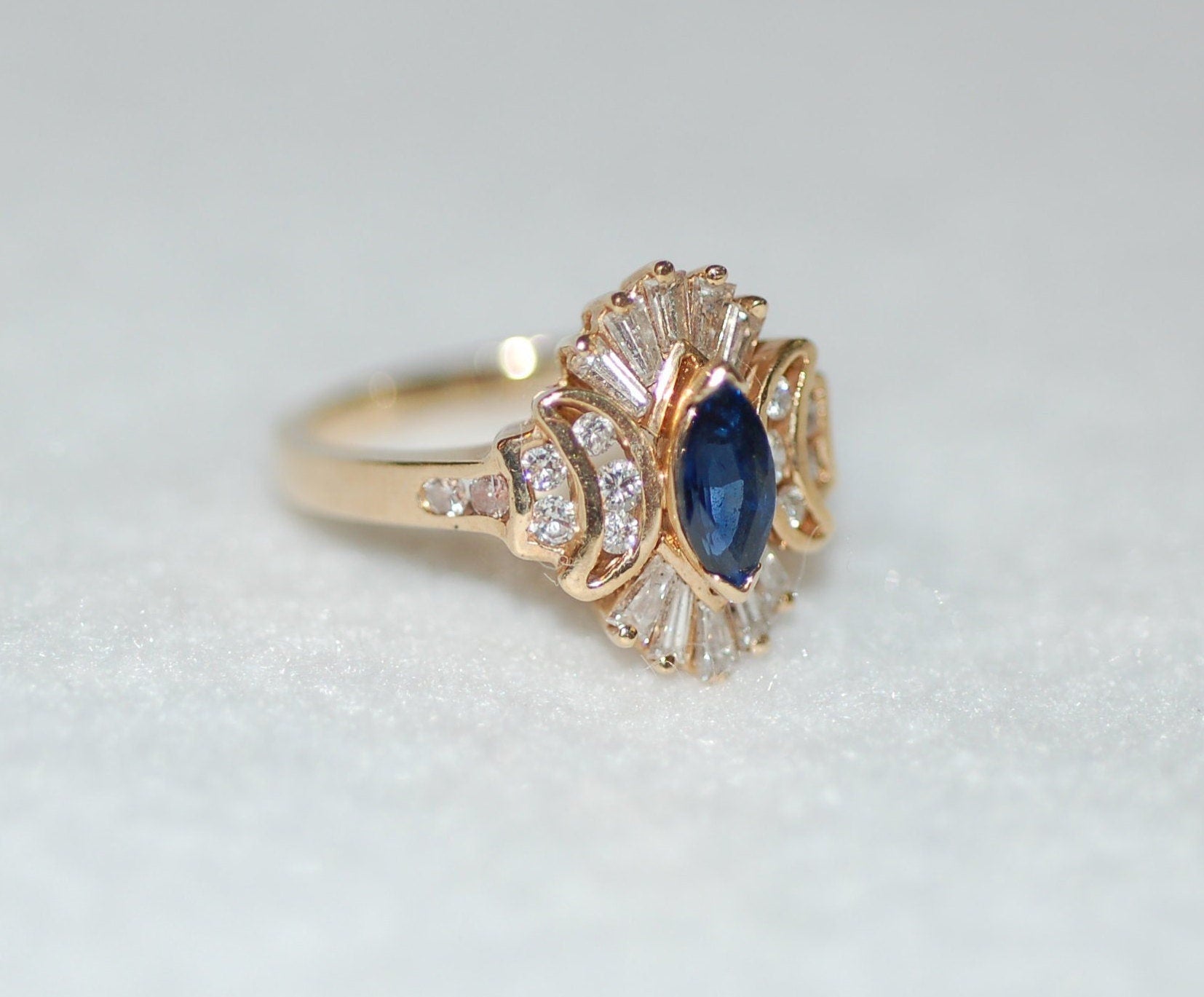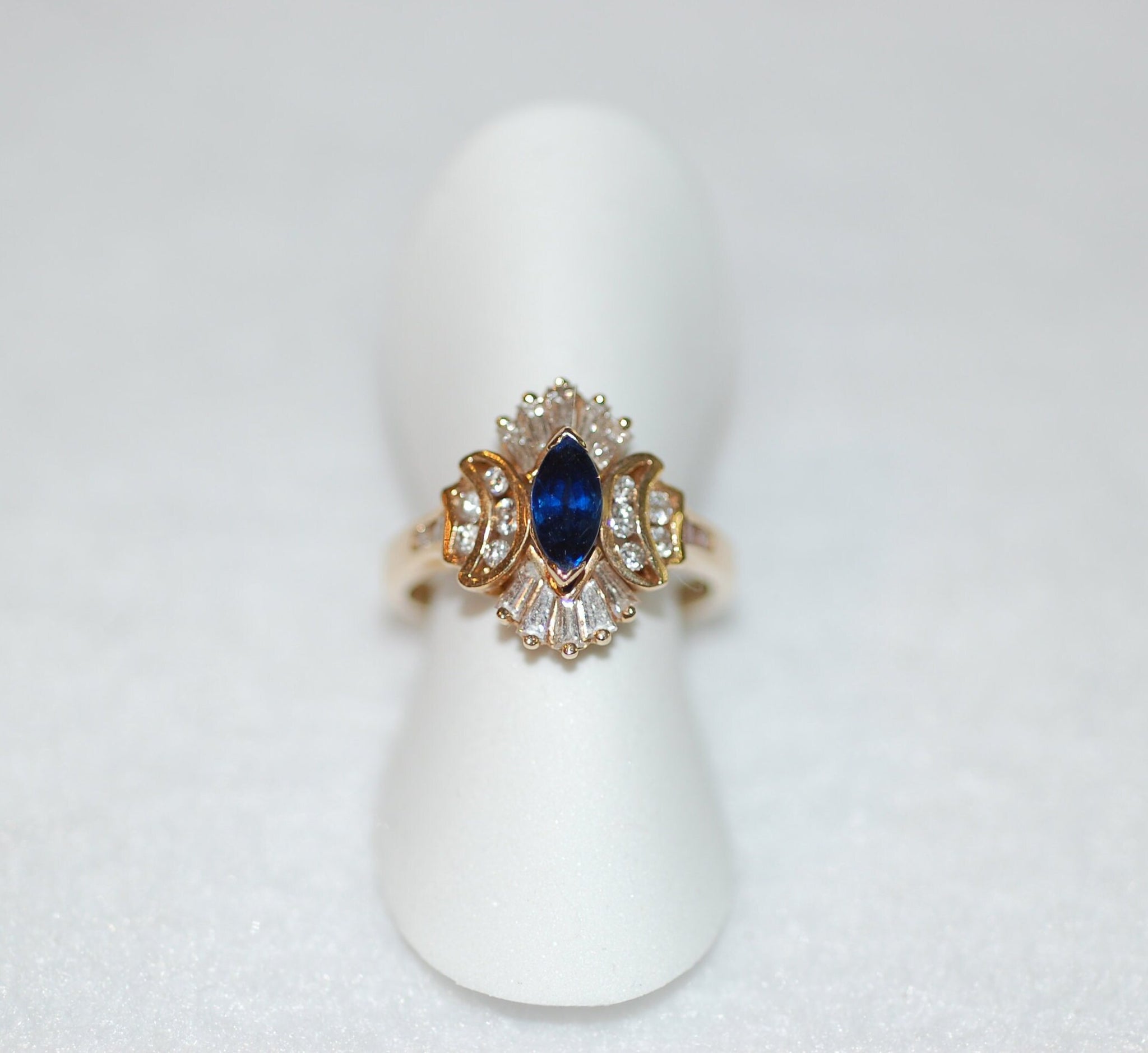 Beautiful ring for a special occasion! A faceted marquis sapphire is surrounded by baguette diamonds on the top and bottom and round diamonds on either sides. A very unique design. Sapphire .50ct, diamonds 1ct, 14k yellow gold, size 5, can be sized. please allow extra week for delivery.