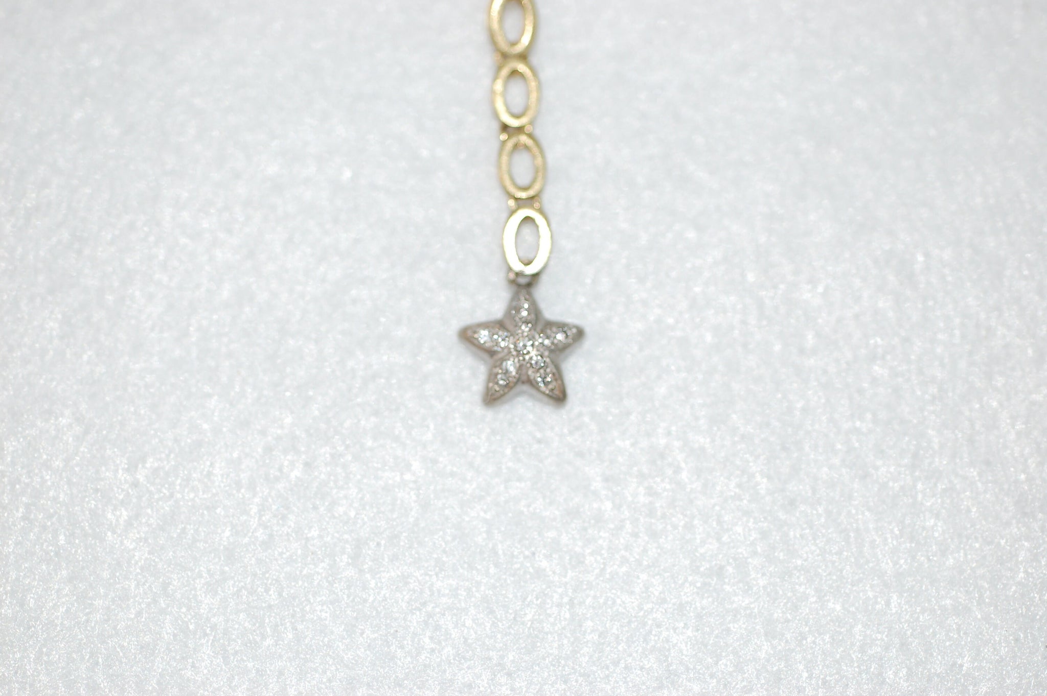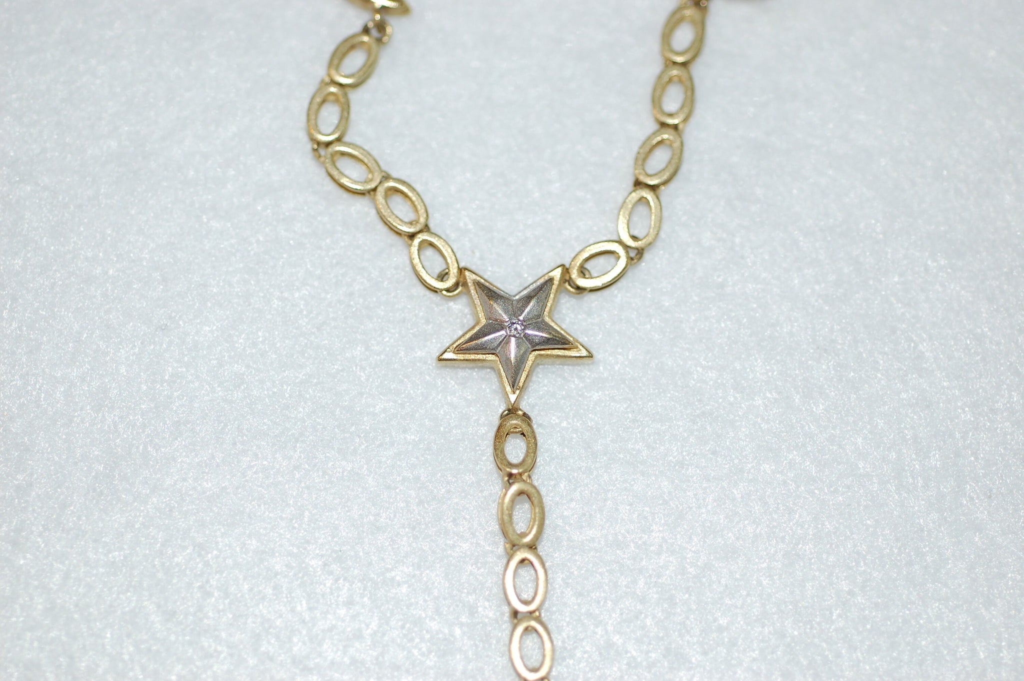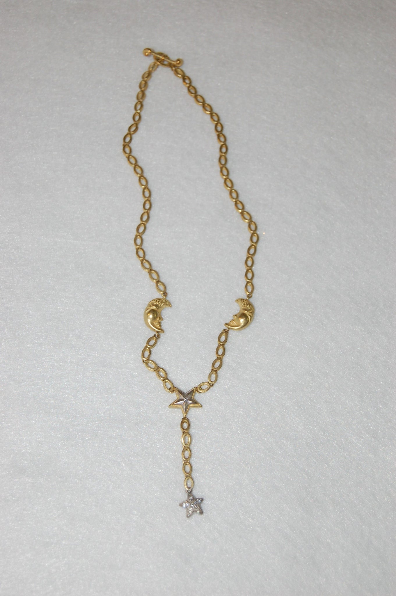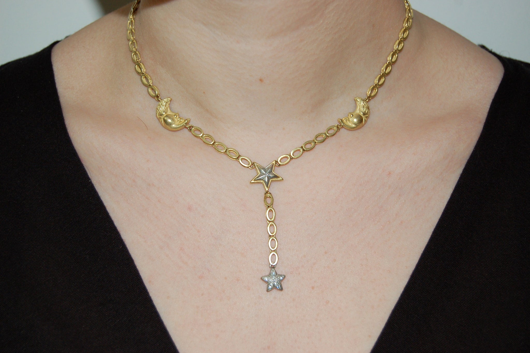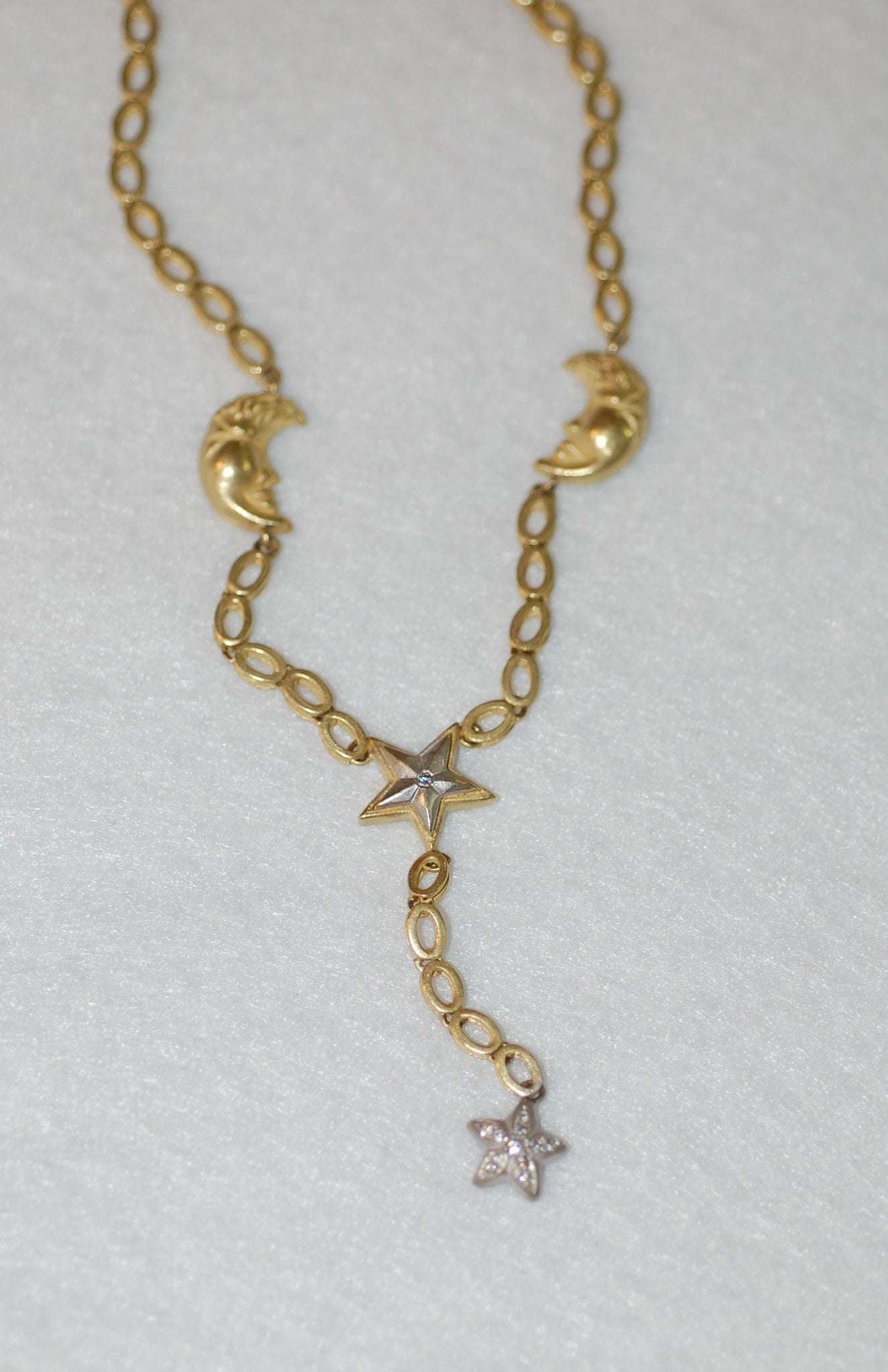 Beautiful moons and pave diamond star Y necklace in yellow and white 18K gold. .15ct diam, designer Trompe L'oeil