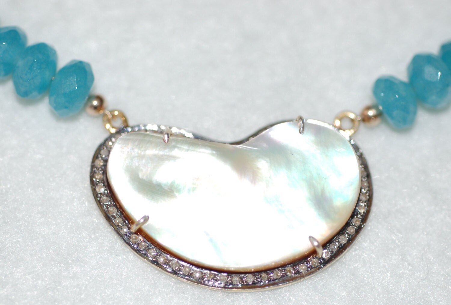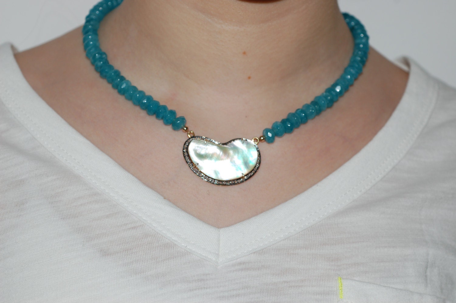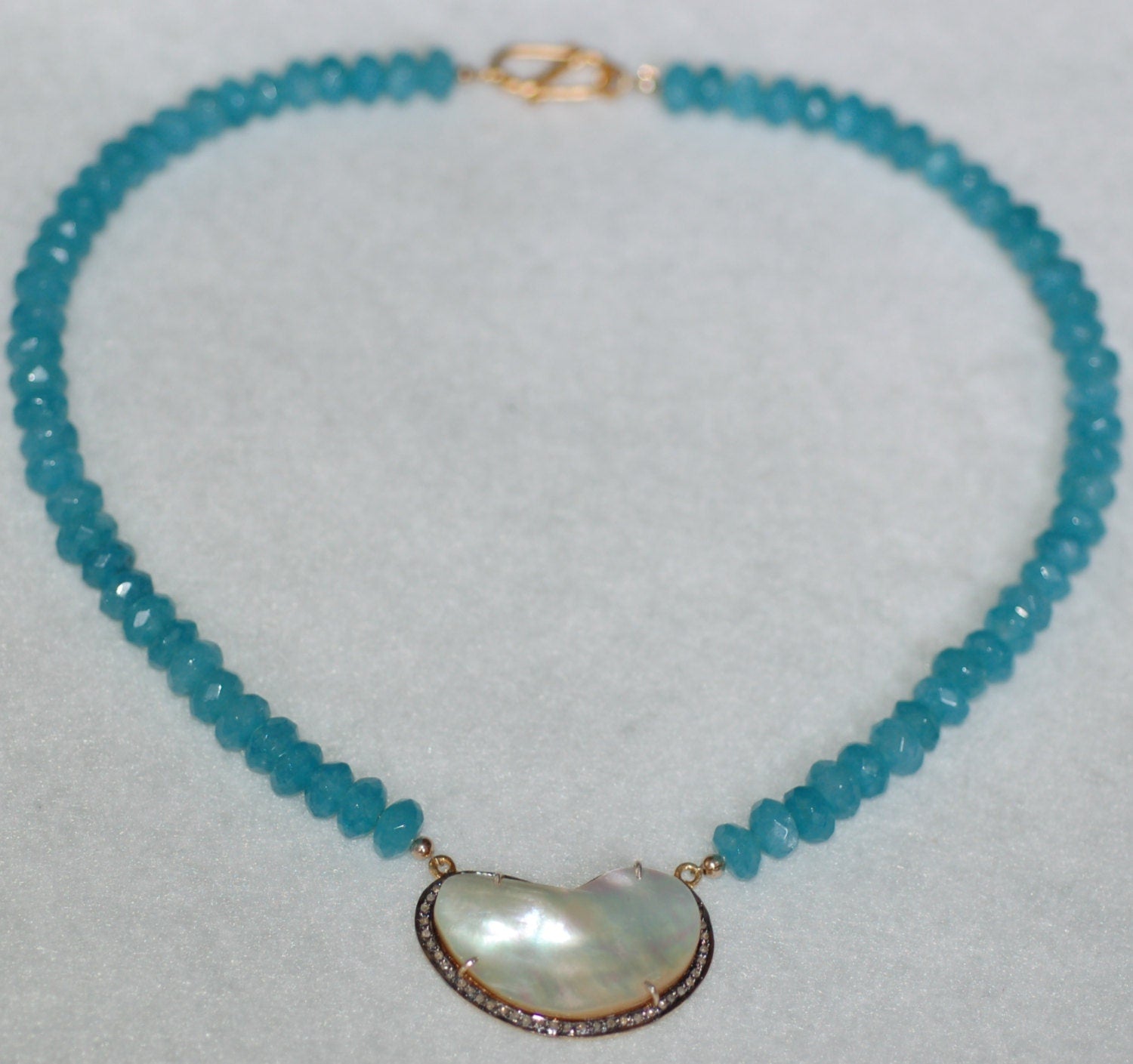The Mother of Pearl is set in silver with rough cut diamonds accents around the setting with a gold plated S lock. The pendant is suspended from blue quartz beads. The natural shape of the mother of pearl and the blue of the beads make you long for a day at the beach. This is a one of a kind piece. Approximately 17” long