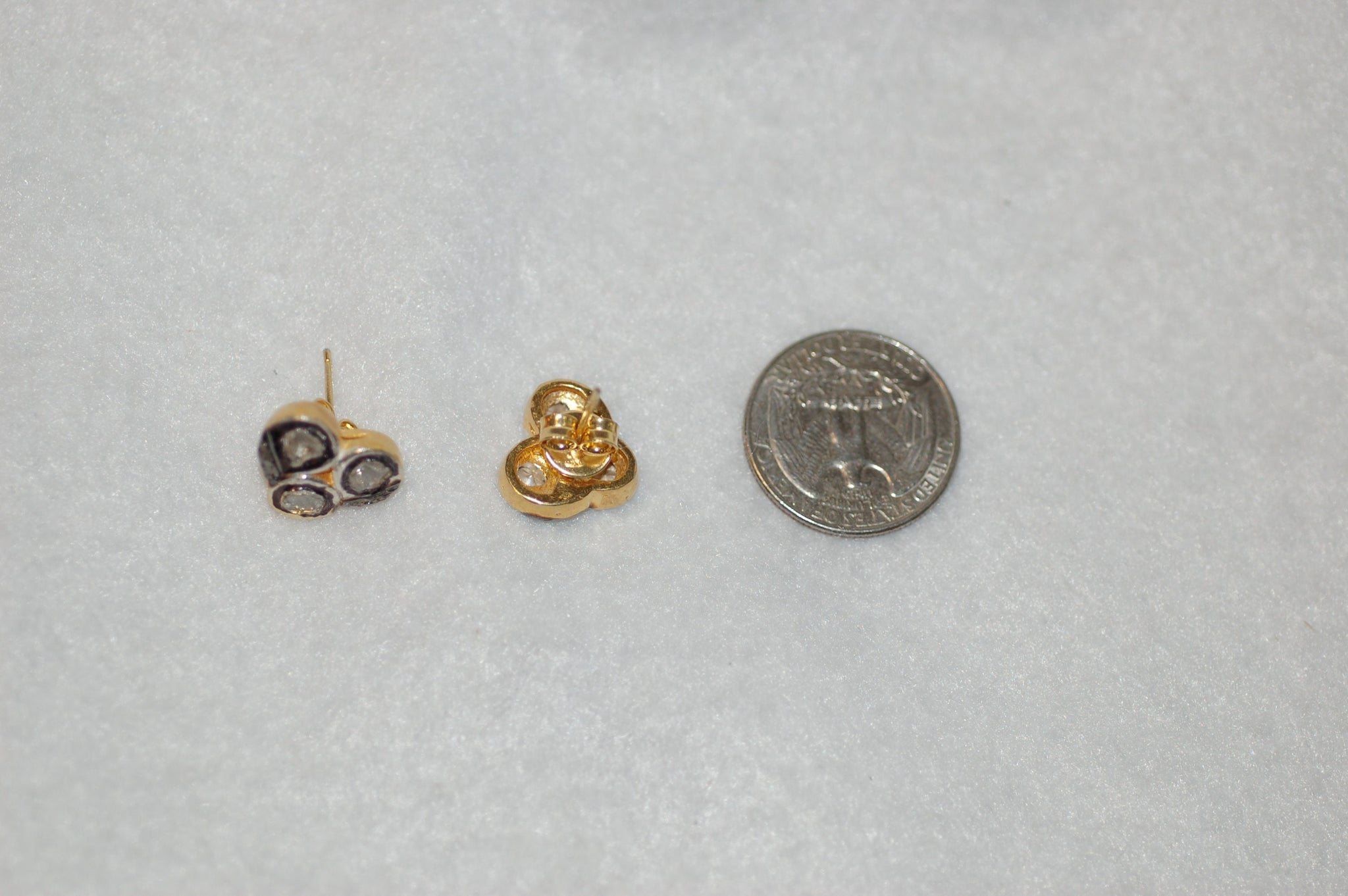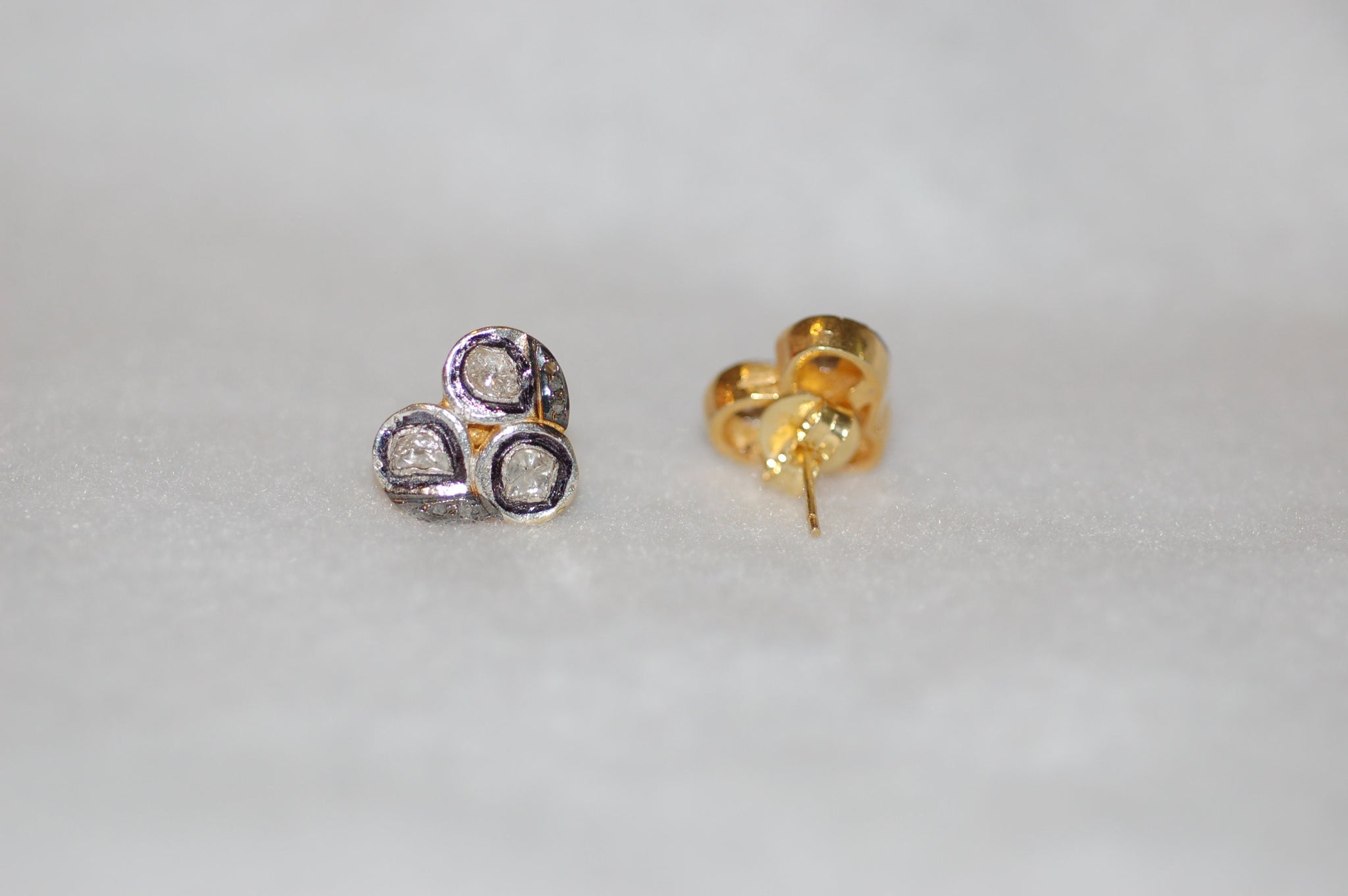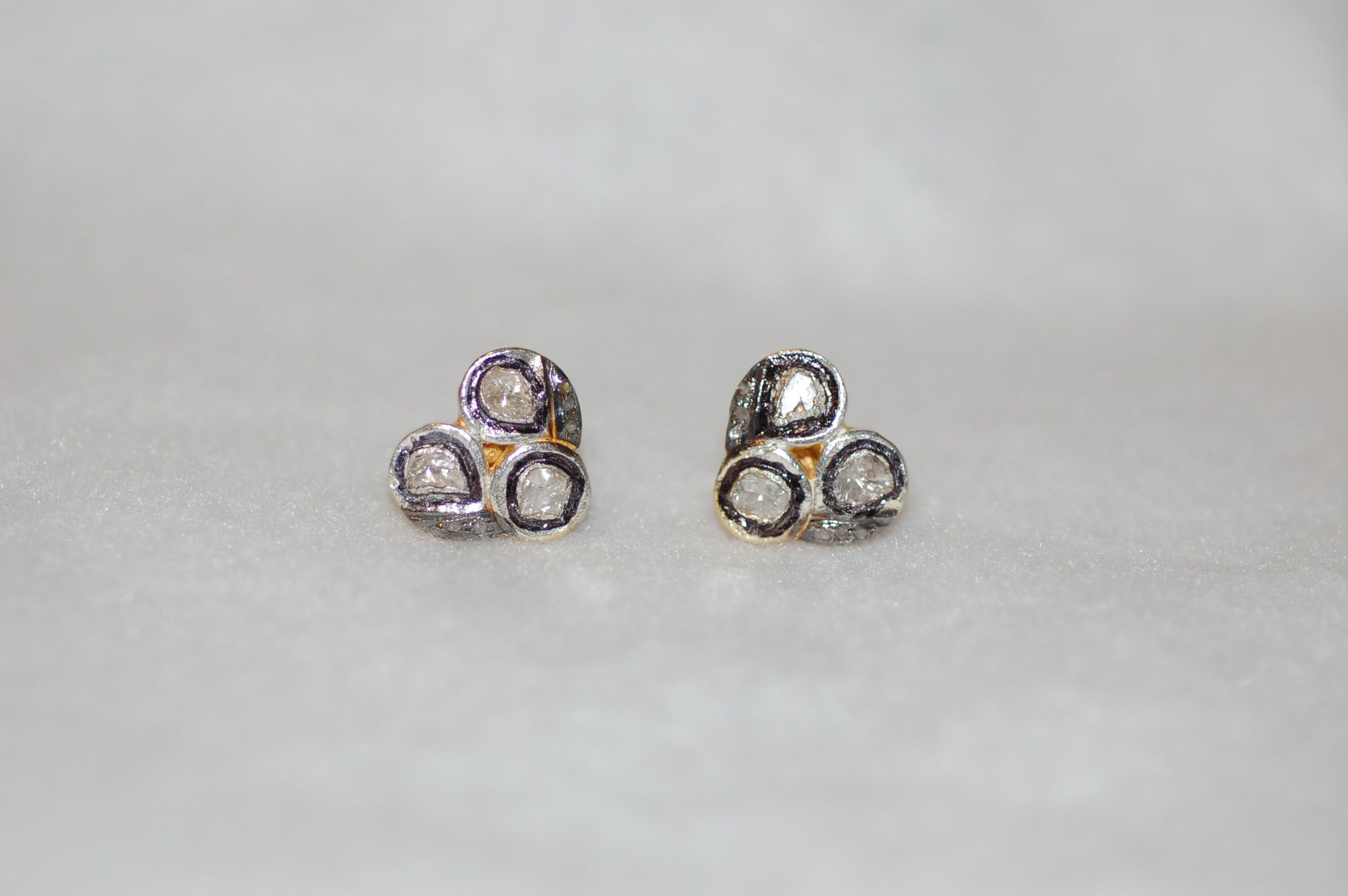These beautiful three stone diamond earrings are made in the Polki style. The diamonds are set in silver with a ring of enamel around them. The backs of the earrings are gold plated. Unique and cute and will be the talk of the party! .95ct tw diamonds, sterling silver, gold plating. due to the type of diamonds, please note that they will have varying degrees of inclusions and other imperfections which make them of a kind.