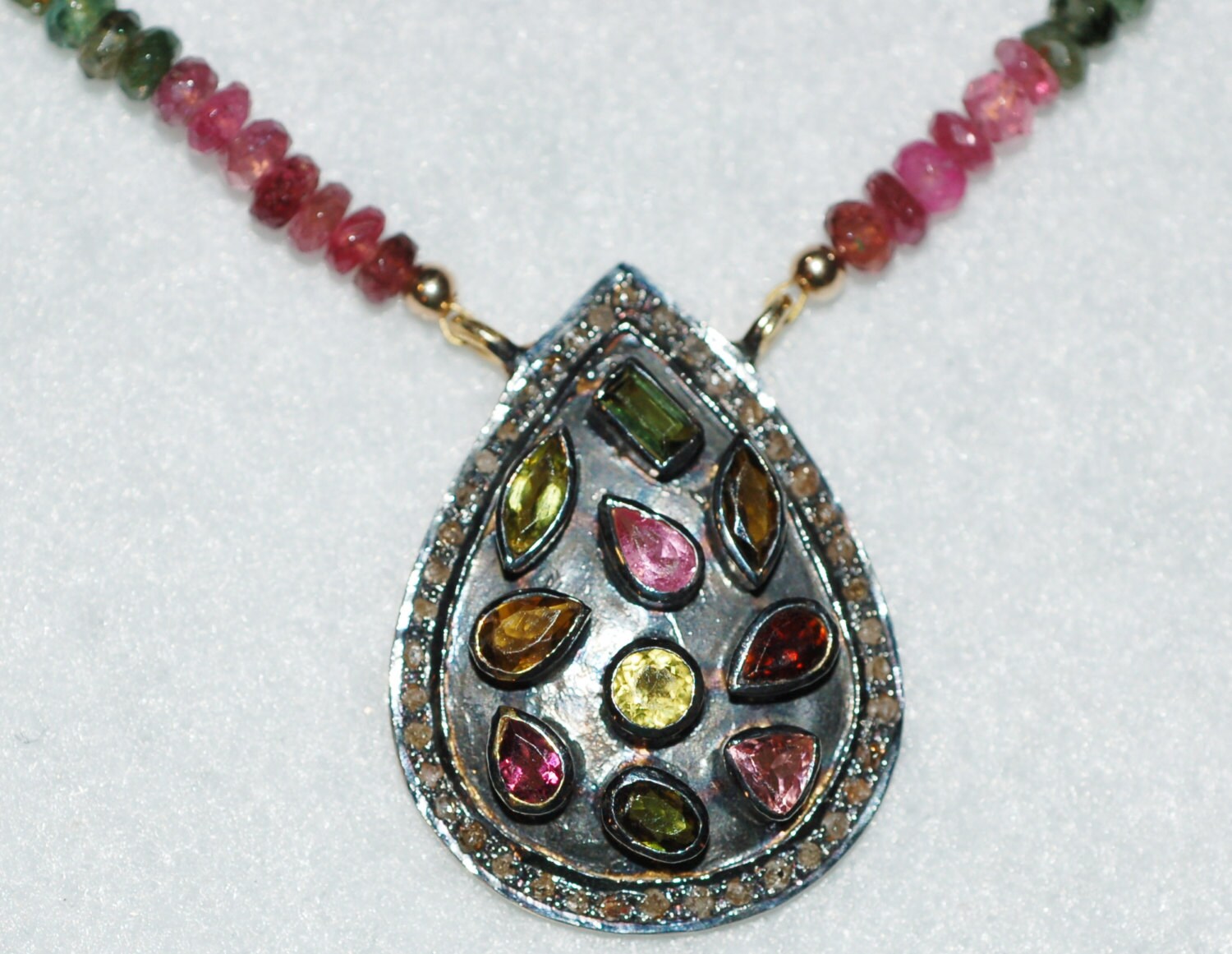 Different shapes of multi color Tourmalines are scattered on this teardrop pendant with rough cut diamonds set in silver. The pendant floats on a string of multi colored Tourmaline beads with a gold plated S clasp. Approximately 18” long